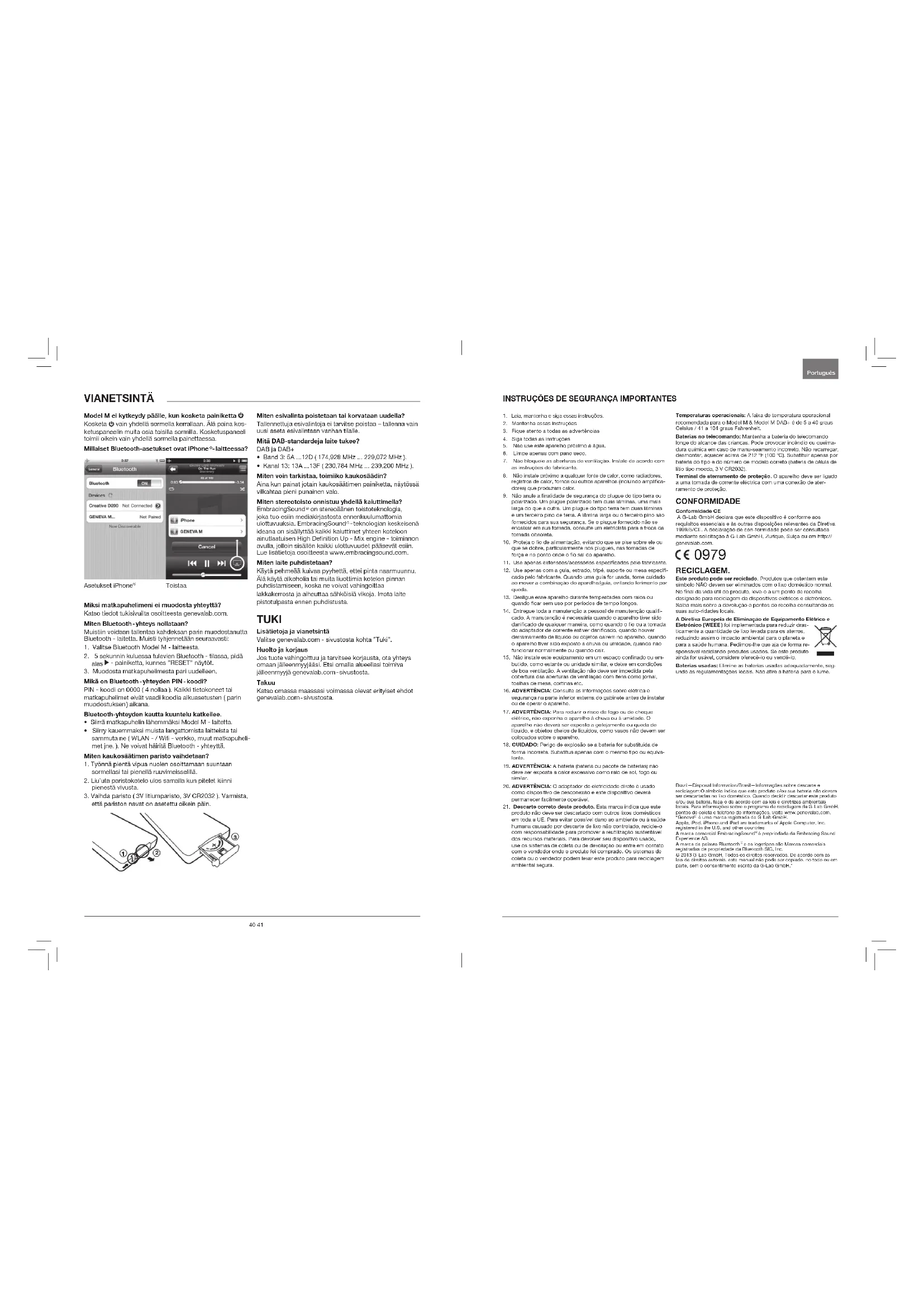 - F ( 230,784 MHz ,200 MHz ).Miten voin tarkistaa, toimiiko kaukosäädin?Aina kun painat jotain kaukosäätimen painiketta, näytössä vilkahtaa pieni punainen valo.Miten stereotoisto onnistuu yhdellä kaiuttimella?EmbracingSound on stereoäänen toistoteknologia, joka tuo esiin mediakirjastosta ennenkuulumattomia ulottuvuuksia. EmbracingSound - teknologian keskeisenä ideana on sisällyttää kaikki kaiuttimet yhteen koteloon ainutlaatuisen High Denition Up - Mix engine - toiminnon avulla, jolloin sisällön kaikki ulottuvuudet pääsevät esiin. Lue lisätietoja osoitteesta www.embracingsound.com.Miten laite puhdistetaan?Käytä pehmeää kuivaa pyyhettä, ettei pinta naarmuunnu. Älä käytä alkoholia tai muita liuottimia kotelon pinnan puhdistamiseen, koska ne voivat vahingoittaa lakkakerrosta ja aiheuttaa sähköisiä vikoja. Irrota laite pistotulpasta ennen puhdistusta. TUKI Lisätietoja ja vianetsintäValitse genevalab.com - sivustosta kohta ”Tuki”.Huolto ja korjausJos tuote vahingoittuu ja tarvitsee korjausta, ota yhteys omaan jälleenmyyjääsi. Etsi omalla alueellasi toimiva jälleenmyyjä genevalab.com - sivustosta.TakuuKatso omassa maassasi voimassa olevat erityiset ehdot genevalab.com - sivustosta. VIANETSINTÄ 1. Leia, mantenha e siga essas instruções.2. Mantenha essas instruções3. Fique atento a todas as advertências4. Siga todas as instruções5. Não use este aparelho próximo à água.6. Limpe apenas com pano seco.7. Não bloqueie as aberturas de ventilação. Instale de acordo com as instruções do fabricante.8. Não instale próximo a qualquer fonte de calor, como radiadores, registros de calor, fornos ou outros aparelhos (incluindo amplica-dores) que produzam calor.9. Não anule a nalidade de segurança do plugue do tipo terra ou polarizado. Um plugue polarizado tem duas lâminas, uma mais larga do que a outra. Um plugue do tipo terra tem duas lâminas e um terceiro pino de terra. A lâmina larga ou o terceiro pino são fornecidos para sua segurança. Se o plugue fornecido não se encaixar em sua tomada, consulte um eletricista para a troca da tomada obsoleta.10. Proteja o o de alimentação, evitando que se pise sobre ele ou que se dobre, particularmente nos plugues, nas tomadas de força e no ponto onde o o sai do aparelho.11. Use apenas extensões/acessórios especicados pelo fabricante.12. Use apenas com a guia, estrado, tripé, suporte ou mesa especi-cado pelo fabricante. Quando uma guia for usada, tome cuidado ao mover a combinação do aparelho/guia, evitando ferimento por queda. 13. Desligue esse aparelho durante tempestades com raios ou quando car sem uso por períodos de tempo longos.14. Entregue toda a manutenção a pessoal de manutenção quali-cado. A manutenção é necessária quando o aparelho tiver sido danicado de qualquer maneira, como quando o o ou a tomada do adaptador de corrente estiver danicado, quando houver derramamento de líquido ou objetos caírem no aparelho, quando o aparelho tiver sido exposto a chuva ou umidade, quando não funcionar normalmente ou quando cair.15. Não instale este equipamento em um espaço connado ou em-butido, como estante ou unidade similar, e deixe em condições de boa ventilação. A ventilação não deve ser impedida pela cobertura das aberturas de ventilação com itens como jornal, toalhas de mesa, cortinas etc.16. ADVERTÊNCIA: Consulte as informações sobre elétrica e segurança na parte inferior externa do gabinete antes de instalar ou de operar o aparelho.17. ADVERTÊNCIA: Para reduzir o risco de fogo ou de choque elétrico, não exponha o aparelho à chuva ou à umidade. O aparelho não deverá ser exposto a gotejamento ou queda de líquido, e objetos cheios de líquidos, como vasos não devem ser colocados sobre o aparelho.18. CUIDADO: Perigo de explosão se a bateria for substituída de forma incorreta. Substitua apenas com o mesmo tipo ou equiva-lente.19. ADVERTÊNCIA: A bateria (bateria ou pacote de baterias) não deve ser exposta a calor excessivo como raio de sol, fogo ou similar.20. ADVERTÊNCIA: O adaptador de eletricidade direto é usado como dispositivo de desconexão e este dispositivo deverá permanecer facilmente operável.21. Descarte correto deste produto. Esta marca indica que este produto não deve ser descartado com outros lixos domésticos em toda a UE. Para evitar possível dano ao ambiente ou à saúde humana causado por descarte de lixo não controlado, recicle-o com responsabilidade para promover a reutilização sustentável dos recursos materiais. Para devolver seu dispositivo usado, use os sistemas de coleta ou de devolução ou entre em contato com o vendedor onde o produto foi comprado. Os sistemas de coleta ou o vendedor podem levar este produto para reciclagem ambiental segura.Temperaturas operacionais: A faixa de temperatura operacional recomendada para o Model M & Model M DAB+ é de 5 a 40 graus Celsius / 41 a 104 graus Fahrenheit.Baterias no telecomando: Mantenha a bateria do telecomando longe do alcance das crianças. Pode provocar incêndio ou queima-dura química em caso de manu-seamento incorreto. Não recarregar, desmontar, aquecer acima de 212 ºF (100 ºC). Substituir apenas por bateria do tipo e do número de modelo correto (bateria de célula de lítio tipo moeda, 3 V CR2032).Terminal de aterramento de proteção. O aparelho deve ser ligado a uma tomada de corrente eléctrica com uma conexão de ater-ramento de proteção. CONFORMIDADE Conformidade CE A G-Lab GmbH declara que este dispositivo é conforme aos requisitos essenciais e às outras disposições relevantes da Diretiva 1999/5/CE. A declaração de con-formidade pode ser consultada mediante solicitação à G-Lab GmbH, Zurique, Suíça ou em http://genevalab.com. p. 239