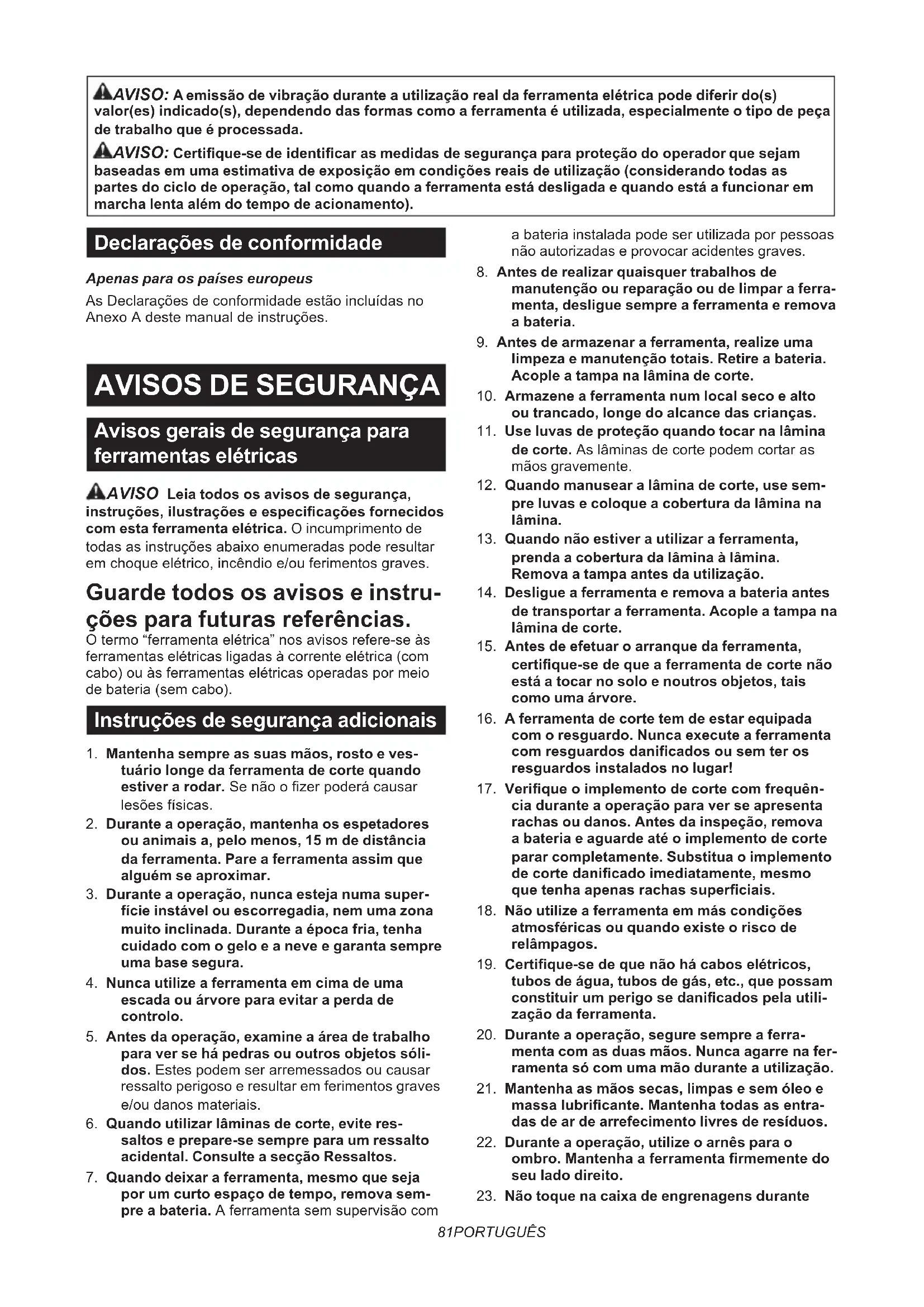 AVISO: Certifique-se sempre de que a ferramenta está desligada e que a bateria foi removida antes de efetuar quaisquer lavorhos na ferramenta. Não desligar a ferramenta e não removea bateria pode resultar em ferimentos pessoas graves devido a arranque acidental.