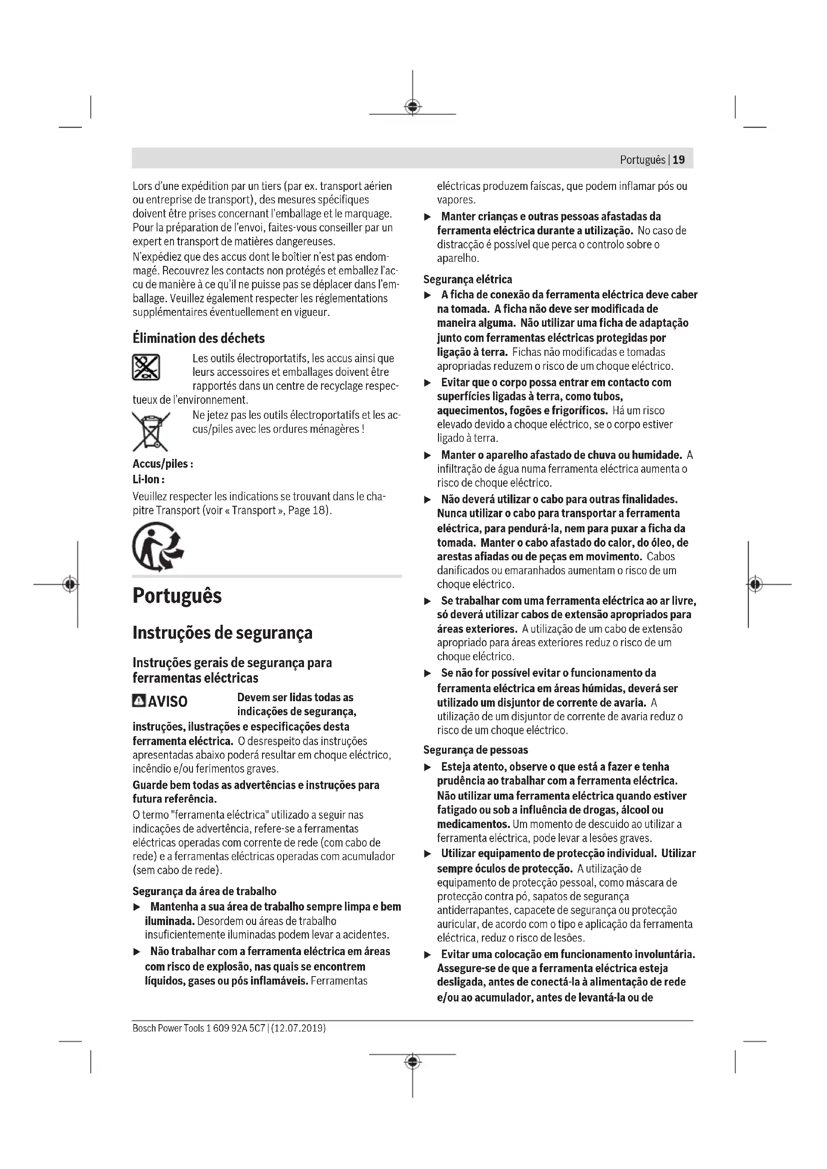 1,5 O nível de vibrações indicado nestas instruções e o valor de emissões sonoras foram medidos de acordo com um processo de medição normalizado e podem ser utilizados para a comparação de ferramentas elétricas. Também são adequados para uma avaliação provisória das emissões sonoras e de vibrações. O nível de vibrações indicado e o valor de emissões sonoras representam as aplicações principais da ferramenta elétrica. Se a ferramenta elétrica for utilizada para outras aplicações, com outras ferramentas de trabalho ou com manutenção insuficiente, é possível que o nível de vibrações e de emissões sonoras seja diferente. Isto pode aumentar sensivelmente a emissão sonora e de vibrações para o período completo de trabalho. Para uma estimação exata da emissão sonora e de vibrações, também deveriam ser considerados os períodos nos quais o aparelho está desligado ou funciona, mas não está sendo utilizado. Isto pode reduzir a emissão sonora e de vibrações durante o completo período de trabalho. Além disso também deverão ser estipuladas medidas de segurança para proteger o operador contra o efeito de vibrações, como por exemplo: manutenção de ferramentas elétricas e acessórios, manter as mãos quentes e organização dos processos de trabalho. Montagem u A bateria deverá ser retirada antes de todos os trabalhos na ferramenta elétrica (p. ex. manutenção, troca de ferramenta etc.) e antes de transportar ou de armazenar a mesma. Há perigo de ferimentos se o interruptor de ligar/desligar for acionado involuntariamente. Carregar a bateria u Utilize apenas os carregadores listados nos dados técnicos. Só estes carregadores são apropriados para os baterias de lítio utilizadas para a sua ferramenta elétrica. Nota: A bateria é fornecida parcialmente carregada. Para assegurar a completa potência da bateria, a bateria deverá ser carregada completamente no carregador antes da primeira utilização. A bateria de lítio pode ser carregada a qualquer altura, sem que a sua vida útil seja reduzida. Uma interrupção do processo de carga não danifica a bateria. O acumulador de iões de lítio está protegido contra descarga completa pelo sistema "Electronic Cell Protection (ECP)". A ferramenta elétrica é desligada através de um disjuntor de proteção, logo que o acumulador estiver descarregado. A ferramenta de trabalho não se movimenta mais. Observe as indicações sobre a eliminação de forma ecológica. Retirar a bateria A bateria (7) possui dois níveis de travamento, que devem evitar, que a bateria caia, caso a tecla de desbloqueio (8) seja premida por acaso. Enquanto a bateria estiver dentro da ferramenta elétrica, ela é mantido em posição por uma mola. Para retirar a bateria (7) pressione a tecla de desbloqueio (8) e puxe a bateria para a retirar da ferramenta elétrica. Não empregar força. Indicador do nível de carga da bateria Os LEDs verdes do indicador do nível de carga da bateria(14) indicam o nível de carga da bateria(7). Por motivos de segurança, a consulta do nível de carga só é possível com a ferramenta elétrica parada. Prima a tecla indicador do nível de carga (15), para visualizar o nível de carga. Isto também é possível com a bateria removida. Se depois de premir a tecla indicador do nível de carga (15) não se acender qualquer LED, a bateria tem defeito e tem de ser substituída. Tipo de bateria GBA 18V... (ver figura D1) LEDs Capacidade Luz permanente 3× verde 60−100% Luz permanente 2× verde 30−60% Luz permanente 1× verde 5−30% Luz intermitente 3× verde 0−5% Tipo de bateria ProCORE18V... (ver figura D2) LEDs Capacidade Luz permanente 5× verde 80−100% Luz permanente 4× verde 60−80% Luz permanente 3× verde 40−60% Luz permanente 2× verde 20−40% Luz permanente 1× verde 5−20% Luz intermitente 1× verde 0−5% Troca de ferramenta (ver figura A) u A bateria deverá ser retirada antes de todos os trabalhos na ferramenta elétrica (p. ex. manutenção, troca de ferramenta etc.) e antes de transportar ou de armazenar a mesma. Há perigo de ferimentos se o interruptor de ligar/desligar for acionado involuntariamente. Com o interruptor de ligar/desligar não pressionado (11) é fixado o veio de perfuração. Isto possibilita uma troca rápida, confortável e fácil da ferramenta de trabalho no mandril de brocas. Abra a bucha de aperto rápido (2) rodando no sentido ➊ até a ferramenta poder ser inserida. Introduzir a ferramenta. Bosch Power Tools 1 609 92A 5C7 | (12.07.2019)24 | Português Aperte bem à mão a bucha da bucha de aperto rápido (2) no sentido de rotação ➋. A bucha fica assim automaticamente bloqueada. Aspiração de pó/de aparas Pós de materiais como por exemplo, tintas que contém chumbo, alguns tipos de madeira, minerais e metais, podem ser nocivos à saúde. O contacto ou a inalação dos pós pode provocar reações alérgicas e/ou doenças nas vias respiratórias do utilizador ou das pessoas que se encontrem por perto. Certos pós, como por exemplo pó de carvalho e faia são considerados como sendo cancerígenos, especialmente quando juntos com substâncias para o tratamento de madeiras (cromato, preservadores de madeira). Material que contém asbesto só deve ser processado por pessoal especializado. – Assegurar uma boa ventilação do local de trabalho. – É recomendável usar uma máscara de proteção respiratória com filtro da classe P2. Observe as diretivas para os materiais a serem processados, vigentes no seu país. u Evite a acumulação de pó no local de trabalho. Pós podem entrar levemente em ignição. Funcionamento Colocação em funcionamento Colocar a bateria Nota: A utilização de baterias não indicadas para a sua ferramenta elétrica pode causar falhas de funcionamento ou danos na ferramenta elétrica. Introduza a bateria (7) carregada pela frente, na base da ferramenta elétrica, até a bateria estar travada com firmeza. A