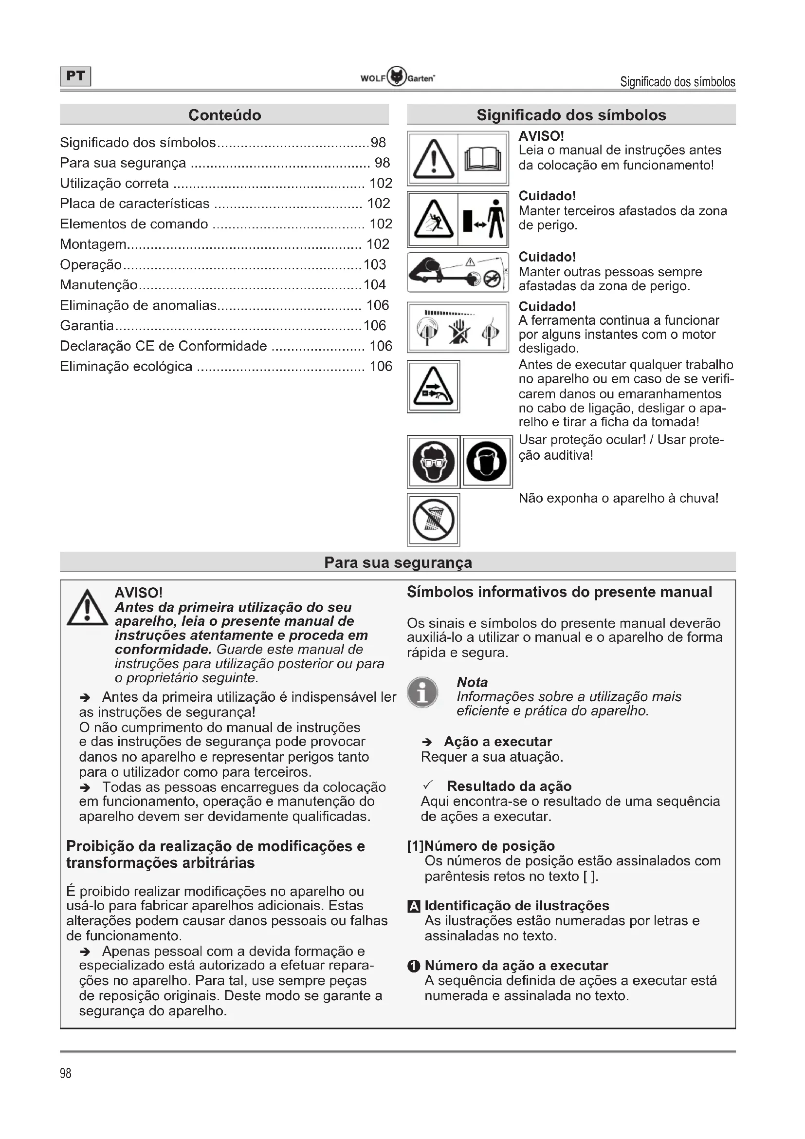 Número da ação a executar $VHTXrQFLDGH¿QLGDGHDo}HVDH[HFXWDUHVWi numerada e assinalada no texto. 6LJQL¿FDGRGRVVtPERORV ....................................... 98 Para sua segurança .............................................. 98 Utilização correta ................................................. Placa de características ...................................... Elementos de comando ....................................... Montagem............................................................ Operação ............................................................. Manutenção ......................................................... Eliminação de anomalias..................................... Garantia ............................................................... Declaração CE de Conformidade ........................ Eliminação ecológica ........................................... Para sua segurança 6LJQL¿FDGRGRVVtPERORV AVISO! Leia o manual de instruções antes da colocação em funcionamento! Cuidado! Manter terceiros afastados da zona de perigo. 360° Cuidado! Manter outras pessoas sempre afastadas da zona de perigo. Cuidado! A ferramenta continua a funcionar por alguns instantes com o motor desligado. Antes de executar qualquer trabalho QRDSDUHOKRRXHPFDVRGHVHYHUL¿- carem danos ou emaranhamentos no cabo de ligação, desligar o apa- UHOKRHWLUDUD¿FKDGDWRPDGD Usar proteção ocular! / Usar prote- ção auditiva! Não exponha o aparelho à chuva! ConteúdoPara sua segurança