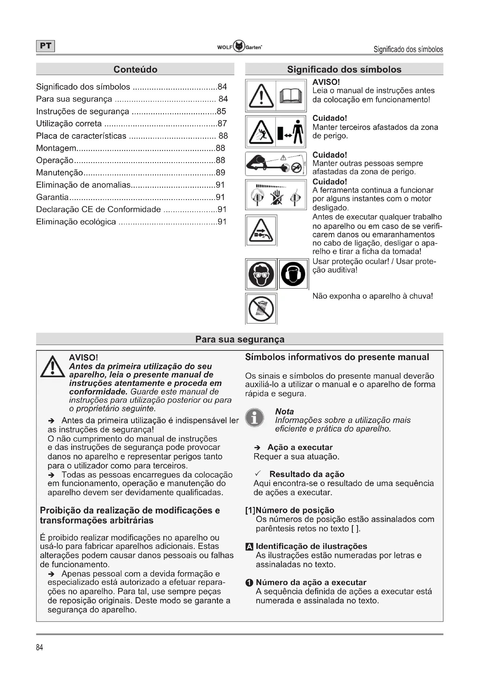 - Número da ação a executar A sequência de¿nida de ações a executar está numerada e assinalada no texto. Para sua segurança Signi¿cado dos símbolos AVISO! Leia o manual de instruções antes da colocação em funcionamento! Cuidado! Manter terceiros afastados da zona de perigo. 360° Cuidado! Manter outras pessoas sempre afastadas da zona de perigo. Cuidado! A ferramenta continua a funcionar por alguns instantes com o motor desligado. Antes de executar qualquer trabalho no aparelho ou em caso de se veri¿- carem danos ou emaranhamentos no cabo de ligação, desligar o apa- relho e tirar a ¿cha da tomada! Usar proteção ocular! / Usar prote- ção auditiva! Não exponha o aparelho à chuva! Conteúdo Signi¿cado dos símbolos p. 84