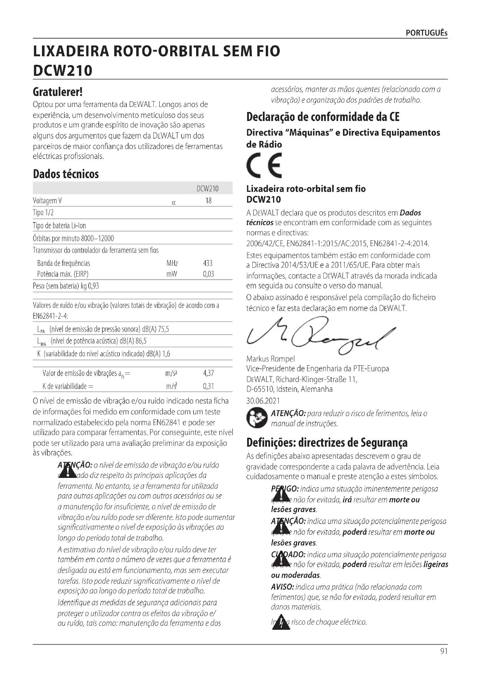 - Litium-ion celler kan gjenbrukes. Lever dem til forhandleren eller en lokal gjenbruksstasjon. De innleverte batteripakkene vil gjenbrukes eller avfallsbehandleskorrekt.91 PORTUGUês acessórios, manter as mãos quentes (relacionado com a vibração) e organização dos padrões detrabalho. Declaração de conformidade da CE Directiva “Máquinas” e Directiva Equipamentos de Rádio Lixadeira roto-orbital sem fio DCW210 A DeWALT declara que os produtos descritos em Dados técnicos se encontram em conformidade com as seguintes normas e directivas: 2006/42/CE, EN62841-1:2015/AC:2015, EN62841-2-4:2014. Estes equipamentos também estão em conformidade com a Directiva 2014/53/UE e a 2011/65/UE. Para obter mais informações, contacte a DeWALT através da morada indicada em seguida ou consulte o verso domanual. O abaixo assinado é responsável pela compilação do ficheiro técnico e faz esta declaração em nome daDeWALT. Markus Rompel Vice-Presidente de Engenharia da PTE-Europa DeWALT, Richard-Klinger-Straße 11, D-65510, Idstein, Alemanha