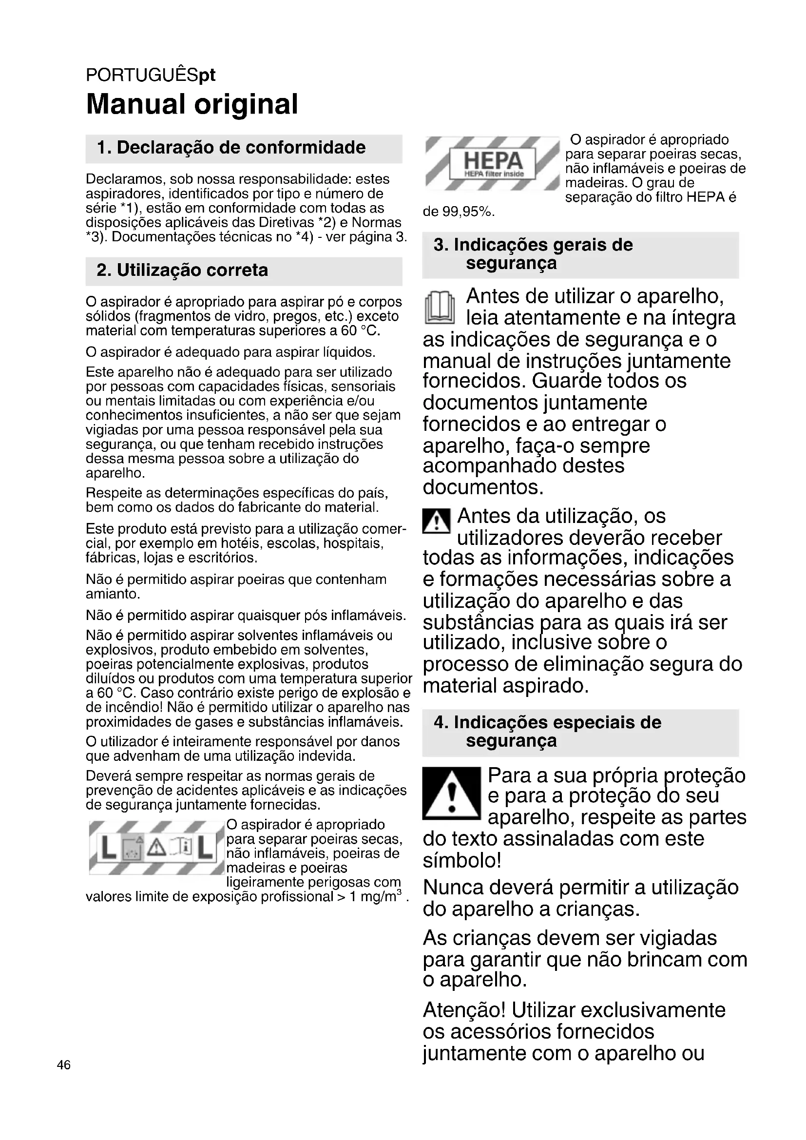 Manual original Declaramos, sob nossa responsabilidade: estes aspiradores, identificados por tipo e número de série *1), estão em conformidade com todas as disposições aplicáveis das Diretivas *2) e Normas *3). Documentações técnicas no *4) - ver página 3. O aspirador é apropriado para aspirar pó e corpos sólidos (fragmentos de vidro, pregos, etc.) exceto material com temperaturas superiores a 60 °C. O aspirador é adequado para aspirar líquidos. Este aparelho não é adequado para ser utilizado por pessoas com capacidades físicas, sensoriais ou mentais limitadas ou com experiência e/ou conhecimentos insuficientes, a não ser que sejam vigiadas por uma pessoa responsável pela sua segurança, ou que tenham recebido instruções dessa mesma pessoa sobre a utilização do aparelho. Respeite as determinações específicas do país, bem como os dados do fabricante do material. Este produto está previsto para a utilização comer- cial, por exemplo em hotéis, escolas, hospitais, fábricas, lojas e escritórios. Não é permitido aspirar poeiras que contenham amianto. Não é permitido aspirar quaisquer pós inflamáveis. Não é permitido aspirar solventes inflamáveis ou explosivos, produto embebido em solventes, poeiras potencialmente explosivas, produtos diluídos ou produtos com uma temperatura superior a 60 °C. Caso contrário existe perigo de explosão e de incêndio! Não é permitido utilizar o aparelho nas proximidades de gases e substâncias inflamáveis. O utilizador é inteiramente responsável por danos que advenham de uma utilização indevida. Deverá sempre respeitar as normas gerais de prevenção de acidentes aplicáveis e as indicações de segurança juntamente fornecidas. O aspirador é apropriado para separar poeiras secas, não inflamáveis, poeiras de madeiras e poeiras ligeiramente perigosas com valores limite de exposição profissional > 1 mg/m³ . O aspirador é apropriado para separar poeiras secas, não inflamáveis e poeiras de madeiras. O grau de separação do filtro HEPA é de 99,95%. Antes de utilizar o aparelho, leia atentamente e na íntegra as indicações de segurança e o manual de instruções juntamente fornecidos. Guarde todos os documentos juntamente fornecidos e ao entregar o aparelho, faça-o sempre acompanhado destes documentos. Antes da utilização, os utilizadores deverão receber todas as informações, indicações e formações necessárias sobre a utilização do aparelho e das substâncias para as quais irá ser utilizado, inclusive sobre o processo de eliminação segura do material aspirado. Para a sua própria proteção e para a proteção do seu aparelho, respeite as partes do texto assinaladas com este símbolo! Nunca deverá permitir a utilização do aparelho a crianças. As crianças devem ser vigiadas para garantir que não brincam com o aparelho. Atenção! Utilizar exclusivamente os acessórios fornecidos juntamente com o aparelho ou