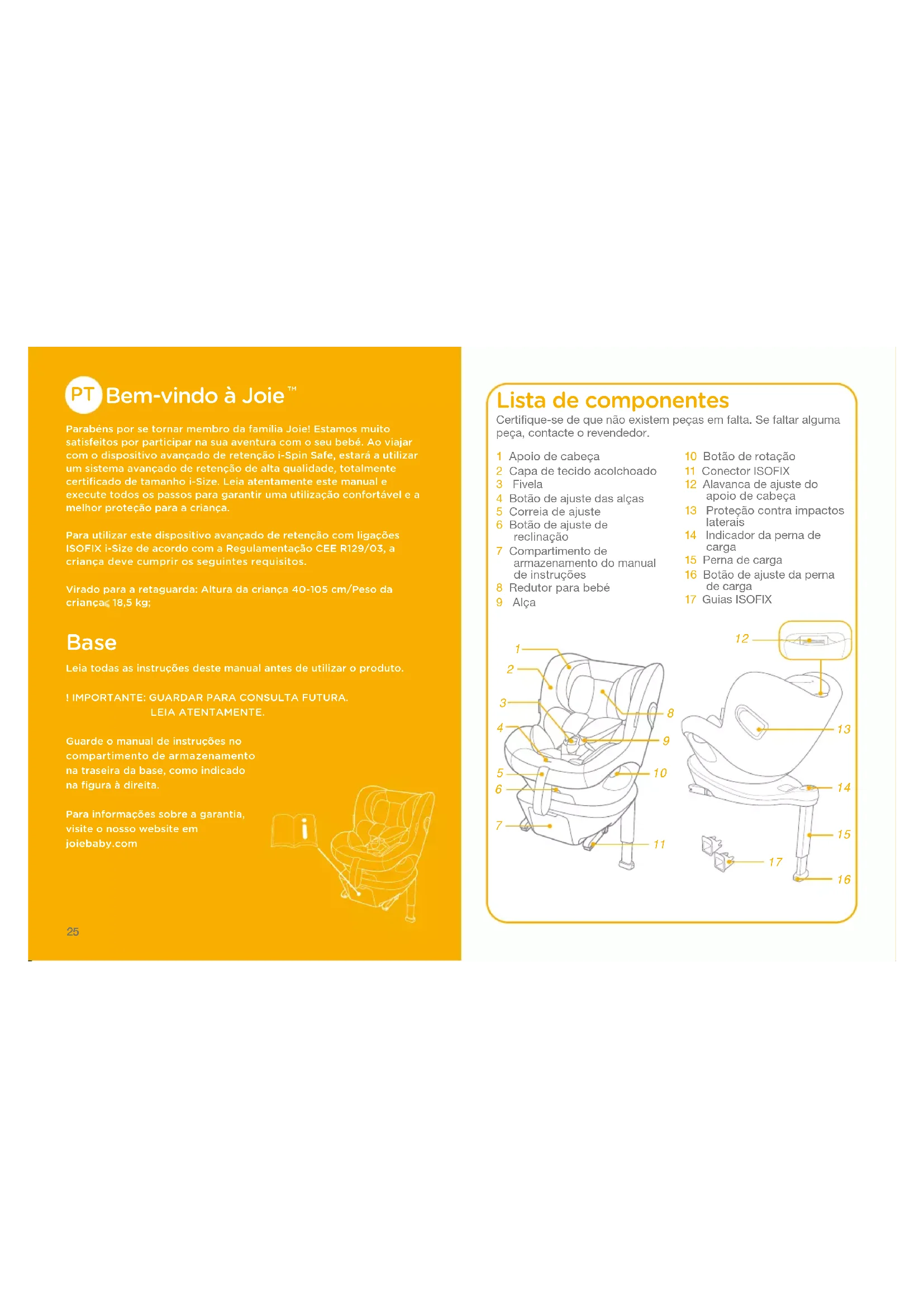 Parabéns por se tornar membro da família Joie! Estamos muito satisfeitos por participar na sua aventura com o seu bebé. Ao viajar com o dispositivo avançado de retenção i-Spin Safe, estará a utilizar um sistema avançado de retenção de alta qualidade, totalmente certificado de tamanho i-Size. Leia atentamente este manual e execute todos os passos para garantir uma utilização confortável e a melhor proteção para a criança.Para utilizar este dispositivo avançado de retenção com ligações ISOFIX i-Size de acordo com a Regulamentação CEE R129/03, a criança deve cumprir os seguintes requisitos.Virado para a retaguarda: Altura da criança 40-105 cm/Peso da criança 18,5 kg; Base Leia todas as instruções deste manual antes de utilizar o produto.! IMPORTANTE: GUARDAR PARA CONSULTA FUTURA.LEIA ATENTAMENTE.Guarde o manual de instruções no compartimento de armazenamento na traseira da base, como indicado na figura à direita.Para informações sobre a garantia, visite o nosso website em joiebaby.com Lista de componentes 1 Apoio de cabeça2 Capa de tecido acolchoado3 Fivela4 Botão de ajuste das alças5 Correia de ajuste6 Botão de ajuste de reclinação7 Compartimento de armazenamento do manual de instruções8 Redutor para bebé9 Alça10 Botão de rotação11 Conector ISOFIX12 Alavanca de ajuste do apoio de cabeça13 Proteção contra impactos laterais14 Indicador da perna de carga15 Perna de carga16 Botão de ajuste da perna de carga17 Guias ISOFIXCertifique-se de que não existem peças em falta. Se faltar alguma peça, contacte o revendedor.