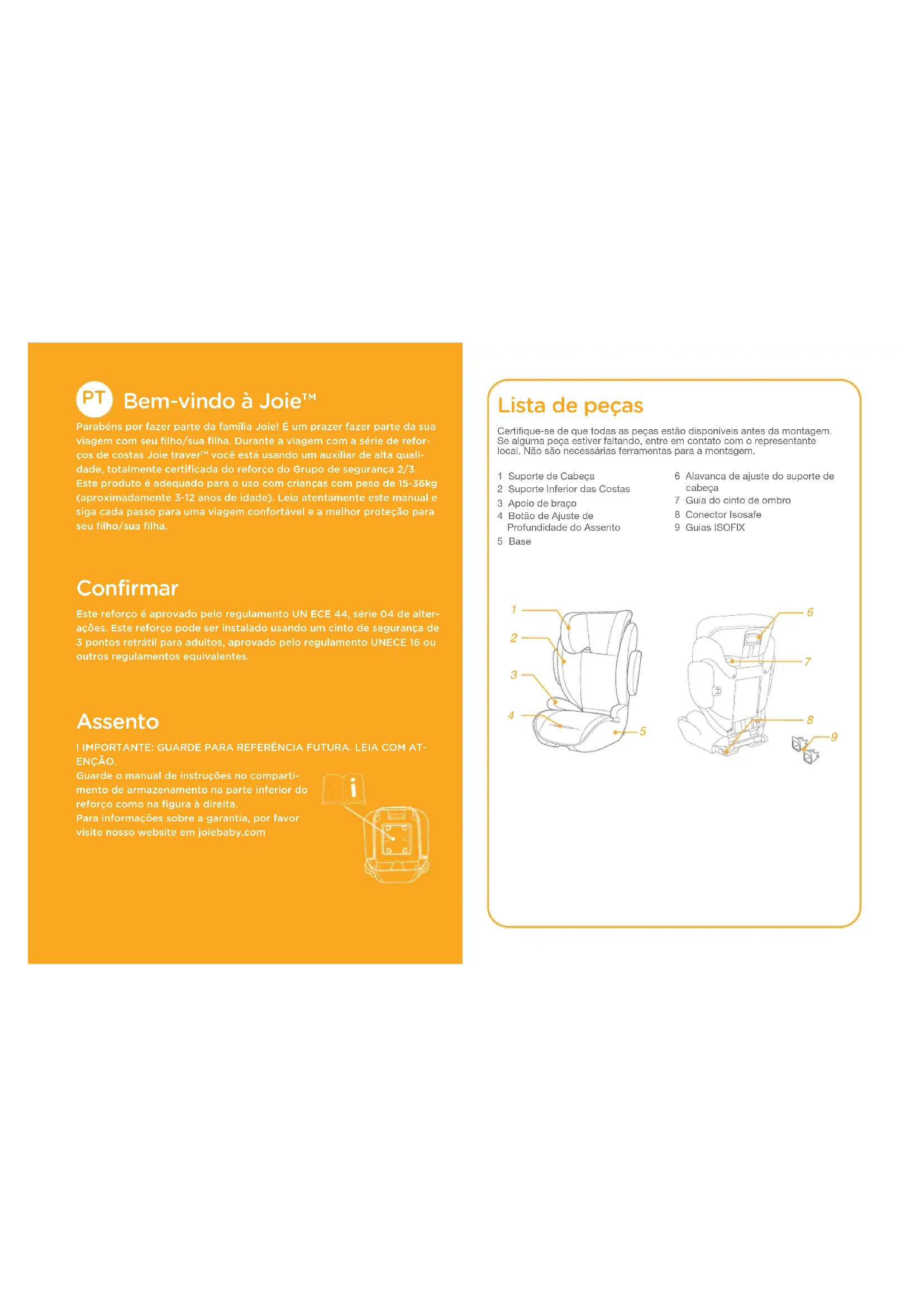 você está usando um auxiliar de alta quali- dade, totalmente certificada do reforço do Grupo de segurança 2/3. Este produto é adequado para o uso com crianças com peso de 15-36kg (aproximadamente 3-12 anos de idade). Leia atentamente este manual e siga cada passo para uma viagem confortável e a melhor proteção para seu filho/sua filha. Confirmar Este reforço é aprovado pelo regulamento UN ECE 44, série 04 de alter- ações. Este reforço pode ser instalado usando um cinto de segurança de 3 pontos retrátil para adultos, aprovado pelo regulamento UNECE 16 ou outros regulamentos equivalentes. Assento ! IMPORTANTE: GUARDE PARA REFERÊNCIA FUTURA. LEIA COM AT- ENÇÃO. Guarde o manual de instruções no comparti- mento de armazenamento na parte inferior do reforço como na figura à direita. Para informações sobre a garantia, por favor visite nosso website em joiebaby.com