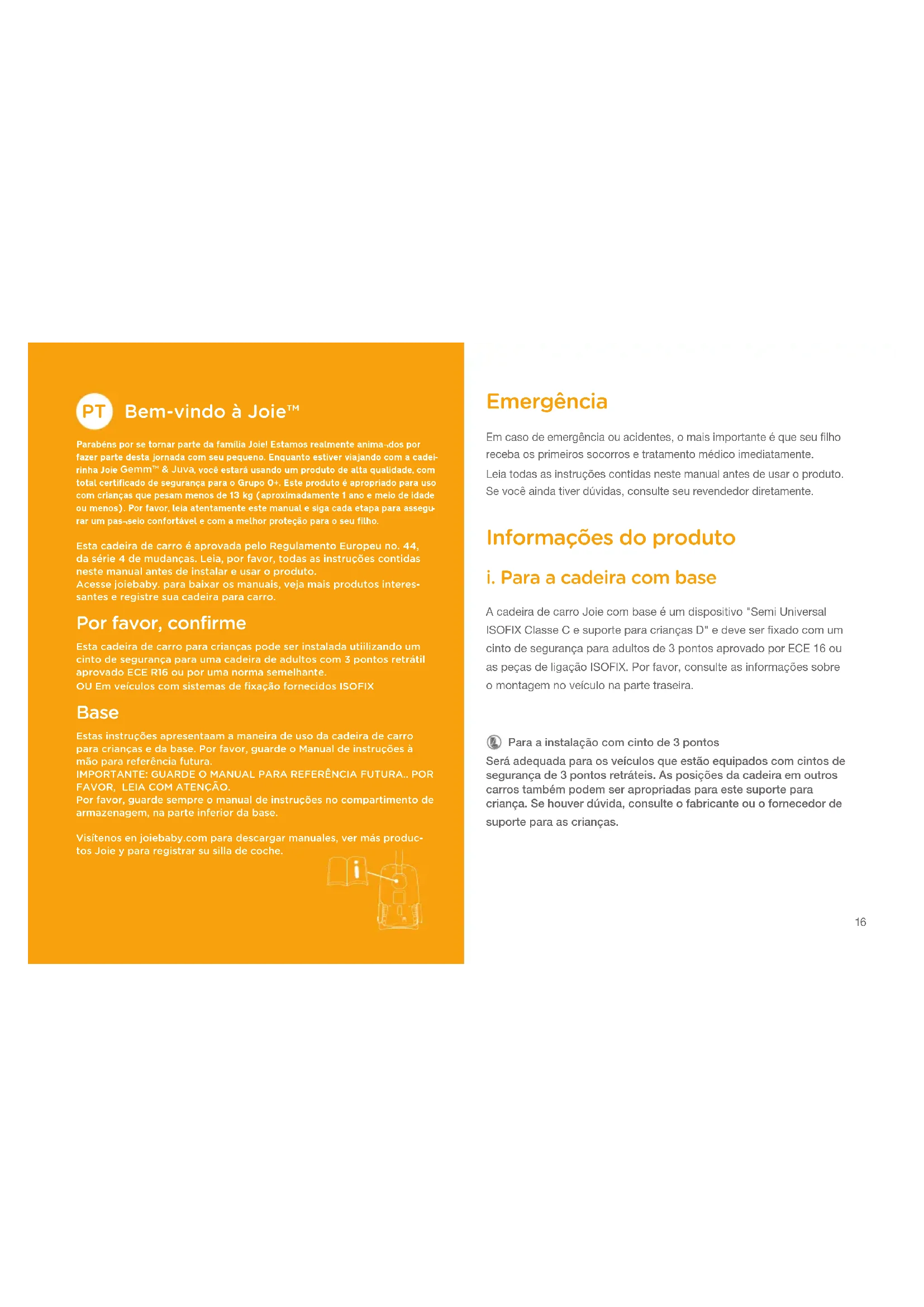 rar um pas¬seio confortável e com a melhor proteção para o seu filho. Esta cadeira de carro é aprovada pelo Regulamento Europeu no. 44, da série 4 de mudanças. Leia, por favor, todas as instruções contidas neste manual antes de instalar e usar o produto. Acesse joiebaby. para baixar os manuais, veja mais produtos interes- santes e registre sua cadeira para carro. Por favor, confirme Esta cadeira de carro para crianças pode ser instalada utiilizando um cinto de segurança para uma cadeira de adultos com 3 pontos retrátil aprovado ECE R16 ou por uma norma semelhante. OU Em veículos com sistemas de fixação fornecidos ISOFIX Base Estas instruções apresentaam a maneira de uso da cadeira de carro para crianças e da base. Por favor, guarde o Manual de instruções à mão para referência futura. IMPORTANTE: GUARDE O MANUAL PARA REFERÊNCIA FUTURA.. POR FAVOR, LEIA COM ATENÇÃO. Por favor, guarde sempre o manual de instruções no compartimento de armazenagem, na parte inferior da base. Visítenos en joiebaby.com para descargar manuales, ver más produc- tos Joie y para registrar su silla de coche. Emergência Em caso de emergência ou acidentes, o mais importante é que seu filho receba os primeiros socorros e tratamento médico imediatamente. Leia todas as instruções contidas neste manual antes de usar o produto. Se você ainda tiver dúvidas, consulte seu revendedor diretamente. Informações do produto