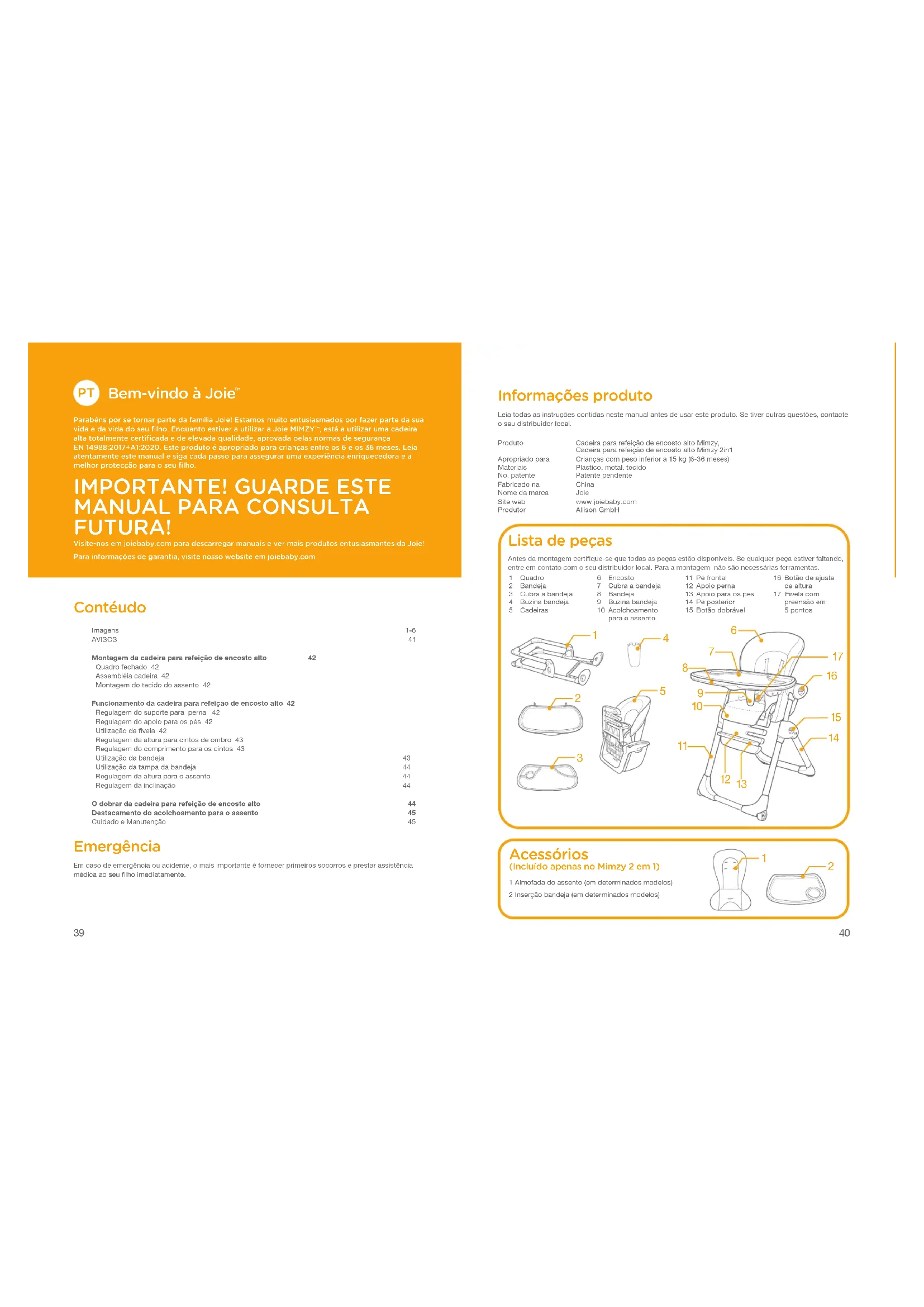 FUTURA! Visite-nos em joiebaby.com para descarregar manuais e ver mais produtos entusiasmantes da Joie!Para informações de garantia, visite nosso website em joiebaby.com Contéudo Imagens 1-6AVISOS 41Montagem da cadeira para refeição de encosto alto 42 Quadro fechado 42 Assembléia cadeira 42 Montagem do tecido do assento 42Funcionamento da cadeira para refeição de encosto alto 42 Regulagem do suporte para perna 42 Regulagem do apoio para os pés 42 Utilização da fivela 42 Regulagem da altura para cintos de ombro 43 Regulagem do comprimento para os cintos 43 Utilização da bandeja 43 Utilização da tampa da bandeja 44 Regulagem da altura para o assento 44 Regulagem da inclinação 44O dobrar da cadeira para refeição de encosto alto 44 Destacamento do acolchoamento para o assento 45Cuidado e Manutenção 45 Emergência Em caso de emergência ou acidente, o mais importante é fornecer primeiros socorros e prestar assistência médica ao seu filho imediatamente. Informações produto Leia todas as instruções contidas neste manual antes de usar este produto. Se tiver outras questões, contacte o seu distribuidor local.Produto Cadeira para refeição de encosto alto Mimzy, Cadeira para refeição de encosto alto Mimzy 2in1Apropriado para Crianças com peso inferior a 15 kg (6-36 meses)Materiais Plástico, metal, tecidoNo. patente Patente pendenteFabricado na ChinaNome da marca Joie Site web www.joiebaby.com Produtor Allison GmbH1 Quadro2 Bandeja 3 Cubra a bandeja4 Buzina bandeja 5 Cadeiras