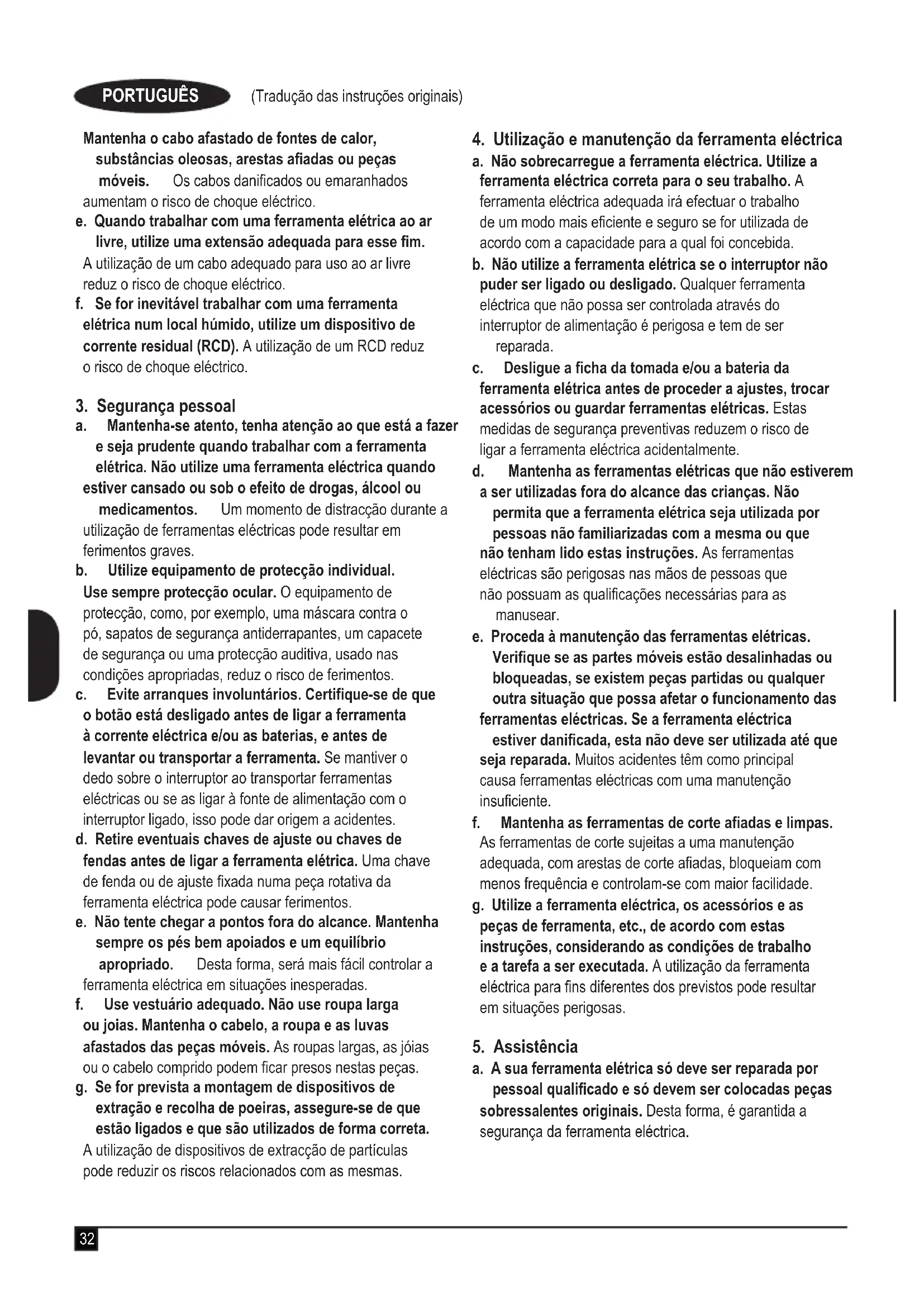 a. A sua ferramenta elétrica só deve ser reparada por pessoalqualicadoesódevemsercolocadaspeças sobressalentes originais. Desta forma, é garantida a segurança da ferramenta eléctrica.33 (Tradução das instruções originais) PORTUGUÊS Avisos de segurança adicionais para ferramentas eléctricas