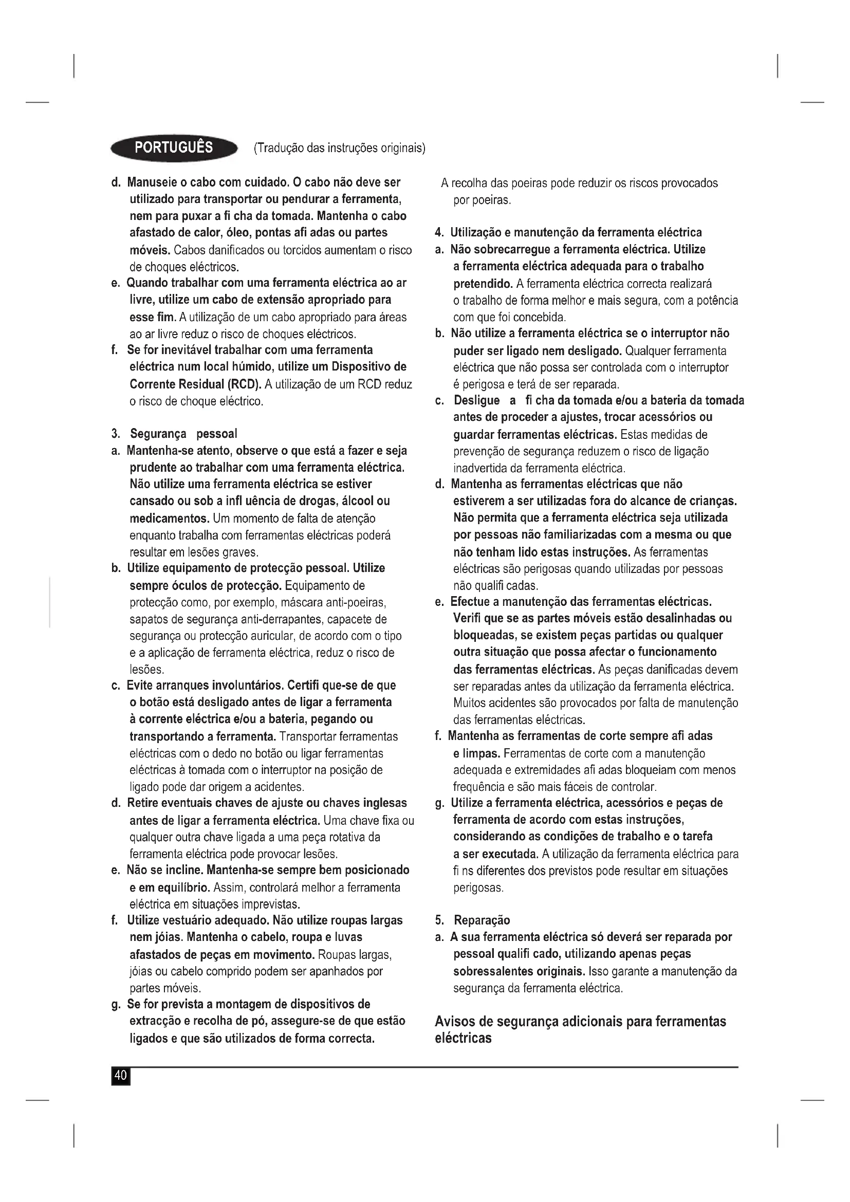 Advertência! Leia com atenção todos os avisos de segurança e instruções. O não cumprimento dos seguintes avisos e instruções pode resultar em choque eléctrico, incêndio e/ou graves lesões. Guarde todos os avisos e instruções para futura referência. A expressão "ferramenta eléctrica" utilizada a seguir refere-se a ferramentas eléctricas com ligaçãoà corrente eléctrica (com cabo) ou com bateria (sem fi os). 1. Segurança na área de trabalhoa. Mantenha a área de trabalho limpa e bem iluminada.Áreas desarrumadas ou mal iluminadas são propícias a acidentes.b. Não trabalhe com ferramentas eléctricas em áreas com risco de explosão, nas quais se encontrem líquidos, gases ou poeiras infl amáveis. As ferramentas eléctricas produzem faíscas que podem provocar a ignição de poeiras ou vapores.c. Mantenha crianças e outras pessoas afastadas durante a utilização da ferramenta eléctrica. Distracções podem provocar perda de controlo do aparelho.2. Segurança eléctricaa. A fi cha da ferramenta eléctrica deve caber na tomada. A fi cha não deve ser modifi cada de modo algum. Não utilize quaisquer fi chas adaptadoras em ferramentas eléctricas com ligação à terra. Fichas sem modifi cações e tomadas adequadas reduzem o risco de choques eléctricos.b. Evite que o corpo entre em contacto com superfícies ligadas à terra, como tubos, radiadores, fogões e frigorífi cos. Existe um risco elevado de choques eléctricos se o corpo estiver ligado à terra.c. As ferramentas eléctricas não podem ser expostas à chuva nem à humidade. A penetração de água na ferramenta eléctrica aumenta o risco de choques eléctricos.40 (Tradução das instruções originais) PORTUGUÊS d. Manuseie o cabo com cuidado. O cabo não deve ser utilizado para transportar ou pendurar a ferramenta, nem para puxar a fi cha da tomada. Mantenha o cabo afastado de calor, óleo, pontas afi adas ou partes móveis. Cabos danifi cados ou torcidos aumentam o risco de choques eléctricos. e. Quando trabalhar com uma ferramenta eléctrica ao ar livre, utilize um cabo de extensão apropriado para esse fi m. A utilização de um cabo apropriado para áreas ao ar livre reduz o risco de choques eléctricos. f. Se for inevitável trabalhar com uma ferramenta eléctrica num local húmido, utilize um Dispositivo de Corrente Residual (RCD). A utilização de um RCD reduz o risco de choque eléctrico.