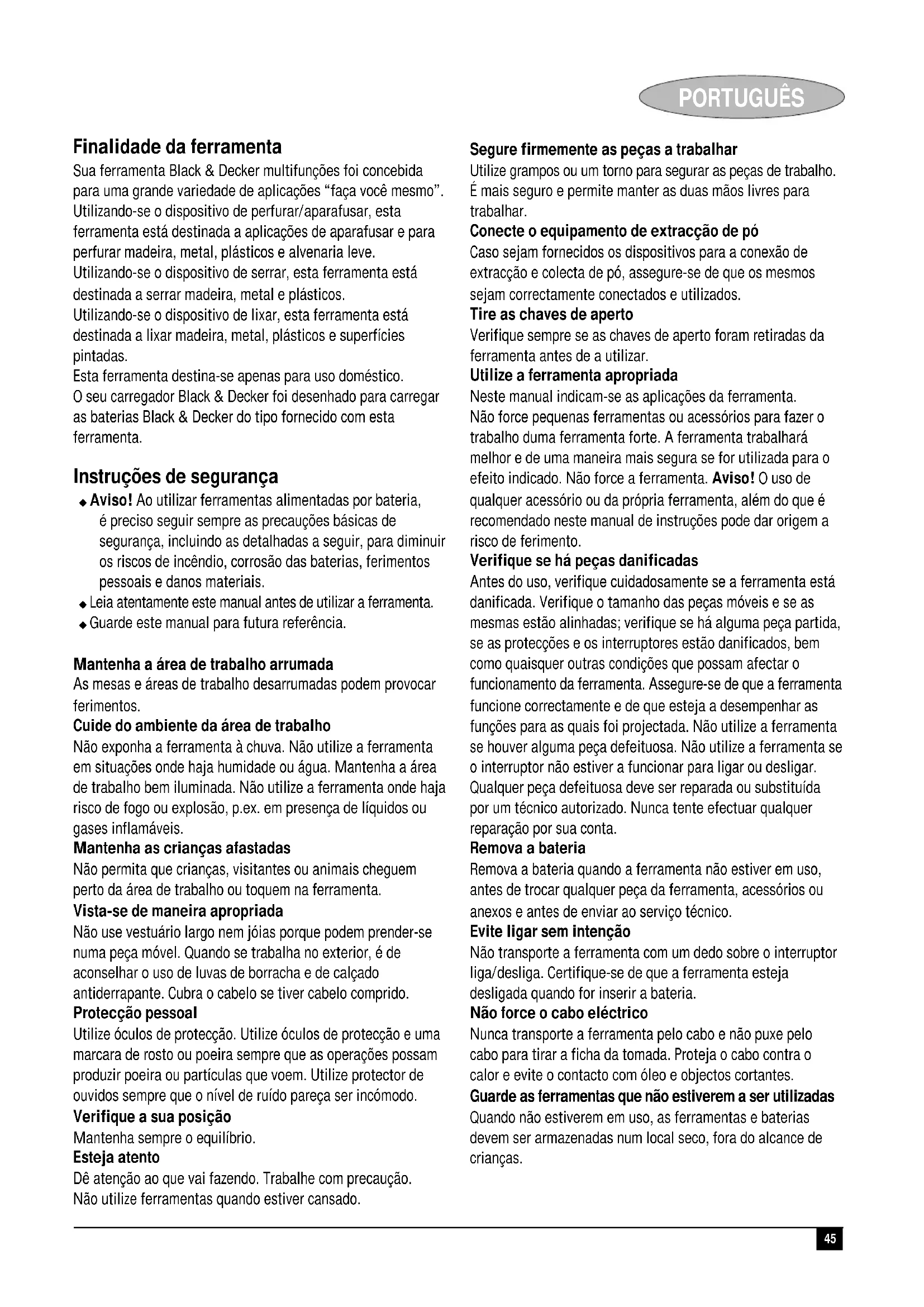 Colin Wills Director of Engineering BDCI, 4/F, 2 Dai Wang Street Tai Po Industrial Estate Tai Po NT, Hong Kong Garantía Black & Decker confía plenamente en la calidad de sus productos y ofrece una garantía extraordinaria. Esta declaración de garantía es una añadido, y en ningún caso un perjuicio para sus derechos estatutarios. La garantía es válida dentro de los territorios de los Estados Miembros de la Unión Europea y de los de la Zona Europea de Libre Comercio. Si un producto Black & Decker resultará defectuoso debido a materiales o mano de obra defectuosos o a la falta de conformidad, Black & Decker garantiza, dentro de los 24 meses de la fecha de compra, la sustitución de las piezas defectuosas, la reparación de los productos sujetos a un desgaste y rotura razonables o la sustitución de tales productos para garantizar al cliente el mínimo de inconvenientes, a menos que: ◆ El producto haya sido utilizado con propósitos comerciales, profesionales o de alquiler; ◆ El producto haya sido sometido a un uso inadecuado o negligente; ◆ El producto haya sufrido daños causados por objetos o sustancias extrañas o accidentes; ◆ Se hayan realizado reparaciones por parte de personas que no sean los servicios de reparación autorizados o personal de servicios de Black & Decker; Para reclamar en garantía, será necesario que presente la prueba de compra al vendedor o al servicio técnico de reparaciones autorizado. Pueden consultar la dirección de su servicio técnico más cercano poniéndose en contacto con la oficina local de Black & Decker en la dirección que se indica en este manual. Como alternativa, se puede consultar en Internet, en la dirección siguiente, la lista de servicios técnico autorizados e información completa de nuestros servicios de postventa y contactos: www.2helpU.com.45 PORTUGUÊS Finalidade da ferramenta Sua ferramenta Black & Decker multifunções foi concebida para uma grande variedade de aplicações “faça você mesmo”. Utilizando-se o dispositivo de perfurar/aparafusar, esta ferramenta está destinada a aplicações de aparafusar e para perfurar madeira, metal, plásticos e alvenaria leve. Utilizando-se o dispositivo de serrar, esta ferramenta está destinada a serrar madeira, metal e plásticos. Utilizando-se o dispositivo de lixar, esta ferramenta está destinada a lixar madeira, metal, plásticos e superfícies pintadas. Esta ferramenta destina-se apenas para uso doméstico. O seu carregador Black & Decker foi desenhado para carregar as baterias Black & Decker do tipo fornecido com esta ferramenta. Instruções de segurança ◆ Aviso! Ao utilizar ferramentas alimentadas por bateria, é preciso seguir sempre as precauções básicas de segurança, incluindo as detalhadas a seguir, para diminuir os riscos de incêndio, corrosão das baterias, ferimentos pessoais e danos materiais. ◆ Leia atentamente este manual antes de utilizar a ferramenta. ◆ Guarde este manual para futura referência. Mantenha a área de trabalho arrumada As mesas e áreas de trabalho desarrumadas podem provocar ferimentos. Cuide do ambiente da área de trabalho Não exponha a ferramenta à chuva. Não utilize a ferramenta em situações onde haja humidade ou água. Mantenha a área de trabalho bem iluminada. Não utilize a ferramenta onde haja risco de fogo ou explosão, p.ex. em presença de líquidos ou gases inflamáveis. Mantenha as crianças afastadas Não permita que crianças, visitantes ou animais cheguem perto da área de trabalho ou toquem na ferramenta. Vista-se de maneira apropriada Não use vestuário largo nem jóias porque podem prender-se numa peça móvel. Quando se trabalha no exterior, é de aconselhar o uso de luvas de borracha e de calçado antiderrapante. Cubra o cabelo se tiver cabelo comprido. Protecção pessoal Utilize óculos de protecção. Utilize óculos de protecção e uma marcara de rosto ou poeira sempre que as operações possam produzir poeira ou partículas que voem. Utilize protector de ouvidos sempre que o nível de ruído pareça ser incómodo. Verifique a sua posição Mantenha sempre o equilíbrio. Esteja atento Dê atenção ao que vai fazendo. Trabalhe com precaução. Não utilize ferramentas quando estiver cansado. Segure firmemente as peças a trabalhar Utilize grampos ou um torno para segurar as peças de trabalho. É mais seguro e permite manter as duas mãos livres para trabalhar. Conecte o equipamento de extracção de pó Caso sejam fornecidos os dispositivos para a conexão de extracção e colecta de pó, assegure-se de que os mesmos sejam correctamente conectados e utilizados. Tire as chaves de aperto Verifique sempre se as chaves de aperto foram retiradas da ferramenta antes de a utilizar. Utilize a ferramenta apropriada Neste manual indicam-se as aplicações da ferramenta. Não force pequenas ferramentas ou acessórios para fazer o trabalho duma ferramenta forte. A ferramenta trabalhará melhor e de uma maneira mais segura se for utilizada para o efeito indicado. Não force a ferramenta. Aviso! O uso de qualquer acessório ou da própria ferramenta, além do que é recomendado neste manual de instruções pode dar origem a risco de ferimento. Verifique se há peças danificadas Antes do uso, verifique cuidadosamente se a ferramenta está danificada. Verifique o tamanho das peças móveis e se as mesmas estão alinhadas; verifique se há alguma peça partida, se as protecções e os interruptores estão danificados, bem como quaisquer outras condições que possam afectar o funcionamento da ferramenta. Assegure-se de que a ferramenta funcione correctamente e de que esteja a desempenhar as funções para as quais foi projectada. Não utilize a ferramenta se houver alguma peça defeituosa. Não utilize a ferramenta se o interruptor não estiver a funcionar para ligar ou desligar. Qualquer peça defeituosa deve ser reparada ou substituída por um técnico autorizado. Nunca tente efectuar qualquer reparação