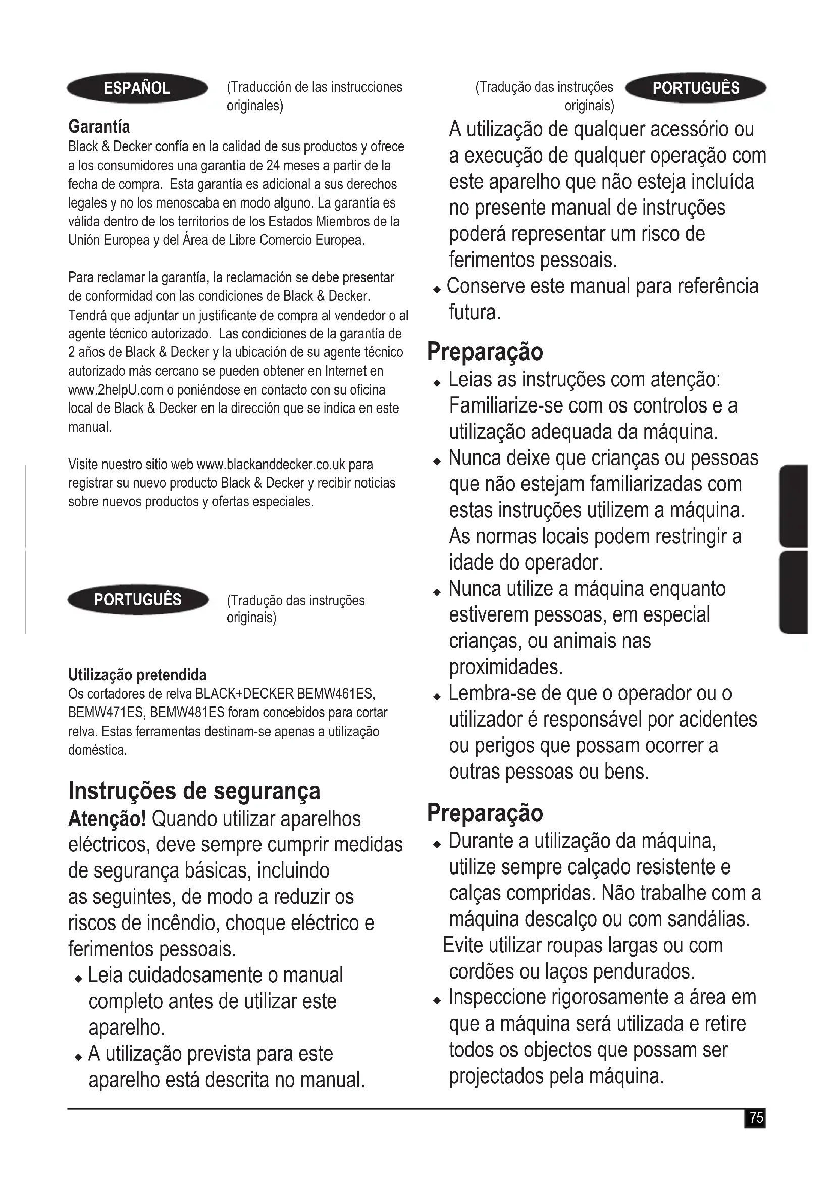 : 96 dB(A). Estos productos también cumplen con las directivas 2014/30/ UE y 2011/65/UE. Para más información, póngase en contacto con Black & Decker en la siguiente dirección o consulte la parte posterior del manual. El abajo rmante es el responsable de la compilación del archivo técnico y realiza esta declaración en representación de Black & Decker. R. Laverick Director de Ingeniería Black & Decker Europa, 210 Bath Road, Slough, Berkshire, SL1 3YD Reino Unido 31/10/201775 (Traducción de las instrucciones originales) ESPAÑOL (Tradução das instruções originais) PORTUGUÊS Garantía Black & Decker confía en la calidad de sus productos y ofrece a los consumidores una garantía de 24 meses a partir de la fecha de compra. Esta garantía es adicional a sus derechos legales y no los menoscaba en modo alguno. La garantía es válida dentro de los territorios de los Estados Miembros de la Unión Europea y del Área de Libre Comercio Europea. Para reclamar la garantía, la reclamación se debe presentar de conformidad con las condiciones de Black & Decker. Tendrá que adjuntar un justicante de compra al vendedor o al agente técnico autorizado. Las condiciones de la garantía de 2 años de Black & Decker y la ubicación de su agente técnico autorizado más cercano se pueden obtener en Internet en www.2helpU.com o poniéndose en contacto con su ocina local de Black & Decker en la dirección que se indica en este manual. Visite nuestro sitio web www.blackanddecker.co.uk para registrar su nuevo producto Black & Decker y recibir noticias sobre nuevos productos y ofertas especiales.(Tradução das instruções originais) PORTUGUÊS Utilização pretendida Os cortadores de relva BLACK+DECKER BEMW461ES, BEMW471ES, BEMW481ES foram concebidos para cortar relva. Estas ferramentas destinam-se apenas a utilização doméstica. Instruções de segurança Atenção! Quando utilizar aparelhos eléctricos, deve sempre cumprir medidas de segurança básicas, incluindo as seguintes, de modo a reduzir os riscos de incêndio, choque eléctrico e ferimentos pessoais. u Leia cuidadosamente o manual completo antes de utilizar este aparelho. u A utilização prevista para este aparelho está descrita no manual. A utilização de qualquer acessório ou a execução de qualquer operação com este aparelho que não esteja incluída no presente manual de instruções poderá representar um risco de ferimentos pessoais. u Conserve este manual para referência futura. Preparação u Leias as instruções com atenção: Familiarize-se com os controlos e a utilização adequada da máquina. u Nunca deixe que crianças ou pessoas que não estejam familiarizadas com estas instruções utilizem a máquina. As normas locais podem restringir a idade do operador. u Nunca utilize a máquina enquanto estiverem pessoas, em especial crianças, ou animais nas proximidades. u Lembra-se de que o operador ou o utilizador é responsável por acidentes ou perigos que possam ocorrer a outras pessoas ou bens. Preparação u Durante a utilização da máquina, utilize sempre calçado resistente e calças compridas. Não trabalhe com a máquina descalço ou com sandálias. Evite utilizar roupas largas ou com cordões ou laços pendurados. u Inspeccione rigorosamente a área em que a máquina será utilizada e retire todos os objectos que possam ser projectados pela máquina.76 (Tradução das instruções originais) PORTUGUÊS u Antes de usar, proceda sempre a uma inspecção visual para ver se a lâmina, o parafuso da lâmina e o conjunto da lâmina não estão desgastados ou danicados. Substitua componentes desgastados ou danicados em conjuntos para manter o equilíbrio. Substitua etiquetas danicadas ou ilegíveis. u Antes da utilização, verique se o cabo de alimentação e a extensão eléctrica apresentam sinais de danos ou desgaste. Se o cabo se danicar durante a utilização, desligue de imediato o aparelho da fonte de alimentação eléctrica. NÃO TOQUE