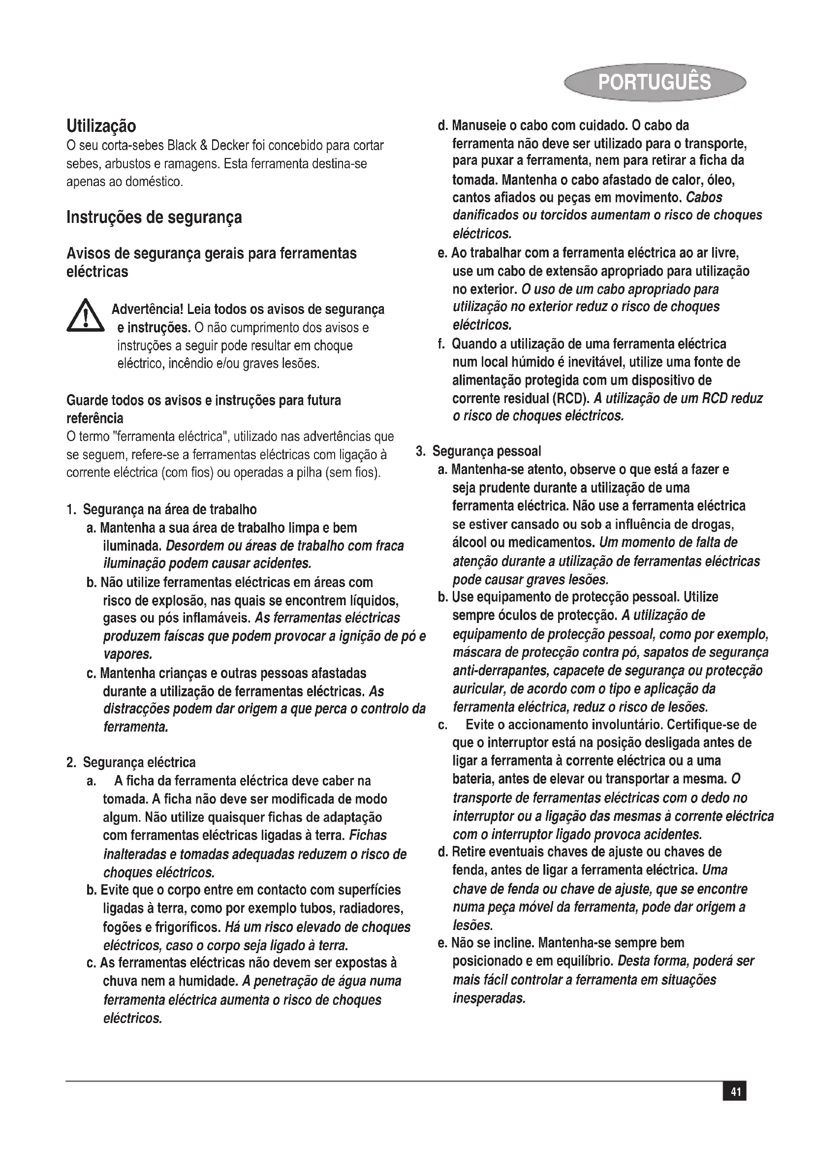 Este corta-sebes tem as seguintes funções: u Punhos ergonómicos para um corte confortável.u Lâminas maquinadas para um corte aperfeiçoado.u Lâminas de dupla acção para uma vibração reduzida.44 PORTUGUÊS Montagem Advertência! Antes da montagem, certique-se de que a ferramenta está desligada e desconectada da rede eléctrica e de que o estojo da lâmina está colocado sobre as lâminas. Instalaçãodoresguardodeprotecção(g.A) u Encaixe o resguardo de protecção (4) nas ranhuras (8).u Fixe o resguardo com os dois parafusos (9) fornecidos. Advertência! Nunca utilize a ferramenta sem o resguardo. Ligaçãodaferramentaàredeeléctrica(g.B) A menos que a ferramenta disponha de um cabo para ligação eléctrica, será preciso utilizar um cabo de extensão para ligá-la à tomada. u Ligue a cha fêmea de uma extensão eléctrica adequada à tomada de alimentação da ferramenta. u Enrole o cabo no retentor (7) conforme mostrado para evitar que o cabo de extensão se solte durante o uso. u Ligue a cha à tomada de parede. Advertência! O cabo de extensão deve ser adequado para uso em ambientes externos. No caso de se usar uma bobina, desenrole o cabo todo. Riscos residuais. Podem surgir riscos residuais adicionais durante a utilização da ferramenta que poderão não constar nos avisos de segurança incluídos. Estes riscos podem resultar de má utilização, uso prolongado, etc. Mesmo com a aplicação dos regulamentos de segurança relevantes e com a implementação de dispositivos de segurança, alguns riscos residuais não podem ser evitados. Incluem: u ferimentos causados pelo contacto com peças em rotação/movimento. u ferimentos causados durante a troca de peças, lâminas ou acessórios. u ferimentos causados pela utilização prolongada de uma ferramenta. Quando utilizar uma ferramenta por períodos prolongados, faça intervalos regulares. u diminuição da audição. u problemas de saúde causados pela inalação de poeiras resultantes da utilização da ferramenta (exemplo: trabalhos em madeira, especialmente carvalho, faia e MDF.) Utilização Advertência! Deixe que a ferramenta funcione à vontade. Não o sobrecarregue. u Guie o cabo cuidadosamente para evitar cortá-lo acidentalmente. Uma boa maneira de controlar o cabo consiste em colocá-lo sobre os ombros. u Para sua segurança, esta ferramenta está equipada com um sistema de comutação duplo. Este sistema evita que a ferramenta entre em funcionamento inadvertidamente e apenas permitirá o seu funcionamento quando a ferramenta estiver segura com as duas mãos. Como ligar e desligar a ferramenta Activação u Segure punho frontal (3) com uma mão de modo a que o interruptor do punho frontal (2) seja empurrado em direcção ao corpo da ferramenta. u Com a outra mão, prima o gatilho (1) para ligar a ferramenta. Desactivação u Solte o interruptor do punho (2) ou o gatilho (1). Advertência! Nunca tente bloquear o interruptor na posição de ligado. Sugestões para uma melhor utilização u Comece por cortar o topo da sebe. Incline ligeiramente a ferramenta (até 15° relativamente à linha de corte) de maneira que a lâmina se incline ligeiramente em direcção à sebe (g. C1). Isto fará com que as lâminas cortem mais ecazmente. Segure a ferramenta no ângulo desejado e mova-a rmemente junto à linha de corte. A lâmina de dois lados permite o corte em qualquer direcção. u De modo a obter um corte bem recto, estique um pedaço de cordão ao longo do comprimento da sebe na altura desejada. Utilize o cordão como linha de direcção, cortando logo acima dele. u De modo a obter lados planos, corte para cima com o crescimento. Os troncos jovens afastam-se quando a lâmina corta para baixo, causando partes rasas na sebe (g. C2). u Tome cuidado para evitar qualquer objecto estranho. Evite especialmente objectos duros tais como cabos de metal e grades, uma vez que estes podem danicar as lâminas. u Lubrique regularmente as lâminas. Quando cortar u Como guia geral, sebes e arbustos com folhas sazonais (novas todos os anos) podem ser aparadas em Junho e Outubro. u As sebes de folha permanente podem ser aparadas em Abril e Agosto. u As sebes de crescimento rápido podem ser acertadas de seis em seis semanas, a partir do mês de Maio. Manutenção Esta ferramenta Black & Decker foi desenvolvida para45 PORTUGUÊS funcionar por um longo período, com um mínimo de manutenção. O funcionamento contínuo e satisfatório depende de limpeza regular e de manutenção adequada. Advertência! Antes de qualquer procedimento de manutenção, desligue a ferramenta no interruptor e retire a cha da tomada. u Após a utilização, limpe as lâminas cuidadosamente. Após a limpeza, aplique uma película de óleo de máquina para evitar que as lâminas enferrujem. u Limpe regularmente as ranhuras de ventilação da ferramenta utilizando uma escova suave ou um pano seco. u Limpe regularmente o compartimento do motor utilizando um pano húmido. Não utilize nenhum detergente abrasivo nem à base de solvente. u Certique-se de que todos os interruptores estão livres de detritos antes e após a utilização da ferramenta. Remoçãodoresguardodeprotecção(g.A) Advertência! Retire o resguardo apenas para assistência técnica. Nunca se esqueça de voltar a colocar o resguardo no nal da assistência técnica. u Desaperte os parafusos (9) e retire-os.u Empurre o resguardo de protecção (4) para fora da ferramenta. Resolução de problemas Se a ferramenta não funcionar correctamente, verique o seguinte. Falha Possível causa Solução A ferramenta nã. Fusível Substitua o funciona queimado. fusível. Falha no Verique este dispositivo de dispositivo. corrente residual (RCD). A corrente não Verique a fonte está ligada. de alimentação. Protecção do meio ambiente