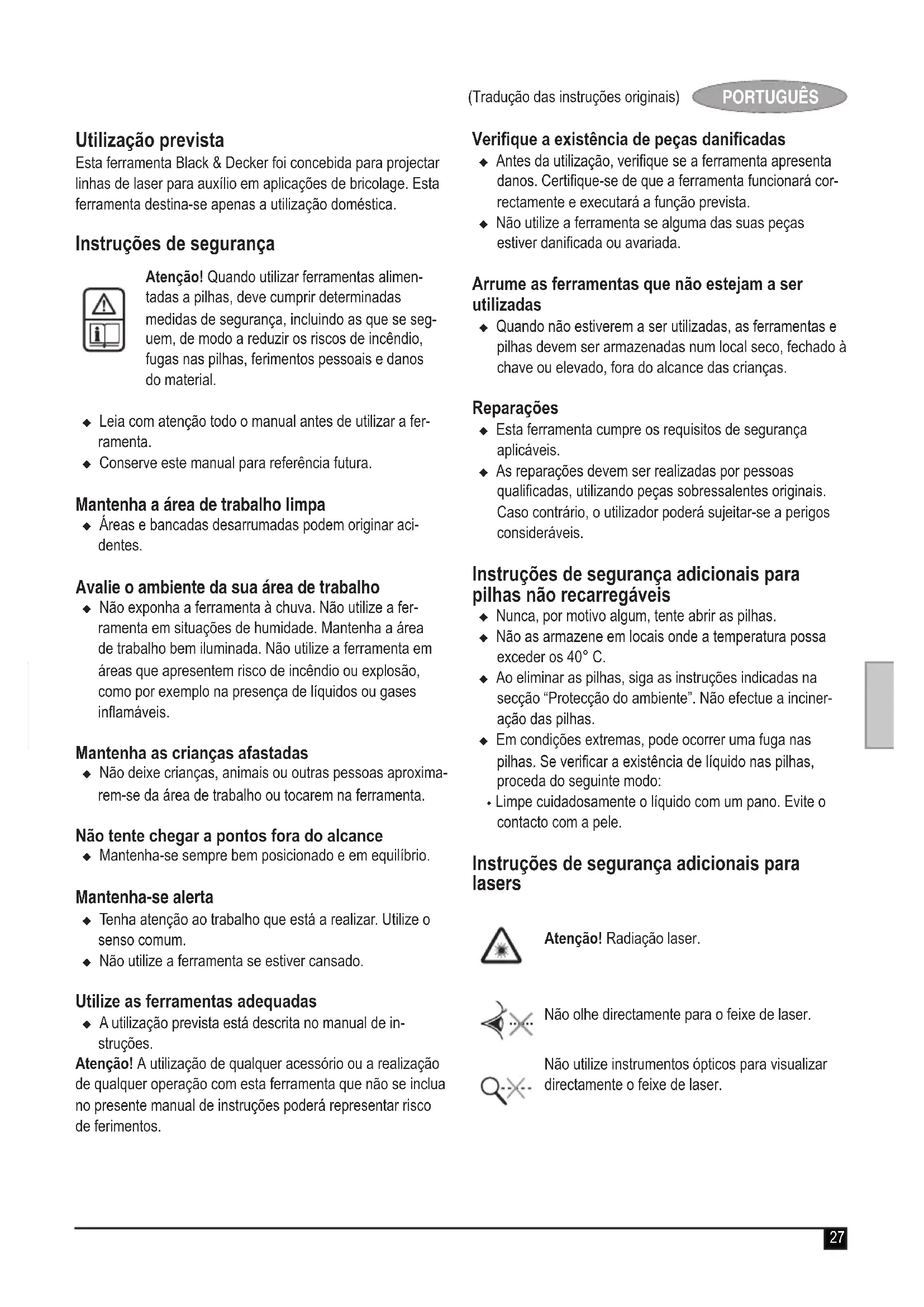 0-40 Peso kg 1,5 Garantía Black & Decker confía plenamente en la calidad de sus pro- ductos y ofrece una garantía extraordinaria. Esta declaración de garantía es un añadido, y en ningún caso un perjuicio para sus derechos legales. La garantía es válida dentro de los territorios de los Estados miembros de la Unión Europea y de los de la Zona Europea de Libre Comercio. Si un producto Black & Decker resultara defectuoso debido a materiales o mano de obra defectuosos o a la falta de confor- midad, Black & Decker garantiza, dentro de los 24 meses de la fecha de compra, la sustitución de las piezas defectuosas, la reparación de los productos sujetos a un desgaste y rotura razonables o la sustitución de tales productos para garantizar al cliente el mínimo de inconvenientes, a menos que: u El producto se ha utilizado con propósitos comerciales, profesionales o de alquiler. u El producto se ha sometido a un uso inadecuado o negli- gente. u El producto ha sufrido daños causados por objetos o sustancias extrañas o accidentes. u Se hayan realizado reparaciones por parte de personas que no sean del servicio técnico autorizado o personal de servicios de Black & Decker. Para reclamar en garantía, será necesario que presente la prueba de compra al vendedor o al agente de servicio técnico autorizado. Puede consultar la dirección de su agente de servicio técnico más cercano si se pone en contacto con la ocina local de Black & Decker en la dirección que se indica en este manual. Como opción alternativa, puede consultar la lista de los agentes de servicio técnico autorizados de Black & Decker y obtener la información completa de nuestros servi- cios de posventa y los contactos disponibles en la siguiente dirección de Internet: www.2helpU.com Visite el sitio web www.blackanddecker.es para registrar su nuevo producto Black & Decker y estar al día sobre productos y ofertas especiales. Encontrará información adicional sobre la marca Black & Decker y nuestra gama de productos en www.blackanddecker.es.27 (Tradução das instruções originais) PORTUGUÊS Utilização prevista Esta ferramenta Black & Decker foi concebida para projectar linhas de laser para auxílio em aplicações de bricolage. Esta ferramenta destina-se apenas a utilização doméstica. Instruções de segurança Atenção! Quando utilizar ferramentas alimen- tadas a pilhas, deve cumprir determinadas medidas de segurança, incluindo as que se seg- uem, de modo a reduzir os riscos de incêndio, fugas nas pilhas, ferimentos pessoais e danos do material. u Leia com atenção todo o manual antes de utilizar a fer- ramenta. u Conserve este manual para referência futura. Mantenha a área de trabalho limpa u Áreas e bancadas desarrumadas podem originar aci- dentes. Avalie o ambiente da sua área de trabalho u Não exponha a ferramenta à chuva. Não utilize a fer- ramenta em situações de humidade. Mantenha a área de trabalho bem iluminada. Não utilize a ferramenta em áreas que apresentem risco de incêndio ou explosão, como por exemplo na presença de líquidos ou gases inamáveis. Mantenha as crianças afastadas u Não deixe crianças, animais ou outras pessoas aproxima- rem-se da área de trabalho ou tocarem na ferramenta. Não tente chegar a pontos fora do alcance u Mantenha-se sempre bem posicionado e em equilíbrio. Mantenha-se alerta u Tenha atenção ao trabalho que está a realizar. Utilize o senso comum. u Não utilize a ferramenta se estiver cansado. Utilize as ferramentas adequadas u A utilização prevista está descrita no manual de in- struções. Atenção! A utilização de qualquer acessório ou a realização de qualquer operação com esta ferramenta que não se inclua no presente manual de instruções poderá representar risco de ferimentos. Verique a existência de peças danicadas u Antes da utilização, verique se a ferramenta apresenta danos. Certique-se de que a ferramenta funcionará cor- rectamente e executará a função prevista. u Não utilize a ferramenta se alguma das suas peças estiver danicada ou avariada. Arrume as ferramentas que não estejam a ser utilizadas u Quando não estiverem a ser utilizadas, as ferramentas e pilhas devem ser armazenadas num local seco, fechado à chave ou elevado, fora do alcance das crianças. Reparações u Esta ferramenta cumpre os requisitos de segurança aplicáveis. u As reparações devem ser realizadas por pessoas qualicadas, utilizando peças sobressalentes originais. Caso contrário, o utilizador poderá sujeitar-se a perigos consideráveis. Instruções de segurança adicionais para pilhas não recarregáveis u Nunca, por motivo algum, tente abrir as pilhas. u Não as armazene em locais onde a temperatura possa exceder os 40° C. u Ao eliminar as pilhas, siga as instruções indicadas na secção “Protecção do ambiente”. Não efectue a inciner- ação das pilhas. u Em condições extremas, pode ocorrer uma fuga nas pilhas. Se vericar a existência de líquido nas pilhas, proceda do seguinte modo: w Limpe cuidadosamente o líquido com um pano. Evite o contacto com a pele. Instruções de segurança adicionais para lasers Atenção! Radiação laser. Não olhe directamente para o feixe de laser. Não utilize instrumentos ópticos para visualizar directamente o feixe de laser.28 (Tradução das instruções originais) PORTUGUÊS Consulte as caracterís- ticas do produto de laser. Este produto não deve ser utilizado por crianças com menos de 16 anos. u Este laser está em conformidade com a classe 2, de acordo com a norma EN 60825-1. Não substitua um díodo laser por um tipo diferente. Se estiver danicado, solicite a reparação do laser junto de um agente de reparação autorizado. u Não utilize o laser para outro m que não a projecção de linhas de laser. u A exposição ocular ao feixe de um laser classe 2 é considerada segura durante um período máximo de 0,25 segundos. Normalmente, os reexos da pálpebra for- necem a protec