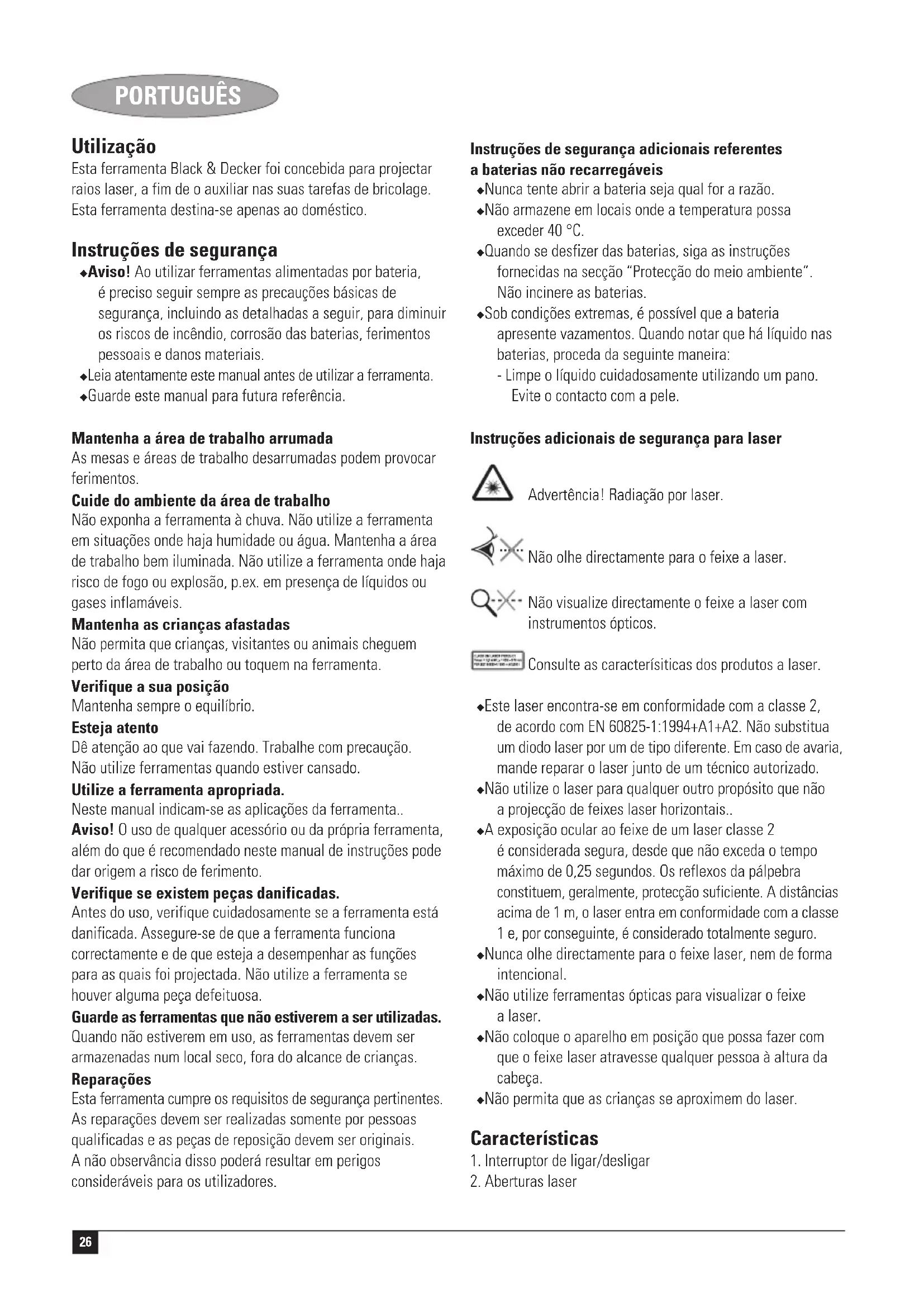 Kevin Hewitt Director de Ingeniería Spennymoor, County Durham DL16 6JG, United Kingdom 1-12-2004 Garantía Black & Decker confía plenamente en la calidad de sus productos y ofrece una garantía extraordinaria. Esta declaración de garantía es una añadido, y en ningún caso un perjuicio para sus derechos estatutarios. La garantía es válida dentro de los territorios de los Estados Miembros de la Unión Europea y de los de la Zona Europea de Libre Comercio. Si un producto Black & Decker resultará defectuoso debido a materiales o mano de obra defectuosos o a la falta de conformidad, Black & Decker garantiza, dentro de los 24 meses de la fecha de compra, la sustitución de las piezas defectuosas, la reparación de los productos sujetos a un desgaste y rotura razonables o la sustitución de tales productos para garantizar al cliente el mínimo de inconvenientes, a menos que:25 ESPAÑOL ◆ El producto haya sido utilizado con propósitos comerciales, profesionales o de alquiler; ◆ El producto haya sido sometido a un uso inadecuado o negligente; ◆ El producto haya sufrido daños causados por objetos o sustancias extrañas o accidentes; ◆ Se hayan realizado reparaciones por parte de personas que no sean los servicios de reparación autorizados o personal de servicios de Black & Decker; Para reclamar en garantía, será necesario que presente la prueba de compra al vendedor o al servicio técnico de reparaciones autorizado. Pueden consultar la dirección de su servicio técnico más cercano poniéndose en contacto con la oficina local de Black & Decker en la dirección que se indica en este manual. Como alternativa, se puede consultar en Internet, en la dirección siguiente, la lista de servicios técnicos autorizados e información completa de nuestros servicios de postventa y contactos: www.2helpU.com Visite nuestro sitio web www.blackanddecker.com para registrar su nuevo producto Black & Decker y mantenerse al día sobre nuestros productos y ofertas especiales. Encontrará información adicional sobre la marca Black & Decker y nuestra gama de productos en www.blackanddecker.com26 PORTUGUÊS Utilização Esta ferramenta Black & Decker foi concebida para projectar raios laser, a fim de o auxiliar nas suas tarefas de bricolage. Esta ferramenta destina-se apenas ao doméstico. Instruções de segurança ◆ Aviso! Ao utilizar ferramentas alimentadas por bateria, é preciso seguir sempre as precauções básicas de segurança, incluindo as detalhadas a seguir, para diminuir os riscos de incêndio, corrosão das baterias, ferimentos pessoais e danos materiais. ◆ Leia atentamente este manual antes de utilizar a ferramenta. ◆ Guarde este manual para futura referência. Mantenha a área de trabalho arrumada As mesas e áreas de trabalho desarrumadas podem provocar ferimentos. Cuide do ambiente da área de trabalho Não exponha a ferramenta à chuva. Não utilize a ferramenta em situações onde haja humidade ou água. Mantenha a área de trabalho bem iluminada. Não utilize a ferramenta onde haja risco de fogo ou explosão, p.ex. em presença de líquidos ou gases inflamáveis. Mantenha as crianças afastadas Não permita que crianças, visitantes ou animais cheguem perto da área de trabalho ou toquem na ferramenta. Verifique a sua posição Mantenha sempre o equilíbrio. Esteja atento Dê atenção ao que vai fazendo. Trabalhe com precaução. Não utilize ferramentas quando estiver cansado. Utilize a ferramenta apropriada. Neste manual indicam-se as aplicações da ferramenta.. Aviso! O uso de qualquer acessório ou da própria ferramenta, além do que é recomendado neste manual de instruções pode dar origem a risco de ferimento. Verifique se existem peças danificadas. Antes do uso, verifique cuidadosamente se a ferramenta está danificada. Assegure-se de que a ferramenta funciona correctamente e de que esteja a desempenhar as funções para as quais foi projectada. Não utilize a ferramenta se houver alguma peça defeituosa. Guarde as ferramentas que não estiverem a ser utilizadas. Quando não estiverem em uso, as ferramentas devem ser armazenadas num local seco, fora do alcance de crianças. Reparações Esta ferramenta cumpre os requisitos de segurança pertinentes. As reparações devem ser realizadas somente por pessoas qualificadas e as peças de reposição devem ser originais. A não observância disso poderá resultar em perigos consideráveis para os utilizadores. Instruções de segurança adicionais referentes a baterias não recarregáveis ◆ Nunca tente abrir a bateria seja qual for a razão. ◆ Não armazene em locais onde a temperatura possa exceder 40 °C. ◆ Quando se desfizer das baterias, siga as instruções fornecidas na secção “Protecção do meio ambiente”. Não incinere as baterias. ◆ Sob condições extremas, é possível que a bateria apresente vazamentos. Quando notar que há líquido nas baterias, proceda da seguinte maneira: - Limpe o líquido cuidadosamente utilizando um pano. Evite o contacto com a pele. Instruções adicionais de segurança para laser Advertência! Radiação por laser. Não olhe directamente para o feixe a laser. Não visualize directamente o feixe a laser com instrumentos ópticos. Consulte as caracterísiticas dos produtos a laser. ◆ Este laser encontra-se em conformidade com a classe 2, de acordo com EN 60825-1:1994+A1+A2. Não substitua um diodo laser por um de tipo diferente. Em caso de avaria, mande reparar o laser junto de um técnico autorizado. ◆ Não utilize o laser para qualquer outro propósito que não a projecção de feixes laser horizontais.. ◆ A exposição ocular ao feixe de um laser classe 2 é considerada segura, desde que não exceda o tempo máximo de 0,25 segundos. Os reflexos da pálpebra constituem, geralmente, protecção suficiente. A distâncias acima de 1 m, o laser entra em conformidade com a classe 1 e, por conseguinte, é considerado totalmente seguro. ◆ Nunca olhe directamente 