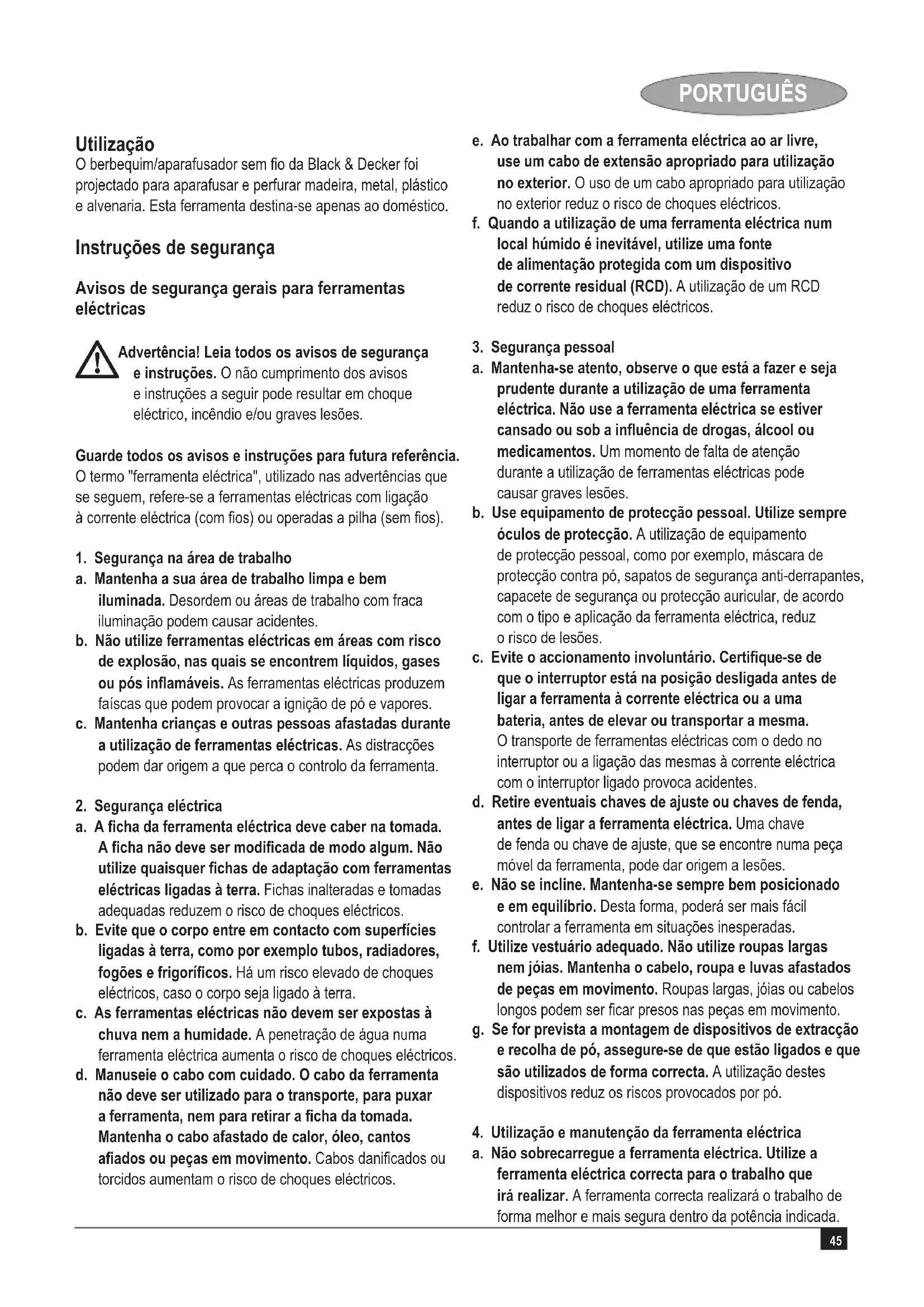 Kevin HewittDirector de Engenharia do ConsumoSpennymoor, County Durham DL16 6JG,Reino Unido1-9-2007 Garantia A Black & Decker confia na qualidade de seus produtos e oferece um programa de garantia excelente. Esta declaração de garantia soma-se aos seus direitos legais e não os prejudica em nenhum aspecto. A garantia será válida nos territórios dos Estados Membros da União Europeia e na Área de Livre Comércio da Europa.51 PORTUGUÊS Caso algum produto da Black & Decker apresente avarias devido a defeitos de material, mão-de-obra ou ausência de conformidade no prazo de 24 meses a partir da data de compra, a Black & Decker garantirá a substituição das peças defeituosas, a reparação dos produtos que foram submetidos a uso adequado e remoção ou substituição dos mesmos para assegurar o mínimo de inconvenientes ao cliente a menos que: O produto tenha sido utilizado para fins comerciais, profissionais ou aluguer; O produto tenha sido submetido a uso incorrecto ou descuido; O produto tenha sofrido danos causados por objectos estranhos, substâncias ou acidentes; Tenha um histórico de reparacões efectuadas por terceiros que não sejam os agentes autorizados ou profissionais de manutenção da Black & Decker. Para activar a garantia, será necessário enviar a prova de compra ao revendedor ou agente de reparação autorizado. Para verificar a localização do agente de reparação mais próximo de si contacte o escritório local da Black & Decker no endereço indicado neste manual. Se preferir, consulte a lista de agentes autorizados da Black & Decker e os dados completos de nossos serviços de atendimento pós-venda na Internet no endereço: www.2helpU.com Visite o nosso website www.blackanddecker.eu para registar o seu novo produto Black & Decker e para se manter actualizado sobre novos produtos e ofertas especiais. Estão disponíveis mais informações sobre a Black & Decker e sobre a nossa gama de produtos em www.blackanddecker.eu52 SVENSKA Användningsområde Din borrskruvdragare från Black & Decker har tagits fram för skruvdragningstillämpningar och för borrning i trä, metall, plast och mjukare byggnadssten. Verktyget är endast avsett som konsumentverktyg. Säkerhetsregler Allmänna säkerhetsvarningar för motordrivna verktyg