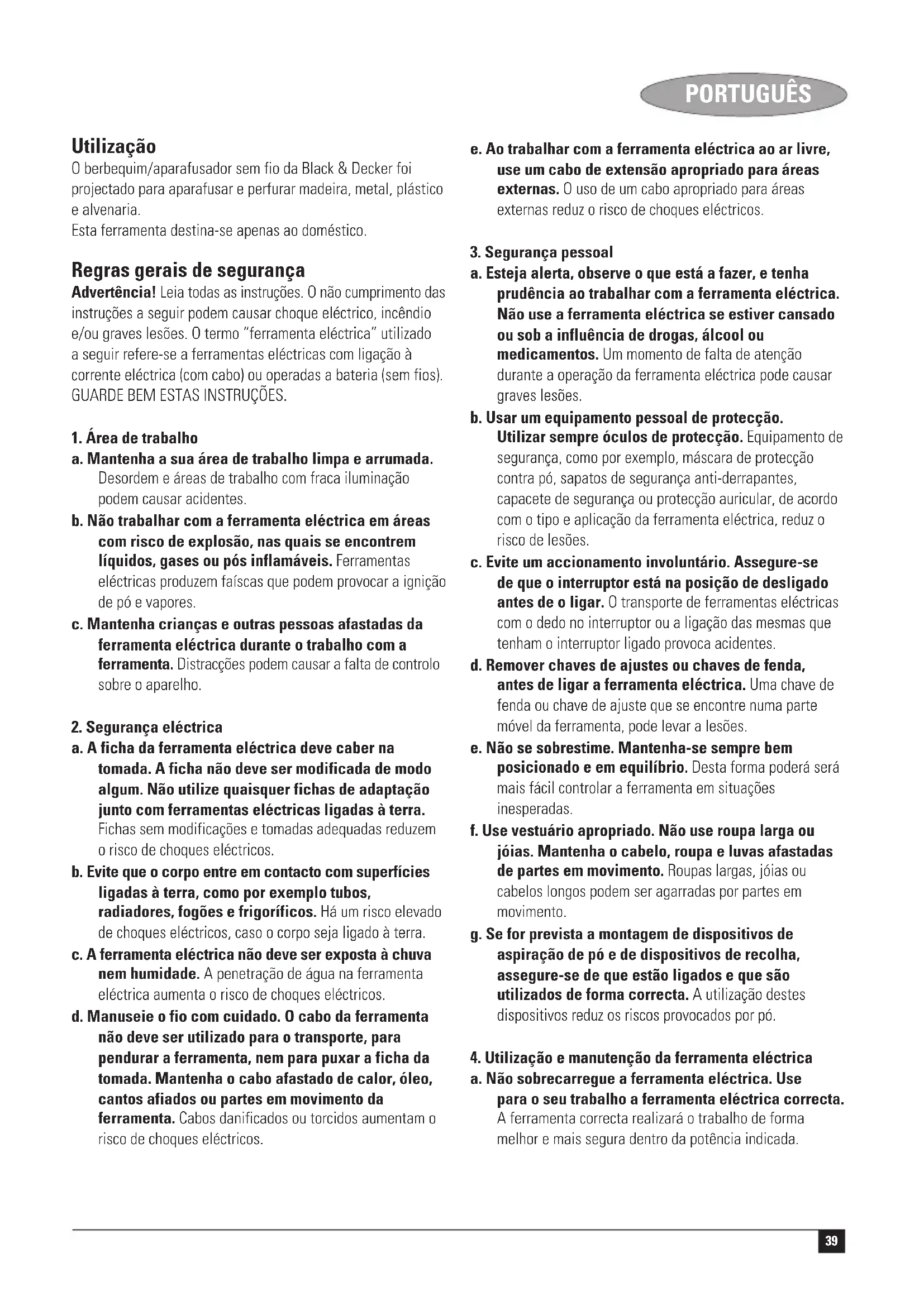 a. A sua ferramenta eléctrica só deve ser reparada por pessoal qualificado e só devem ser colocadas peças sobressalentes originais. Desta forma é assegurada a segurança da ferramenta eléctrica. Instruções adicionais de segurança para baterias e carregadores Baterias ◆ Nunca tente abrir a bateria seja qual for a razão. ◆ Não deixe que a bateria entre em contacto com a água. ◆ Não armazene em locais onde a temperatura possa exceder 40 °C. ◆ Carregue somente à temperatura ambiente entre 4 °C e 40 °C. ◆ Carregue somente utilizando o carregador fornecido com a ferramenta. ◆ Quando se desfizer das baterias, siga as instruções fornecidas na secção “Protecção do meio ambiente”. ◆ Sob condições extremas, é possível que a bateria apresente corrusão. Quando notar que há líquido na bateria, proceda da seguinte maneira: - Limpe o líquido cuidadosamente utilizando um pano. Evite o contacto com a pele. - Em caso de contacto com a pele ou com os olhos, siga as instruções abaixo. Advertência! O líquido da bateria, uma solução de hidróxido de potássio de 25-30%, pode ser nocivo. Em caso de contacto com a pele, lave imediatamente com água. Neutralize com um ácido suave, como sumo de limão ou vinagre. Em caso de contacto com os olhos, enxagúe abundantemente com água limpa durante 10 minutos. Consulte um médico. ◆ Não exponha a bateria ao fogo. ◆ Não tente carregar baterias danificadas.41 PORTUGUÊS Carregadores ◆ Utilize seu carregador Black & Decker somente para carregar as baterias do tipo fornecido com sua ferramenta. Outras baterias poderiam explodir causando danos pessoais e estragos. ◆ Nunca tente carregar baterias não recarregáveis. ◆ Substitua os cabos defeituosos imediatamente. ◆ Não deixe que o carregador entre em contacto com a água. ◆ Não abra o carregador. ◆ Não submeta o carregador a testes. O carregador destina-se apenas ao uso doméstico. Segurança eléctrica O seu carregador está duplamente isolado, pelo que não é necessário fio de terra. Verifique sempre se a tensão eléctrica corresponde à indicada na placa de especificação eléctrica. Nunca tente substituir o carregador por uma tomada normal. Instruções adicionais de segurança para berbequins/ aparafusadoras ◆ Antes de perfurar paredes, pisos ou tectos, verifique a localização de fios e canos. ◆ Evite tocar na ponta da broca imediatamente após perfurar, pois esta pode estar quente. Características Esta ferramenta inclui algumas ou todas as seguintes funções.