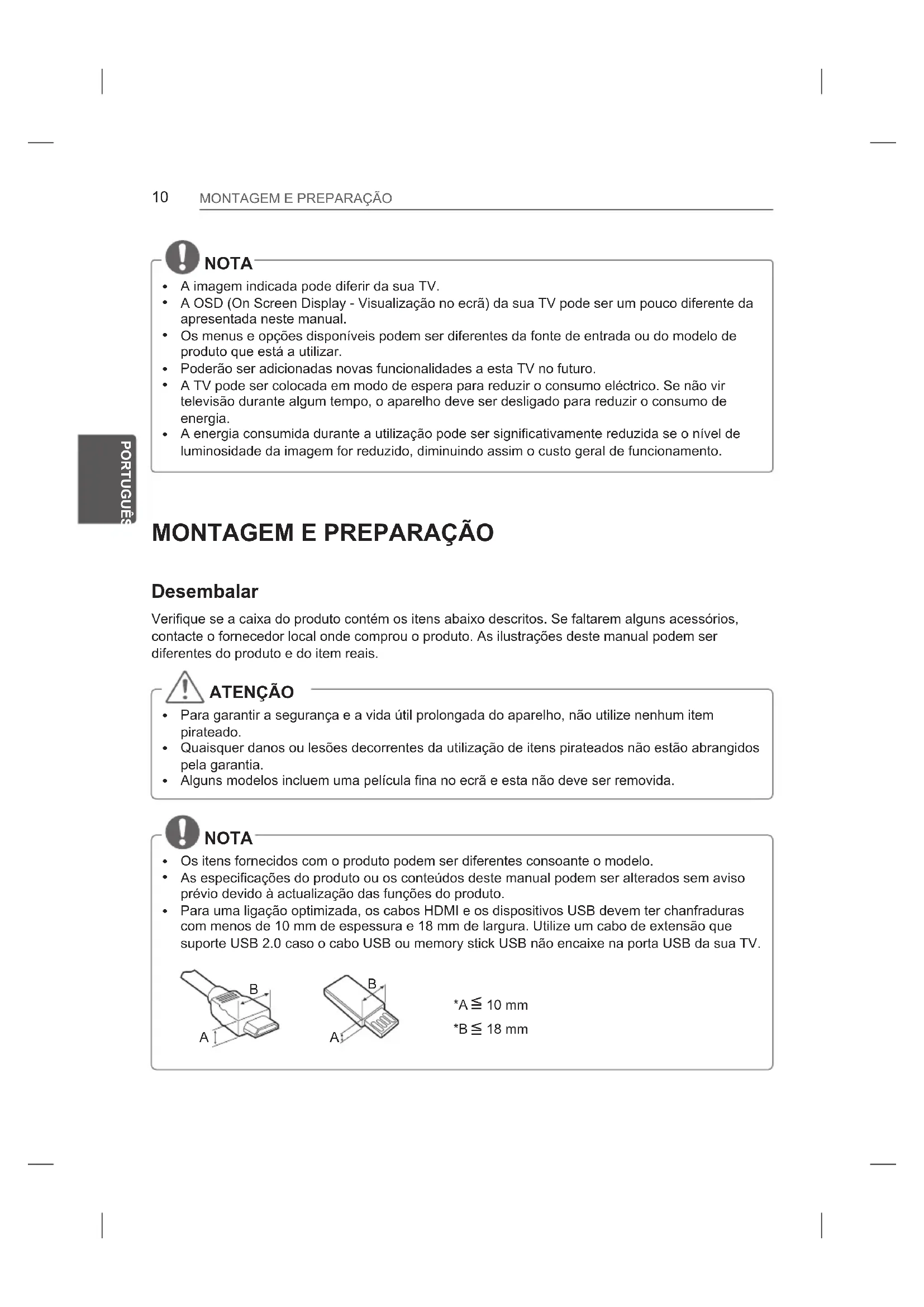 Para uma ligação optimizada, os cabos HDMI e os dispositivos USB devem ter chanfraduras com menos de 10 mm de espessura e 18 mm de largura. Utilize um cabo de extensão que suporte USB 2.0 caso o cabo USB ou memory stick USB não encaixe na porta USB da sua TV. *A 10 mm *B 18 mm