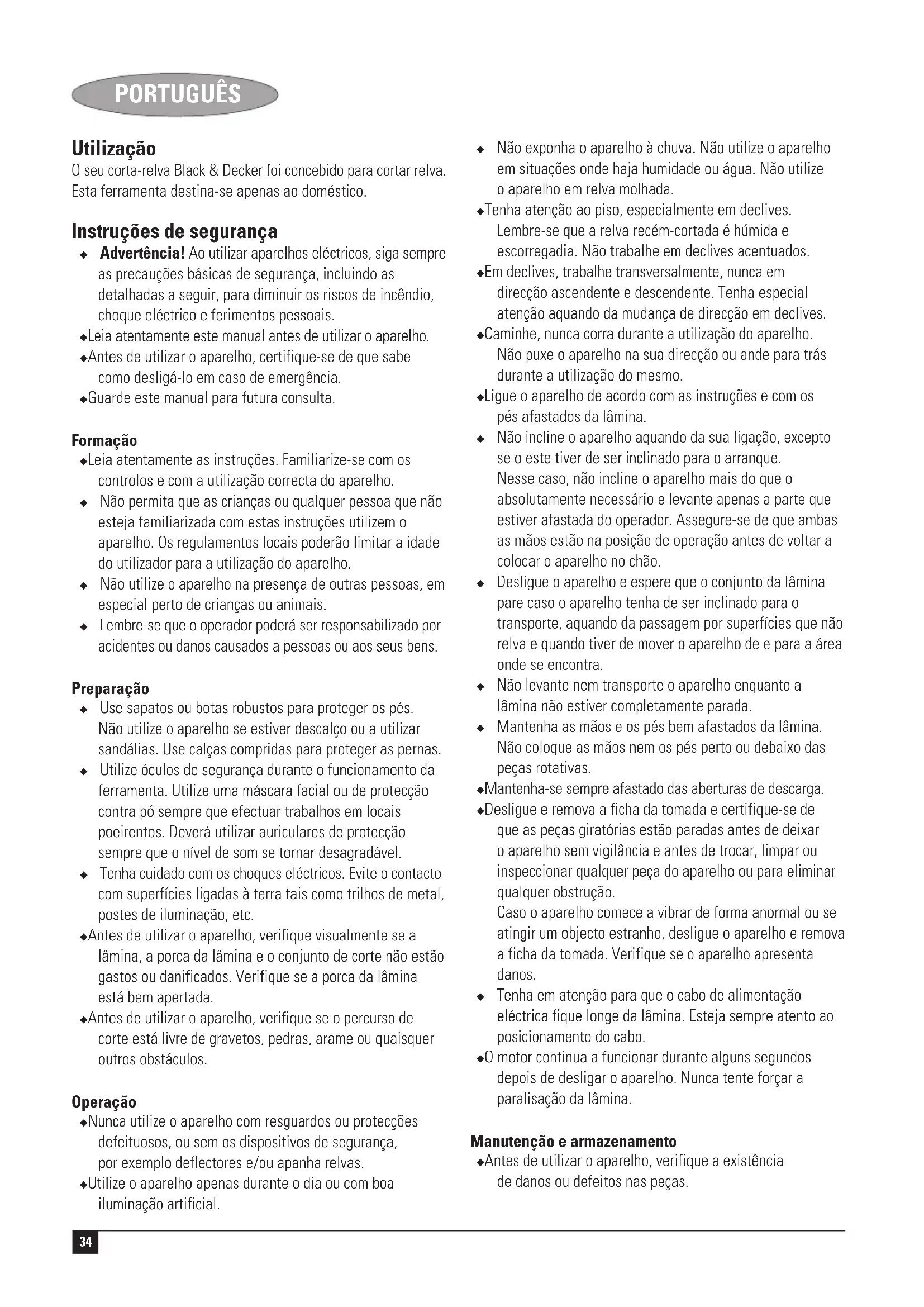 Kevin Hewitt Director de Ingeniería del Consumidor Spennymoor, County Durham DL16 6JG, Reino Unido 1-8-2004 Garantía Black & Decker confía plenamente en la calidad de sus productos y ofrece una garantía extraordinaria. Esta declaración de garantía es una añadido, y en ningún caso un perjuicio para sus derechos estatutarios. La garantía es válida dentro de los territorios de los Estados Miembros de la Unión Europea y de los de la Zona Europea de Libre Comercio. Si un producto Black & Decker resultará defectuoso debido a materiales o mano de obra defectuosos o a la falta de conformidad, Black & Decker garantiza, dentro de los 24 meses de la fecha de compra, la sustitución de las piezas defectuosas, la reparación de los productos sujetos a un desgaste y rotura razonables o la sustitución de tales productos para garantizar al cliente el mínimo de inconvenientes, a menos que: ◆ El producto haya sido utilizado con propósitos comerciales, profesionales o de alquiler; ◆ El producto haya sido sometido a un uso inadecuado o negligente; ◆ El producto haya sufrido daños causados por objetos o sustancias extrañas o accidentes; ◆ Se hayan realizado reparaciones por parte de personas que no sean los servicios de reparación autorizados o personal de servicios de Black & Decker; Para reclamar en garantía, será necesario que presente la prueba de compra al vendedor o al servicio técnico de reparaciones autorizado. Pueden consultar la dirección de su servicio técnico más cercano poniéndose en contacto con la oficina local de Black & Decker en la dirección que se indica en este manual. Como alternativa, se puede consultar en Internet, en la dirección siguiente, la lista de servicios técnicos autorizados e información completa de nuestros servicios de postventa y contactos: www.2helpU.com Visite nuestro sitio web www.blackanddecker.com para registrar su nuevo producto Black & Decker y mantenerse al día sobre nuestros productos y ofertas especiales. Encontrará información adicional sobre la marca Black & Decker y nuestra gama de productos en www.blackanddecker.com34 PORTUGUÊS Utilização O seu corta-relva Black & Decker foi concebido para cortar relva. Esta ferramenta destina-se apenas ao doméstico. Instruções de segurança ◆ Advertência! Ao utilizar aparelhos eléctricos, siga sempre as precauções básicas de segurança, incluindo as detalhadas a seguir, para diminuir os riscos de incêndio, choque eléctrico e ferimentos pessoais. ◆ Leia atentamente este manual antes de utilizar o aparelho. ◆ Antes de utilizar o aparelho, certifique-se de que sabe como desligá-lo em caso de emergência. ◆ Guarde este manual para futura consulta. Formação ◆ Leia atentamente as instruções. Familiarize-se com os controlos e com a utilização correcta do aparelho. ◆ Não permita que as crianças ou qualquer pessoa que não esteja familiarizada com estas instruções utilizem o aparelho. Os regulamentos locais poderão limitar a idade do utilizador para a utilização do aparelho. ◆ Não utilize o aparelho na presença de outras pessoas, em especial perto de crianças ou animais. ◆ Lembre-se que o operador poderá ser responsabilizado por acidentes ou danos causados a pessoas ou aos seus bens. Preparação ◆ Use sapatos ou botas robustos para proteger os pés. Não utilize o aparelho se estiver descalço ou a utilizar sandálias. Use calças compridas para proteger as pernas. ◆ Utilize óculos de segurança durante o funcionamento da ferramenta. Utilize uma máscara facial ou de protecção contra pó sempre que efectuar trabalhos em locais poeirentos. Deverá utilizar auriculares de protecção sempre que o nível de som se tornar desagradável. ◆ Tenha cuidado com os choques eléctricos. Evite o contacto com superfícies ligadas à terra tais como trilhos de metal, postes de iluminação, etc. ◆ Antes de utilizar o aparelho, verifique visualmente se a lâmina, a porca da lâmina e o conjunto de corte não estão gastos ou danificados. Verifique se a porca da lâmina está bem apertada. ◆ Antes de utilizar o aparelho, verifique se o percurso de corte está livre de gravetos, pedras, arame ou quaisquer outros obstáculos. Operação ◆ Nunca utilize o aparelho com resguardos ou protecções defeituosos, ou sem os dispositivos de segurança, por exemplo deflectores e/ou apanha relvas. ◆ Utilize o aparelho apenas durante o dia ou com boa iluminação artificial. ◆ Não exponha o aparelho à chuva. Não utilize o aparelho em situações onde haja humidade ou água. Não utilize o aparelho em relva molhada. ◆ Tenha atenção ao piso, especialmente em declives. Lembre-se que a relva recém-cortada é húmida e escorregadia. Não trabalhe em declives acentuados. ◆ Em declives, trabalhe transversalmente, nunca em direcção ascendente e descendente. Tenha especial atenção aquando da mudança de direcção em declives. ◆ Caminhe, nunca corra durante a utilização do aparelho. Não puxe o aparelho na sua direcção ou ande para trás durante a utilização do mesmo. ◆ Ligue o aparelho de acordo com as instruções e com os pés afastados da lâmina. ◆ Não incline o aparelho aquando da sua ligação, excepto se o este tiver de ser inclinado para o arranque. Nesse caso, não incline o aparelho mais do que o absolutamente necessário e levante apenas a parte que estiver afastada do operador. Assegure-se de que ambas as mãos estão na posição de operação antes de voltar a colocar o aparelho no chão. ◆ Desligue o aparelho e espere que o conjunto da lâmina pare caso o aparelho tenha de ser inclinado para o transporte, aquando da passagem por superfícies que não relva e quando tiver de mover o aparelho de e para a área onde se encontra. ◆ Não levante nem transporte o aparelho enquanto a lâmina não estiver completamente parada. ◆ Mantenha as mãos e os pés bem afastados da lâmina. Não coloque as mãos nem os pés perto ou de