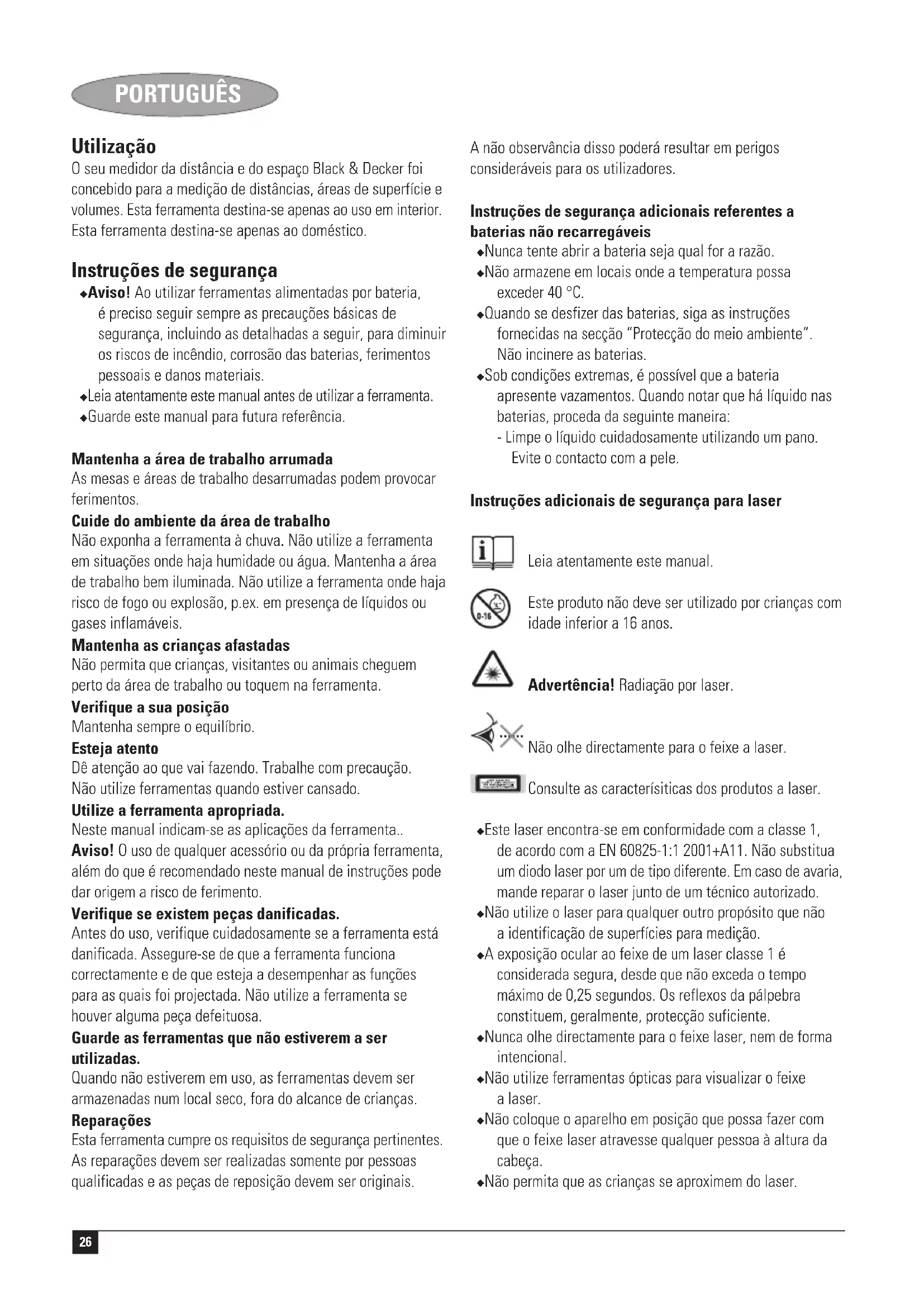 Kevin Hewitt Director de Ingeniería Spennymoor, County Durham DL16 6JG, United Kingdom 1-11-2004 Garantía Black & Decker confía plenamente en la calidad de sus productos y ofrece una garantía extraordinaria. Esta declaración de garantía es una añadido, y en ningún caso un perjuicio para sus derechos estatutarios. La garantía es válida dentro de los territorios de los Estados Miembros de la Unión Europea y de los de la Zona Europea de Libre Comercio. Si un producto Black & Decker resultará defectuoso debido a materiales o mano de obra defectuosos o a la falta de conformidad, Black & Decker garantiza, dentro de los 24 meses de la fecha de compra, la sustitución de las piezas defectuosas, la reparación de los productos sujetos a un desgaste y rotura razonables o la sustitución de tales productos para garantizar al cliente el mínimo de inconvenientes, a menos que:25 ESPAÑOL ◆ El producto haya sido utilizado con propósitos comerciales, profesionales o de alquiler; ◆ El producto haya sido sometido a un uso inadecuado o negligente; ◆ El producto haya sufrido daños causados por objetos o sustancias extrañas o accidentes; ◆ Se hayan realizado reparaciones por parte de personas que no sean los servicios de reparación autorizados o personal de servicios de Black & Decker; Para reclamar en garantía, será necesario que presente la prueba de compra al vendedor o al servicio técnico de reparaciones autorizado. Pueden consultar la dirección de su servicio técnico más cercano poniéndose en contacto con la oficina local de Black & Decker en la dirección que se indica en este manual. Como alternativa, se puede consultar en Internet, en la dirección siguiente, la lista de servicios técnicos autorizados e información completa de nuestros servicios de postventa y contactos: www.2helpU.com Visite nuestro sitio web www.blackanddecker.com para registrar su nuevo producto Black & Decker y mantenerse al día sobre nuestros productos y ofertas especiales. Encontrará información adicional sobre la marca Black & Decker y nuestra gama de productos en www.blackanddecker.com26 PORTUGUÊS Utilização O seu medidor da distância e do espaço Black & Decker foi concebido para a medição de distâncias, áreas de superfície e volumes. Esta ferramenta destina-se apenas ao uso em interior. Esta ferramenta destina-se apenas ao doméstico. Instruções de segurança ◆ Aviso! Ao utilizar ferramentas alimentadas por bateria, é preciso seguir sempre as precauções básicas de segurança, incluindo as detalhadas a seguir, para diminuir os riscos de incêndio, corrosão das baterias, ferimentos pessoais e danos materiais. ◆ Leia atentamente este manual antes de utilizar a ferramenta. ◆ Guarde este manual para futura referência. Mantenha a área de trabalho arrumada As mesas e áreas de trabalho desarrumadas podem provocar ferimentos. Cuide do ambiente da área de trabalho Não exponha a ferramenta à chuva. Não utilize a ferramenta em situações onde haja humidade ou água. Mantenha a área de trabalho bem iluminada. Não utilize a ferramenta onde haja risco de fogo ou explosão, p.ex. em presença de líquidos ou gases inflamáveis. Mantenha as crianças afastadas Não permita que crianças, visitantes ou animais cheguem perto da área de trabalho ou toquem na ferramenta. Verifique a sua posição Mantenha sempre o equilíbrio. Esteja atento Dê atenção ao que vai fazendo. Trabalhe com precaução. Não utilize ferramentas quando estiver cansado. Utilize a ferramenta apropriada. Neste manual indicam-se as aplicações da ferramenta.. Aviso! O uso de qualquer acessório ou da própria ferramenta, além do que é recomendado neste manual de instruções pode dar origem a risco de ferimento. Verifique se existem peças danificadas. Antes do uso, verifique cuidadosamente se a ferramenta está danificada. Assegure-se de que a ferramenta funciona correctamente e de que esteja a desempenhar as funções para as quais foi projectada. Não utilize a ferramenta se houver alguma peça defeituosa. Guarde as ferramentas que não estiverem a ser utilizadas. Quando não estiverem em uso, as ferramentas devem ser armazenadas num local seco, fora do alcance de crianças. Reparações Esta ferramenta cumpre os requisitos de segurança pertinentes. As reparações devem ser realizadas somente por pessoas qualificadas e as peças de reposição devem ser originais. A não observância disso poderá resultar em perigos consideráveis para os utilizadores. Instruções de segurança adicionais referentes a baterias não recarregáveis ◆ Nunca tente abrir a bateria seja qual for a razão. ◆ Não armazene em locais onde a temperatura possa exceder 40 °C. ◆ Quando se desfizer das baterias, siga as instruções fornecidas na secção “Protecção do meio ambiente”. Não incinere as baterias. ◆ Sob condições extremas, é possível que a bateria apresente vazamentos. Quando notar que há líquido nas baterias, proceda da seguinte maneira: - Limpe o líquido cuidadosamente utilizando um pano. Evite o contacto com a pele. Instruções adicionais de segurança para laser Leia atentamente este manual. Este produto não deve ser utilizado por crianças com idade inferior a 16 anos. Advertência! Radiação por laser. Não olhe directamente para o feixe a laser. Consulte as caracterísiticas dos produtos a laser. ◆ Este laser encontra-se em conformidade com a classe 1, de acordo com a EN 60825-1:1 2001+A11. Não substitua um diodo laser por um de tipo diferente. Em caso de avaria, mande reparar o laser junto de um técnico autorizado. ◆ Não utilize o laser para qualquer outro propósito que não a identificação de superfícies para medição. ◆ A exposição ocular ao feixe de um laser classe 1 é considerada segura, desde que não exceda o tempo máximo de 0,25 segundos. Os reflexos da pálpebra constituem, geralmente, protecção suficiente. ◆ Nunca olhe directamente para o feixe 