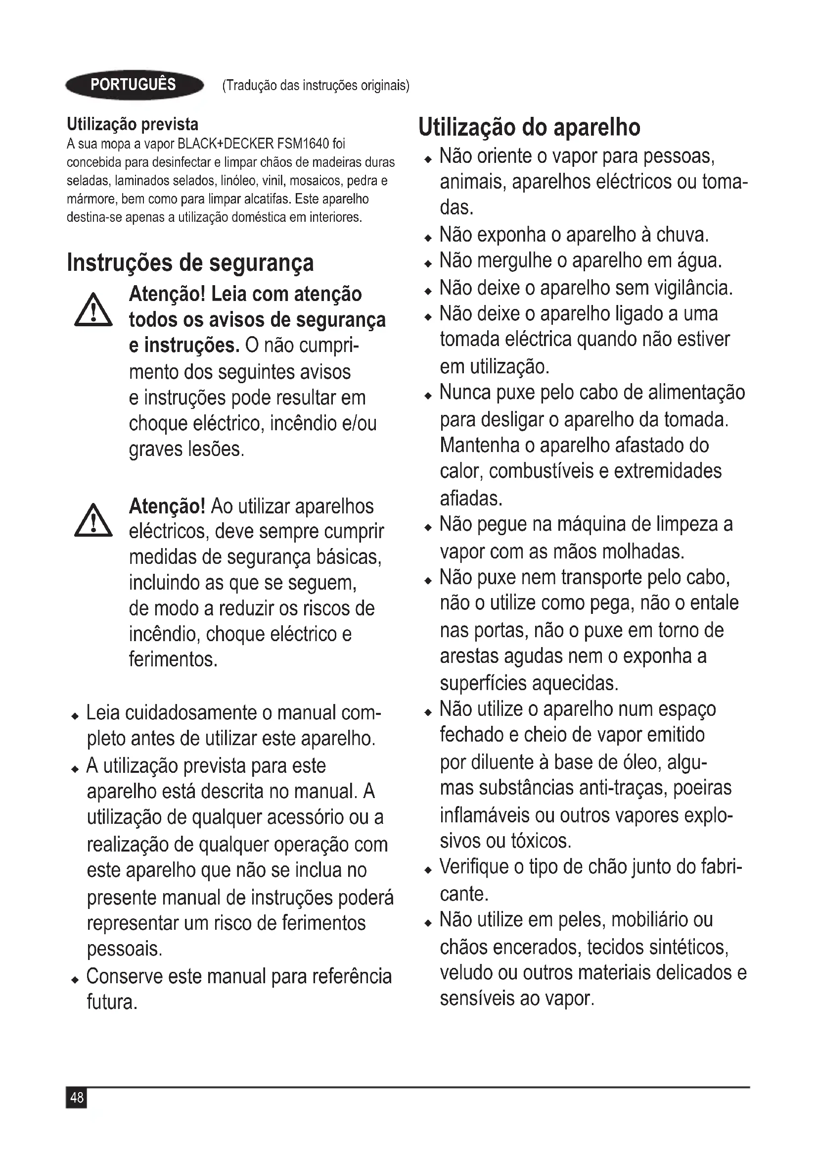 Atenção! Ao utilizar aparelhos eléctricos, deve sempre cumprir medidas de segurança básicas, incluindo as que se seguem, de modo a reduzir os riscos de incêndio, choque eléctrico e ferimentos. u Leia cuidadosamente o manual com- pleto antes de utilizar este aparelho. u A utilização prevista para este aparelho está descrita no manual. A utilização de qualquer acessório ou a realização de qualquer operação com este aparelho que não se inclua no presente manual de instruções poderá representar um risco de ferimentos pessoais. u Conserve este manual para referência futura. Utilização do aparelho u Não oriente o vapor para pessoas, animais, aparelhos eléctricos ou toma- das. u Não exponha o aparelho à chuva.u Não mergulhe o aparelho em água.u Não deixe o aparelho sem vigilância.u Não deixe o aparelho ligado a uma tomada eléctrica quando não estiver em utilização. u Nunca puxe pelo cabo de alimentação para desligar o aparelho da tomada. Mantenha o aparelho afastado do calor, combustíveis e extremidades aadas. u Não pegue na máquina de limpeza a vapor com as mãos molhadas. u Não puxe nem transporte pelo cabo, não o utilize como pega, não o entale nas portas, não o puxe em torno de arestas agudas nem o exponha a superfícies aquecidas. u Não utilize o aparelho num espaço fechado e cheio de vapor emitido por diluente à base de óleo, algu- mas substâncias anti-traças, poeiras inamáveis ou outros vapores explo- sivos ou tóxicos. u Verique o tipo de chão junto do fabri- cante. u Não utilize em peles, mobiliário ou chãos encerados, tecidos sintéticos, veludo ou outros materiais delicados e sensíveis ao vapor.49 (Tradução das instruções originais) PORTUGUÊS