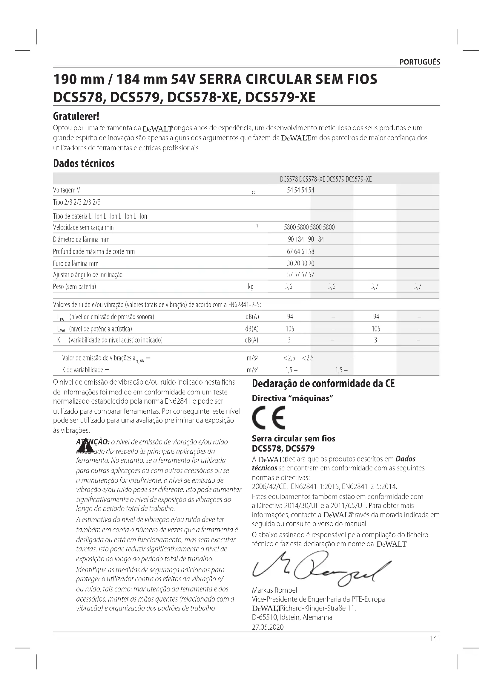 DeWALT declara que os produtos descritos em Dados técnicos se encontram em conformidade com as seguintes normas e directivas: 2006/42/CE, EN62841-1:2015, EN62841-2-5:2014. Estes equipamentos também estão em conformidade com a Directiva 2014/30/UE e a 2011/65/UE. Para obter mais informações, contacte a DeWALT através da morada indicada em seguida ou consulte o verso domanual. O abaixo assinado é responsável pela compilação do ficheiro técnico e faz esta declaração em nome da DeWALT