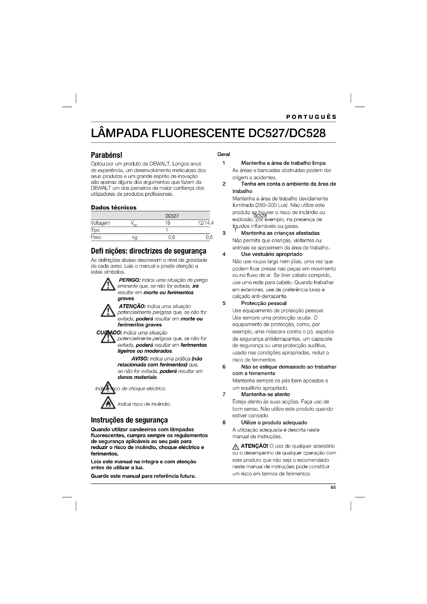 18 12/14,4 Tipo 1 1 Peso kg 0,6 0,6 Defi nições: directrizes de segurança As definições abaixo descrevem o nível de gravidade de cada aviso. Leia o manual e preste atenção a estes símbolos. PERIGO: indica uma situação de perigo eminente que, se não for evitada, irá resultar em morte ou ferimentos graves. ATENÇÃO: indica uma situação potencialmente perigosa que, se não for evitada, poderá resultar em morte ou ferimentos graves. CUIDADO: indica uma situação potencialmente perigosa que, se não for evitada, poderá resultar em ferimentos ligeiros ou moderados. AVISO: indica uma prática (não relacionada com ferimentos) que, se não for evitada, poderá resultar em danos materiais. Indica risco de choque eléctrico. Indica risco de incêndio. Instruções de segurança Quando utilizar candeeiros com lâmpadas fluorescentes, cumpra sempre os regulamentos de segurança aplicáveis ao seu país para reduzir o risco de incêndio, choque eléctrico e ferimentos. Leia este manual na íntegra e com atenção antes de utilizar a luz. Guarde este manual para referência futura. Geral 1 Mantenha a área de trabalho limpa As áreas e bancadas obstruídas podem dar origem a acidentes. 2 Tenha em conta o ambiente da área de trabalho Mantenha a área de trabalho devidamente iluminada (250–300 Lux). Não utilize este produto se houver o risco de incêndio ou explosão, por exemplo, na presença de líquidos infl amáveis ou gases. 3 Mantenha as crianças afastadas Não permita que crianças, visitantes ou animais se aproximem da área de trabalho. 4 Use vestuário apropriado Não use roupa larga nem jóias, uma vez que podem fi car presas nas peças em movimento ou no fl uxo de ar. Se tiver cabelo comprido, use uma rede para cabelo. Quando trabalhar em exteriores, use de preferência luvas e calçado anti-derrapante. 5 Protecção pessoal Use equipamento de protecção pessoal. Use sempre uma protecção ocular. O equipamento de protecção, como, por exemplo, uma máscara contra o pó, sapatos de segurança antiderrapantes, um capacete de segurança ou uma protecção auditiva, usado nas condições apropriadas, reduz o risco de ferimentos. 6 Não se estique demasiado ao trabalhar com a ferramenta Mantenha sempre os pés bem apoiados e um equilíbrio apropriado. 7 Mantenha-se atento Esteja atento às suas acções. Faça uso de bom senso. Não utilize este produto quando estiver cansado. 8 Utilize o produto adequado A utilização adequada é descrita neste manual de instruções. ATENÇÃO! O uso de qualquer acessório ou o desempenho de qualquer operação com este produto que não seja o recomendado neste manual de instruções pode constituir um risco em termos de ferimentos. PORTUGUÊS66 PORTUGUÊS 9 Verifi que se existem peças danifi cadas Antes de utilizar o produto, verifi que-o com cuidado. Verifi que se existem peças fracturadas, resguardos e interruptores danifi cados e quaisquer situações que possam afectar o respectivo funcionamento. Certifi que-se de que o produto funciona correctamente e desempenha a função pretendida. Não utilize o produto se alguma peça estiver danifi cada ou defeituosa. Não utilize o produto se o respectivo interruptor não a ligar e desligar. Envie quaisquer peças danifi cadas ou defeituosas a um agente DEWALT autorizado para reparação. Nunca tente efectuar quaisquer reparações sozinho. 10 Retire a pilha Retire a pilha quando não estiver a ser utilizada antes de mudar quaisquer peças do produto, acessórios ou dispositivos complementares e antes da reparação. 11 Armazenamento Quando não estiver a ser utilizado, este produto pode ser armazenado num local seco e devidamente fechado, fora do alcance das crianças. 12 Faça a manutenção do produto com cuidado Mantenha o produto em boas condições e proceda à limpeza para um melhor desempenho e em segurança. Siga as instruções relativas à manutenção e mudança de acessórios. Mantenha as pegas e interruptores secos, limpos e sem óleo ou massa lubrifi cante. 13 Reparação Este produto está em conformidade com os respectivos regulamentos de segurança. Leve o seu produto a um agente da DEWALT de reparação autorizado para proceder à reparação. As reparações devem ser levadas a cabo apenas por técnicos qualifi cados que utilizem peças sobresselentes; caso contrário, podem resultar em perigo considerável para o utilizador. Instruções adicionais de segurança para lâmpadas fl uorescentes