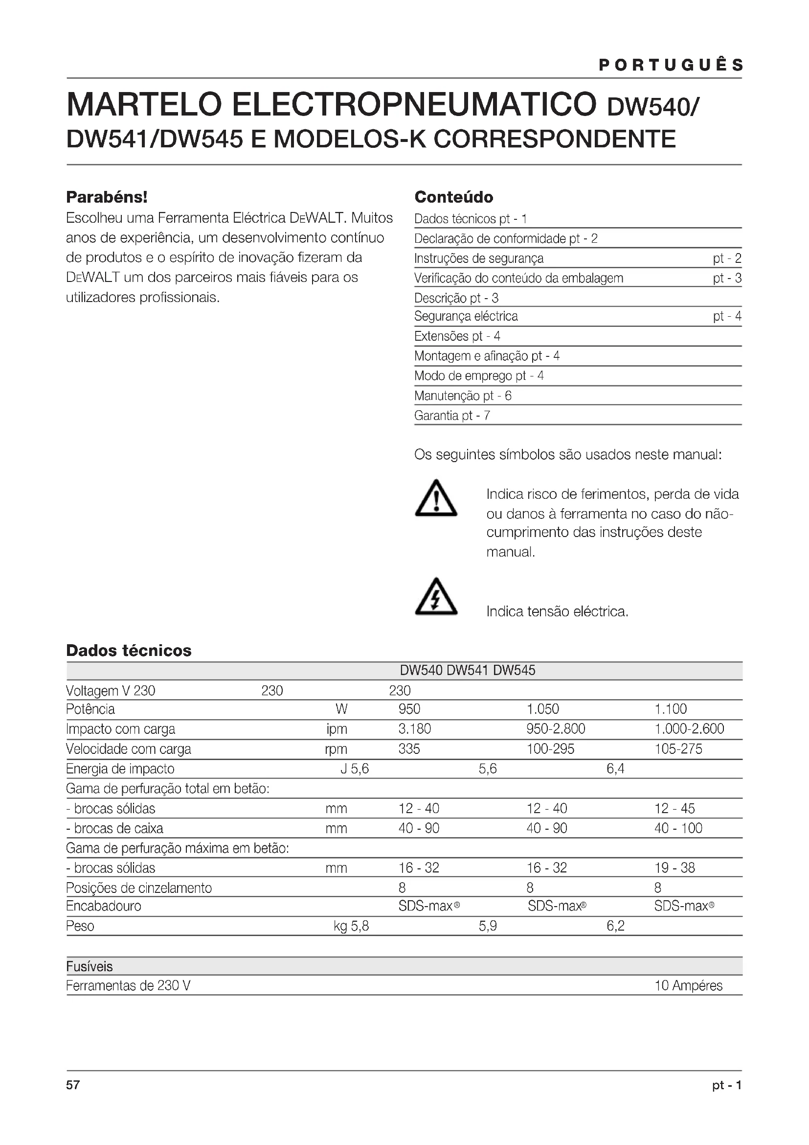 - Kvittering kan fremlegges. Denne garantien er i tillegg til kjøperens rettigheter i henhold til Kjøpsloven. Adresse til nærmeste DEWALT autoriserte serviceverksted finner du i DEWALT katalogen, eller ved å kontakte DEWALT.57 Parabéns! Escolheu uma Ferramenta Eléctrica DEWALT. Muitos anos de experiência, um desenvolvimento contínuo de produtos e o espírito de inovação fizeram da DEWALT um dos parceiros mais fiáveis para os utilizadores profissionais. Conteúdo Dados técnicos pt - 1 Declaração de conformidade pt - 2 Instruções de segurança pt - 2 Verificação do conteúdo da embalagem pt - 3 Descrição pt - 3 Segurança eléctrica pt - 4 Extensões pt - 4 Montagem e afinação pt - 4 Modo de emprego pt - 4 Manutenção pt - 6 Garantia pt - 7 Os seguintes símbolos são usados neste manual: Indica risco de ferimentos, perda de vida ou danos à ferramenta no caso do não- cumprimento das instruções deste manual. Indica tensão eléctrica. PORTUGUÊ S pt - 1