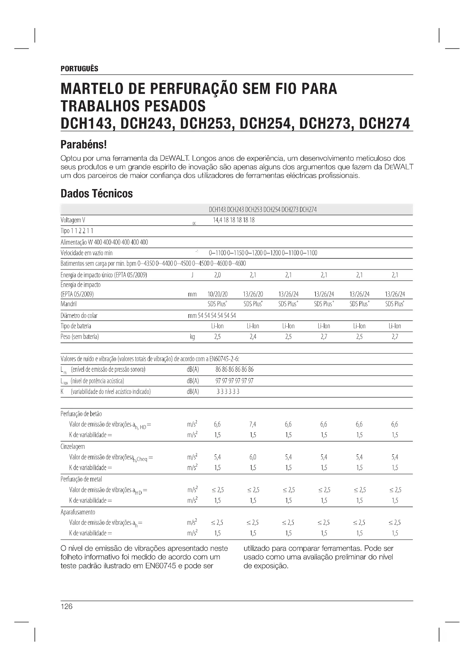 e DCH274 foram concebidos para aplicações de perfuração e batimento profissionais, bem como aparafusamento e burilagem. NÃO utilize a sua ferramenta em ambientes húmidos ou na presença de gases ou líquidosinflamáveis. Estes martelos de perfuração são ferramentas eléctricasprofissionais. NÃO permita que crianças entrem em contacto com os mesmos. É necessária supervisão quando estas ferramentas forem manuseadas por utilizadoresinexperientes. Não toque nos contactos com objectos condutores. Não carregue baterias danificadas. Não exponha o equipamento à água. Mande substituir imediatamente quaisquer cabos danificados. Carregue a bateria apenas com uma temperatura ambiente entre 4 ˚C e 40 ˚C. Apenas para uso dentro de casa. Desfaça-se da bateria de uma forma ambientalmente responsável. Carregue as baterias da DeWALT