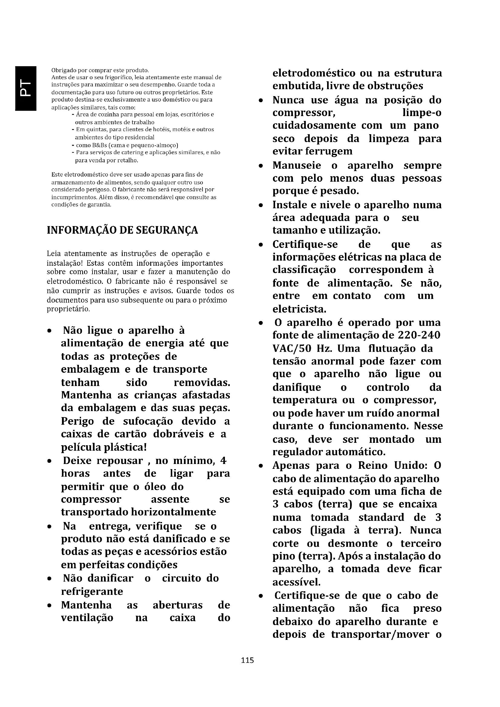 115aparelho, para evitar que o cabo seja cortado ou danificado. Se o cabo de alimentação estiver danificado, deve ser substituído pelo fabricante, pelo seu agente de serviço ou por pessoa qualificada, para evitar perigo