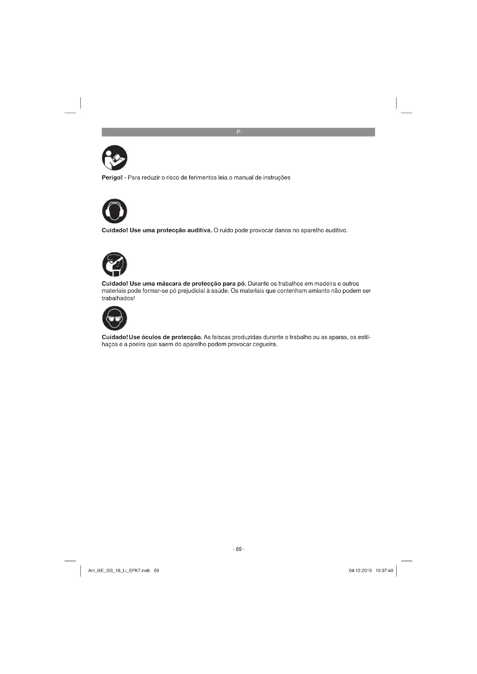 Perigo! - Para reduzir o risco de ferimentos leia o manual de instruções Cuidado! Use uma protecção auditiva. O ruído pode provocar danos no aparelho auditivo. Cuidado! Use óculos de protecção. As faíscas produzidas durante o trabalho ou as aparas, os estil- haços e a poeira que saem do aparelho podem provocar cegueira. Cuidado! Use uma máscara de protecção para pó. Durante os trabalhos em madeira e outros materiais pode formar-se pó prejudicial à saúde. Os materiais que contenham amianto não podem ser trabalhados! Anl_GE_GS_18_Li_SPK7.indb 69Anl_GE_GS_18_Li_SPK7.indb 69 04.12.2019 10:37:4004.12.2019 10:37:40P