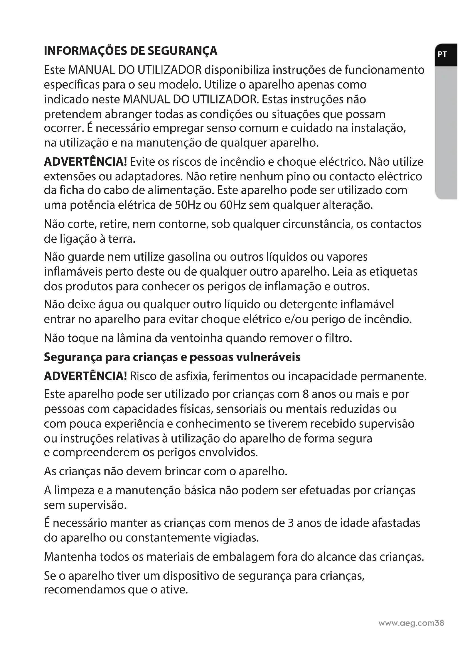 Este MANUAL DO UTILIZADOR disponibiliza instruções de funcionamento específicas para o seu modelo. Utilize o aparelho apenas como indicado neste MANUAL DO UTILIZADOR. Estas instruções não pretendem abranger todas as condições ou situações que possam ocorrer. Énecessário empregar senso comum e cuidado na instalação, nautilização e na manutenção de qualquer aparelho. ADVERTÊNCIA! Evite os riscos de incêndio e choque eléctrico. Não utilize extensões ou adaptadores. Não retire nenhum pino ou contacto eléctrico da ficha do cabo de alimentação. Este aparelho pode ser utilizado com uma potência elétrica de 50Hz ou 60Hz sem qualquer alteração. Não corte, retire, nem contorne, sob qualquer circunstância, os contactos de ligação à terra. Não guarde nem utilize gasolina ou outros líquidos ou vapores inflamáveis perto deste ou de qualquer outro aparelho. Leia as etiquetas dos produtos para conhecer os perigos de inflamação e outros. Não deixe água ou qualquer outro líquido ou detergente inflamável entrar no aparelho para evitar choque elétrico e/ou perigo de incêndio. Não toque na lâmina da ventoinha quando remover o filtro. Segurança para crianças e pessoas vulneráveis ADVERTÊNCIA! Risco de asfixia, ferimentos ou incapacidade permanente. Este aparelho pode ser utilizado por crianças com 8 anos ou mais e por pessoas com capacidades físicas, sensoriais ou mentais reduzidas ou com pouca experiência e conhecimento se tiverem recebido supervisão ou instruções relativas à utilização do aparelho de forma segura ecompreenderem os perigos envolvidos. As crianças não devem brincar com o aparelho. A limpeza e a manutenção básica não podem ser efetuadas por crianças sem supervisão. É necessário manter as crianças com menos de 3 anos de idade afastadas do aparelho ou constantemente vigiadas. Mantenha todos os materiais de embalagem fora do alcance das crianças. Se o aparelho tiver um dispositivo de segurança para crianças, recomendamos que o ative. PTwww.aeg.com 39 Informação elétrica ADVERTÊNCIA! Evite os riscos de incêndio e choque eléctrico. Se não tiver a certeza de que a tomada tem ligação à terra ou proteção suficientes por um fusível de ação retardada ou disjuntor, peça a um electricista qualificado para instalar a tomada adequada de acordo com o Código Elétrico Nacional e códigos e decretos legais aplicáveis. Não utilize cabos de extensão ou uma ficha de adaptador. Nunca desligue o aparelho puxando pelo cabo de alimentação. Pegue sempre na ficha e puxe-a a direito para fora da tomada. Não comprima, dobre, nem faça nós com o cabo dealimentação. Não corte nem danifique o cabo de alimentação. Seo cabo de alimentação estiver danificado, deve ser substituído por um técnico autorizado da AEG. Este aparelho não contém partes que possam ser reparadas pelo utilizador. Contacte sempre um técnico autorizado daAEG quando necessitar de qualquer reparação. Se o cabo de alimentação estiver danificado, deve ser substituído pelo fabricante, por um agente de assistência ou por uma pessoa igualmente qualificada, para evitar perigos. Não se esqueça de desligar o aparelho da corrente eléctrica antes de o limpar, para evitar riscos de choque eléctrico e incêndio. Precauções de segurança CUIDADO! Evitar Lesões Graves ou Morte. Não introduza nem coloque os dedos ou qualquer objeto na área de saída de ar, nem na grelha frontal do aparelho. Não desligue o cabo de alimentação, nem o disjuntor noquadro elétrico, para ligar ou desligar o aparelho. Em caso de anomalia (faíscas, cheiro a queimado, etc.), pare o aparelho imediatamente, desligue o cabo de alimentação e contacte um técnico autorizado da AEG. Não utilize o fogão com as mãos húmidas. Não puxe o cabo de alimentação. CUIDADO! Para evitar lesões ou danos ao aparelho ououtros objetos. Não direcione o fluxo de ar para lareiras ou outras fontes de calor semelhantes, porque pode provocar reacendimentos. Não se ponha em cima do aparelho, nem coloque objetos sobre a unidade. Não pendure objetos na unidade. Não coloque recipientes com líquidos sobre a unidade. Desligue o aparelho da tomada elétrica quando não pretender utilizá-lo por um longo período de tempo. Não utilize o aparelho sem ter o filtro de ar instalado. Não bloqueie nem tape a grelha de entrada de ar, aáreade saída de ar e os escoadouros. Assegure-se de que qualquer equipamento elétrico/eletrónico está a 30 cm do aparelho. ELIMINAÇÃO Este símbolo no produto indica que o produto contém uma bateria que não pode ser eliminada juntamente com os resíduos domésticos comuns. Este símbolo no produto ou na respetiva embalagem indica que o produto não pode sertratado como um resíduo doméstico. Para reciclar o seu produto, leve-o a um ponto de recolha oficial ou entregue-o num Centro de Assistência Técnica AEG, onde a pilha e as peças elétricas serão removidas e enviadas para reciclagem de forma correta e profissional. Siga os regulamentos do seu país relativos à recolha separada de produtos elétricos e baterias recarregáveis. PORTUGUÊS Obrigado por ter escolhido o purificador de ar AEG AX3. Para obter os melhores resultados, utilize sempre acessórios e peças de substituição originais. Este produto foi concebido a pensar no ambiente. Todas as peças de plástico estão assinaladas para efeitos de reciclagem.