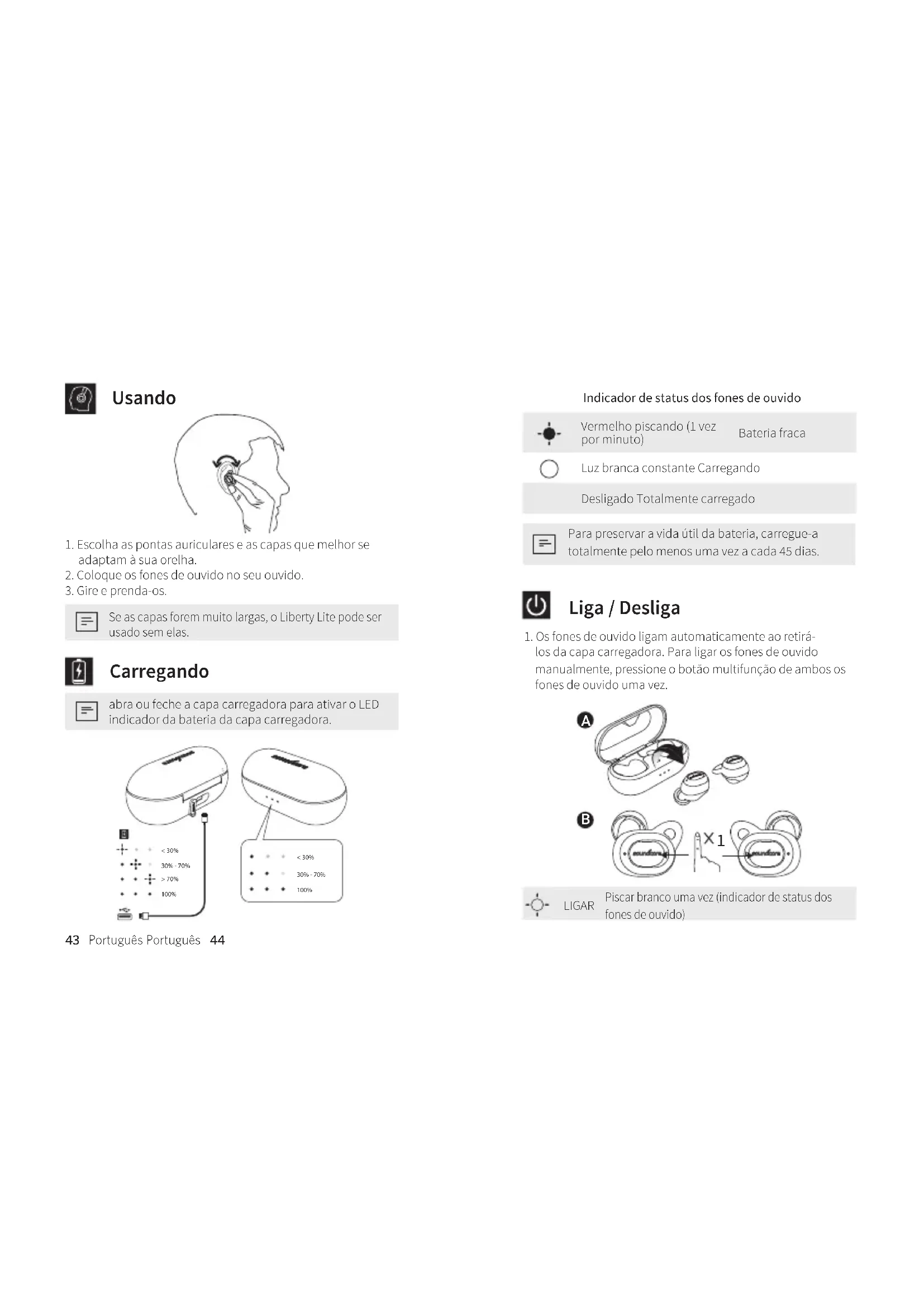 Se as capas forem muito largas, o Liberty Lite pode ser usado sem elas. Carregando abra ou feche a capa carregadora para ativar o LED indicador da bateria da capa carregadora. < 30% 30% - 70% > 70% 100% < 30%30% - 70% 100% Indicador de status dos fones de ouvido Vermelho piscando (1 vez por minuto) Bateria fraca Luz branca constante Carregando Desligado Totalmente carregado Para preservar a vida útil da bateria, carregue-a totalmente pelo menos uma vez a cada 45 dias. Liga / Desliga