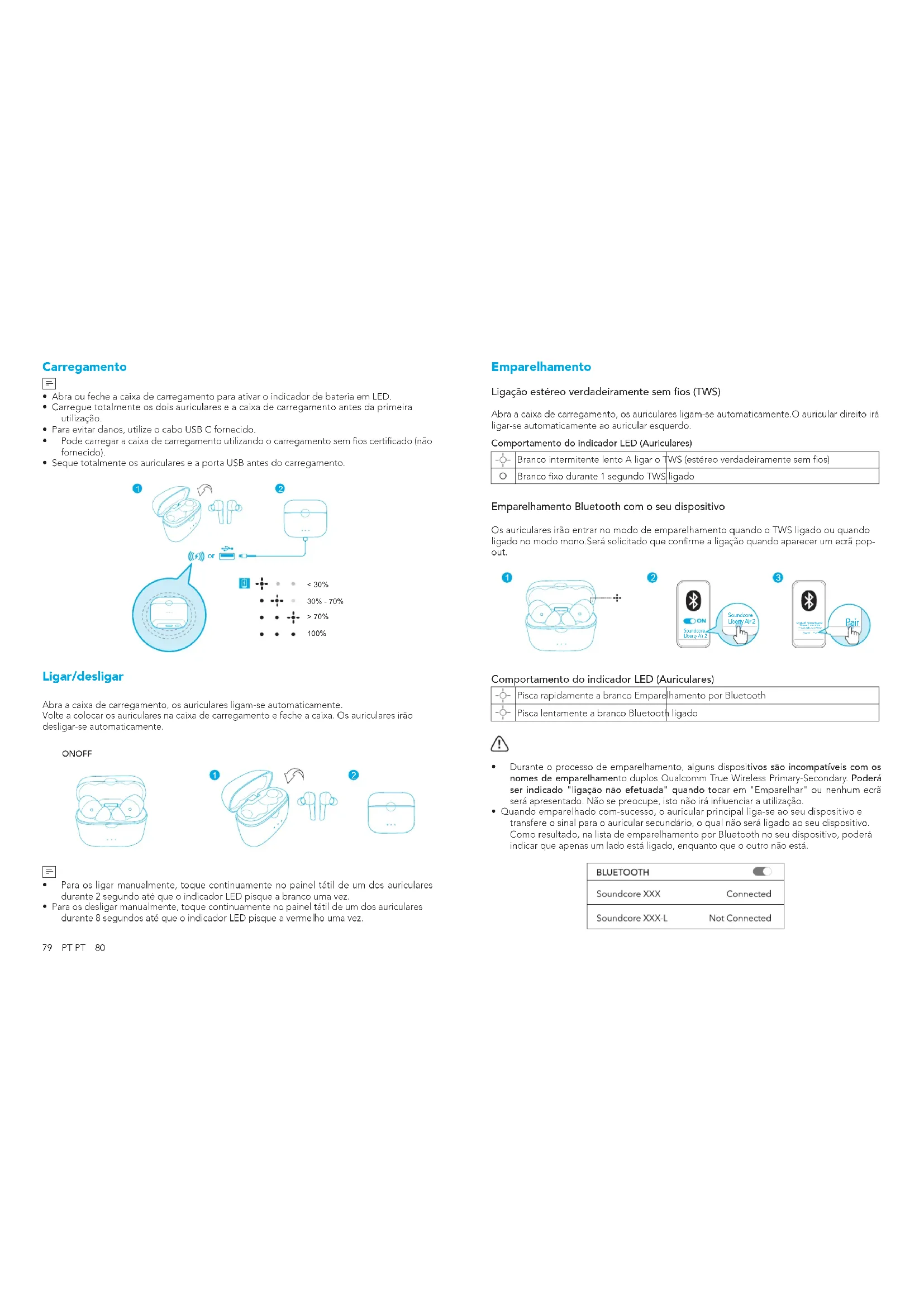 - Quando emparelhado com-sucesso, o auricular principal liga-se ao seu dispositivo e transfere o sinal para o auricular secundário, o qual não será ligado ao seu dispositivo. Como resultado, na lista de emparelhamento por Bluetooth no seu dispositivo, poderá indicar que apenas um lado está ligado, enquanto que o outro não está.81 PT PT 82 Para emparelhar com outro dispositivo Bluetooth, volte a colocar os auriculares na caixa de carregamento e certifique-se de que estão a ser carregados, mantenha a tampa aberta e, em seguida, prima continuamente o botão no fundo da caixa de carregamento durante 3 segundos até que os indicadores LED nos auriculares pisque rapidamente a branco.