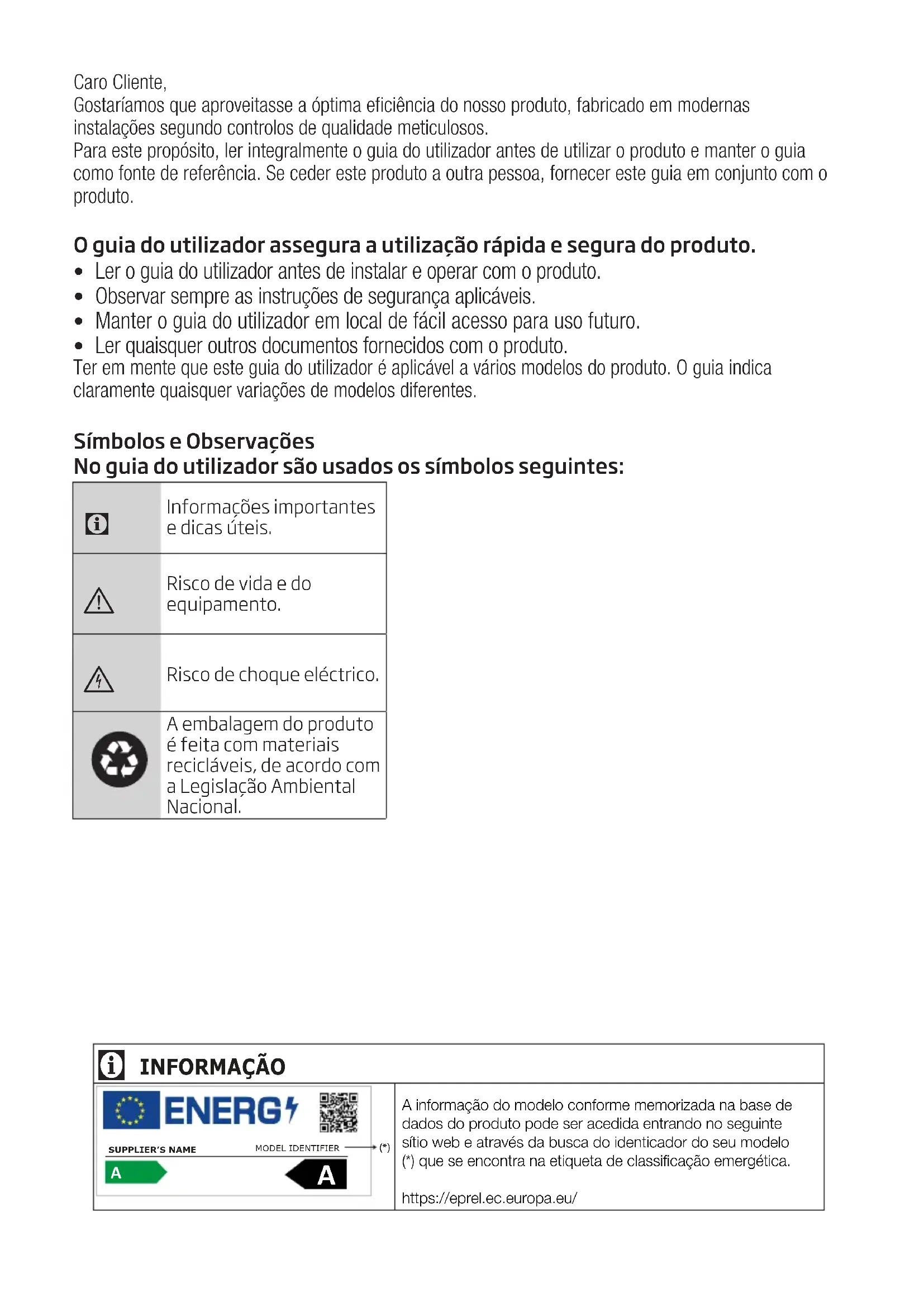 A informação do modelo conforme memorizada na base de dados do produto pode ser acedida entrando no seguinte sítio web e através da busca do identicador do seu modelo (*) que se encontra na etiqueta de classificação emergética.https://eprel.ec.europa.eu/