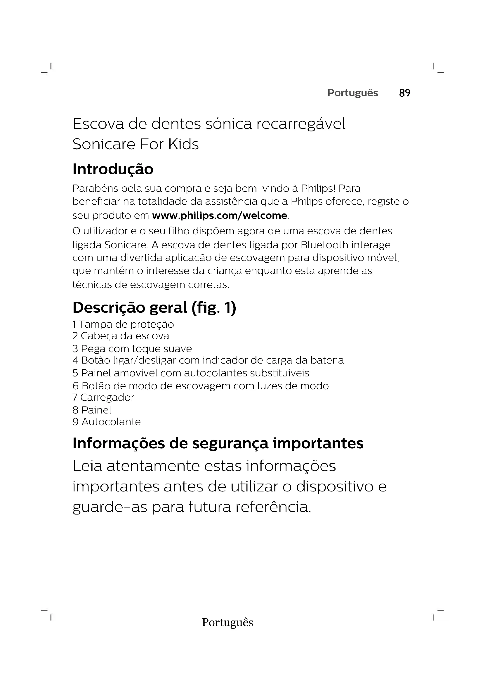 NederlandsPortuguês Escova de dentes sónica recarregável Sonicare For Kids Introdução Parabéns pela sua compra e seja bem-vindo à Philips! Para beneficiar na totalidade da assistência que a Philips oferece, registe o seu produto em www.philips.com/welcome. O utilizador e o seu filho dispõem agora de uma escova de dentes ligada Sonicare. A escova de dentes ligada por Bluetooth interage com uma divertida aplicação de escovagem para dispositivo móvel, que mantém o interesse da criança enquanto esta aprende as técnicas de escovagem corretas. Descrição geral (fig. 1) 1 Tampa de proteção 2 Cabeça da escova 3 Pega com toque suave 4 Botão ligar/desligar com indicador de carga da bateria 5 Painel amovível com autocolantes substituíveis 6 Botão de modo de escovagem com luzes de modo 7 Carregador 8 Painel 9 Autocolante Informações de segurança importantes Leia atentamente estas informações importantes antes de utilizar o dispositivo e guarde-as para futura referência.