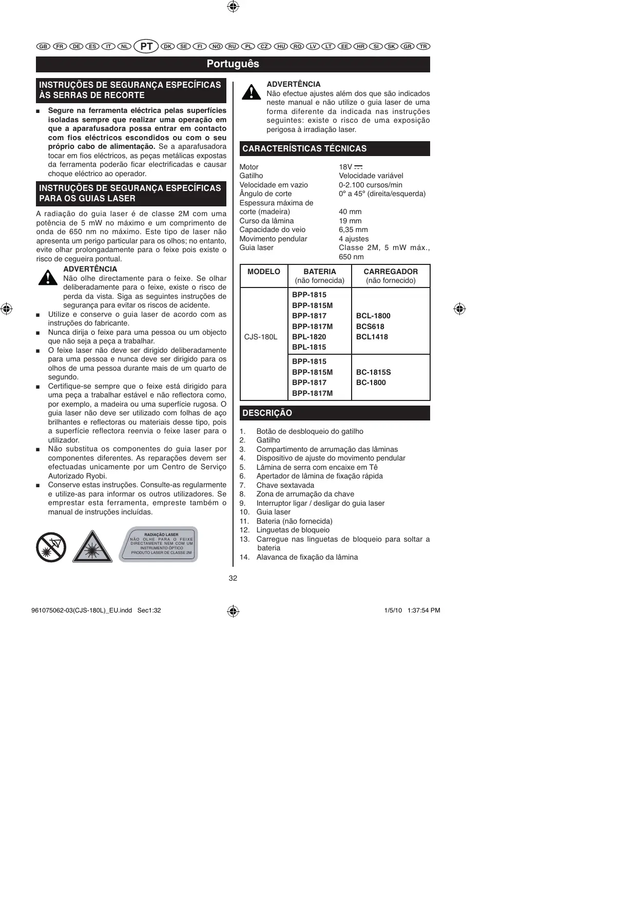 A radiação do guia laser é de classe 2M com uma potência de 5 mW no máximo e um comprimento de onda de 650 nm no máximo. Este tipo de laser não apresenta um perigo particular para os olhos; no entanto, evite olhar prolongadamente para o feixe pois existe o risco de cegueira pontual. ADVERTÊNCIA Não olhe directamente para o feixe. Se olhar deliberadamente para o feixe, existe o risco de perda da vista. Siga as seguintes instruções de segurança para evitar os riscos de acidente. Utilize e conserve o guia laser de acordo com as instruções do fabricante. Nunca dirija o feixe para uma pessoa ou um objecto que não seja a peça a trabalhar. O feixe laser não deve ser dirigido deliberadamente para uma pessoa e nunca deve ser dirigido para os olhos de uma pessoa durante mais de um quarto de segundo. Certifique-se sempre que o feixe está dirigido para uma peça a trabalhar estável e não reflectora como, por exemplo, a madeira ou uma superfície rugosa. O guia laser não deve ser utilizado com folhas de aço brilhantes e reflectoras ou materiais desse tipo, pois a superfície reflectora reenvia o feixe laser para o utilizador. Não substitua os componentes do guia laser por componentes diferentes. As reparações devem ser efectuadas unicamente por um Centro de Serviço Autorizado Ryobi. Conserve estas instruções. Consulte-as regularmente e utilize-as para informar os outros utilizadores. Se emprestar esta ferramenta, empreste também o manual de instruções incluídas. MODELO CJS-180L 18V Velocidade variável 0-2.100 cursos/min 0º a 45º (direita/esquerda) 40 mm 19 mm 6,35 mm 4 ajustes Classe 2M, 5 mW máx., 650 nm BATERIA (não fornecida) BPP-1815 BPP-1815M BPP-1817 BPP-1817M BPL-1820 BPL-1815 BPP-1815 BPP-1815M BPP-1817 BPP-1817M CARREGADOR (não fornecido) BCL-1800 BCS618 BCL1418 BC-1815S BC-1800 DESCRIÇÃO
