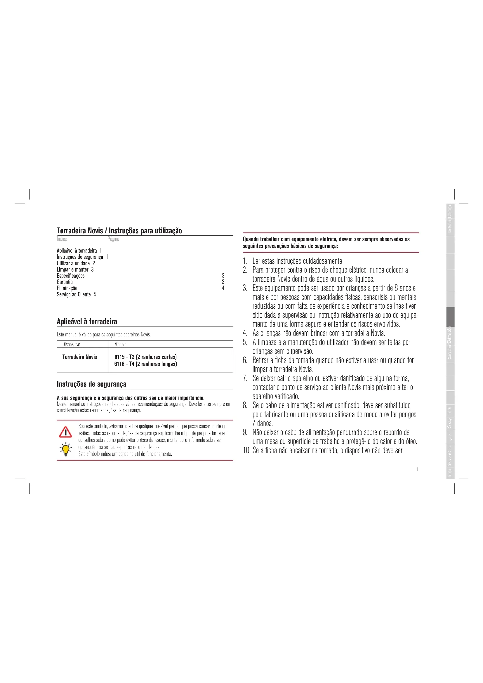 Torradeira Novis / Instruções para utilização Índice Página Aplicável à torradeira 1 Instruções de segurança 1 Utilizar a unidade 2 Limpar e manter 3 Especificações 3 Garantia 3 Eliminação 4 Serviço ao Cliente 4 Aplicável à torradeira Este manual é válido para os seguintes aparelhos Novis: Dispositivo Modelo Torradeira Novis 6115 - T2 (2 ranhuras curtas) 6116 - T4 (2 ranhuras longas) Instruções de segurança A sua segurança e a segurança dos outros são da maior importância. Neste manual de instruções são listadas várias recomendações de segurança. Deve ler e ter sempre em consideração estas recomendações de segurança. Sob este símbolo, avisamo-lo sobre qualquer possível perigo que possa causar morte ou lesões. Todas as recomendações de segurança explicam-lhe o tipo de perigo e fornecem conselhos sobre como pode evitar o risco de lesões, mantendo-o informado sobre as consequências se não seguir as recomendações. Este símbolo indica um conselho útil de funcionamento. Quando trabalhar com equipamento elétrico, devem ser sempre observadas as seguintes precauções básicas de segurança: