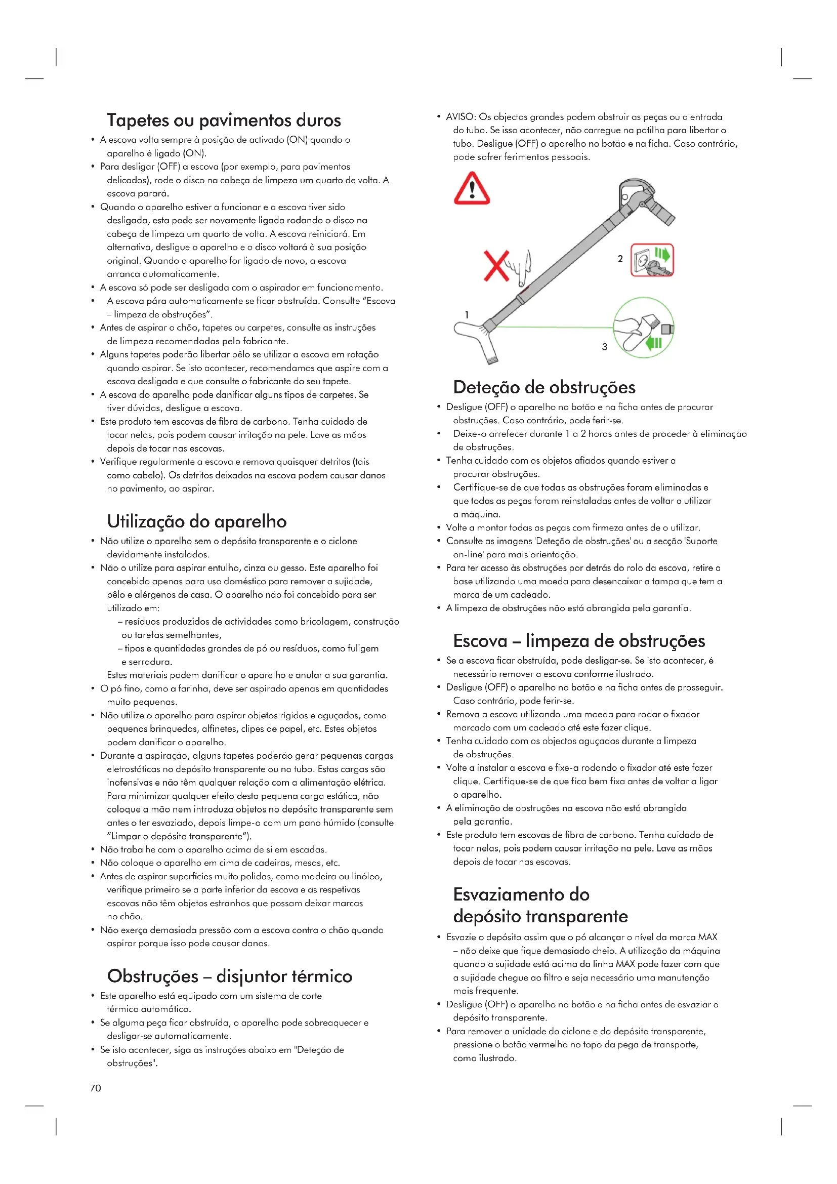 - Não exerça demasiada pressão com a escova contra o chão quando aspirar porque isso pode causar danos. Obstruções –disjuntor térmico