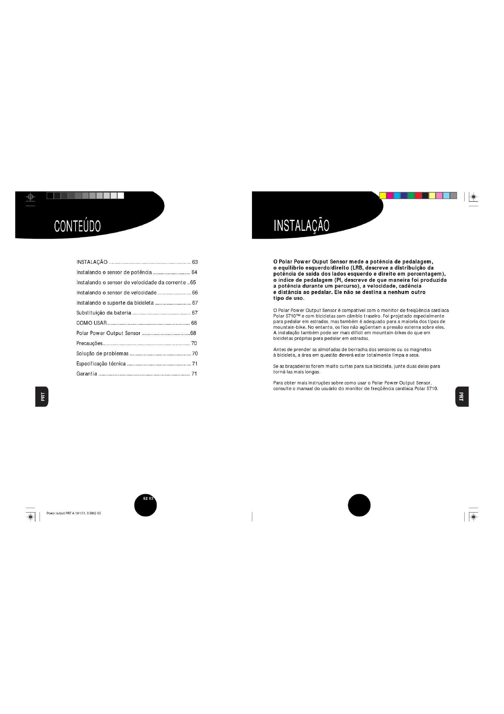- Se non vengono visualizzati i valori di cadenza di pedalata, verificare la posizione del sensore di potenza rispetto al magnete installato sulla pedivella. Power.output.ITA A 22/1/01, 14:3960-6162 63 PRT PRT INSTALAÇÃO CONTEÚDO INSTALAÇÃO .......................................................... 63 Instalando o sensor de potência .......................... 64 Instalando o sensor de velocidade da corrente ..65 Instalando o sensor de velocidade ....................... 66 Instalando o suporte da bicicleta ......................... 67 Substituição da bateria ......................................... 67 COMO USAR........................................................... 68 Polar Power Output Sensor ..................................68 Precauções.............................................................. 70 Solução de problemas ........................................... 70 Especificação técnica ............................................. 71 Garantia ................................................................. 71 O Polar Power Ouput Sensor mede a potência de pedalagem, o equilíbrio esquerdo/direito (LRB, descreve a distribuição da potência de saída dos lados esquerdo e direito em porcentagem), o índice de pedalagem (PI, descreve de que maneira foi produzida a potência durante um percurso), a velocidade, cadência e distância ao pedalar. Ele não se destina a nenhum outro tipo de uso. O Polar Power Output Sensor é compatível com o monitor de freqüência cardíaca Polar S710™ e com bicicletas com câmbio traseiro. Foi projetado especialmente para pedalar em estradas, mas também é adequado para a maioria dos tipos de mountain-bike. No entanto, os fios não agüentam a pressão externa sobre eles. A instalação também pode ser mais difícil em mountain-bikes do que em bicicletas próprias para pedalar em estradas. Antes de prender as almofadas de borracha dos sensores ou os magnetos à bicicleta, a área em questão deverá estar totalmente limpa e seca. Se as braçadeiras forem muito curtas para sua bicicleta, junte duas delas para torná-las mais longas. Para obter mais instruções sobre como usar o Polar Power Output Sensor, consulte o manual do usuário do monitor de freqüência cardíaca Polar S710. Power.output.PRT A 19/1/01, 9:5962-6364 65 PRT PRT Instalando o sensor de potência III Instalando o sensor de velocidade da corrente Observação: Há dois tipos de braçadeiras incluídas no pacote. Use as braçadeiras mais largas para a instalação do sensor de potência.