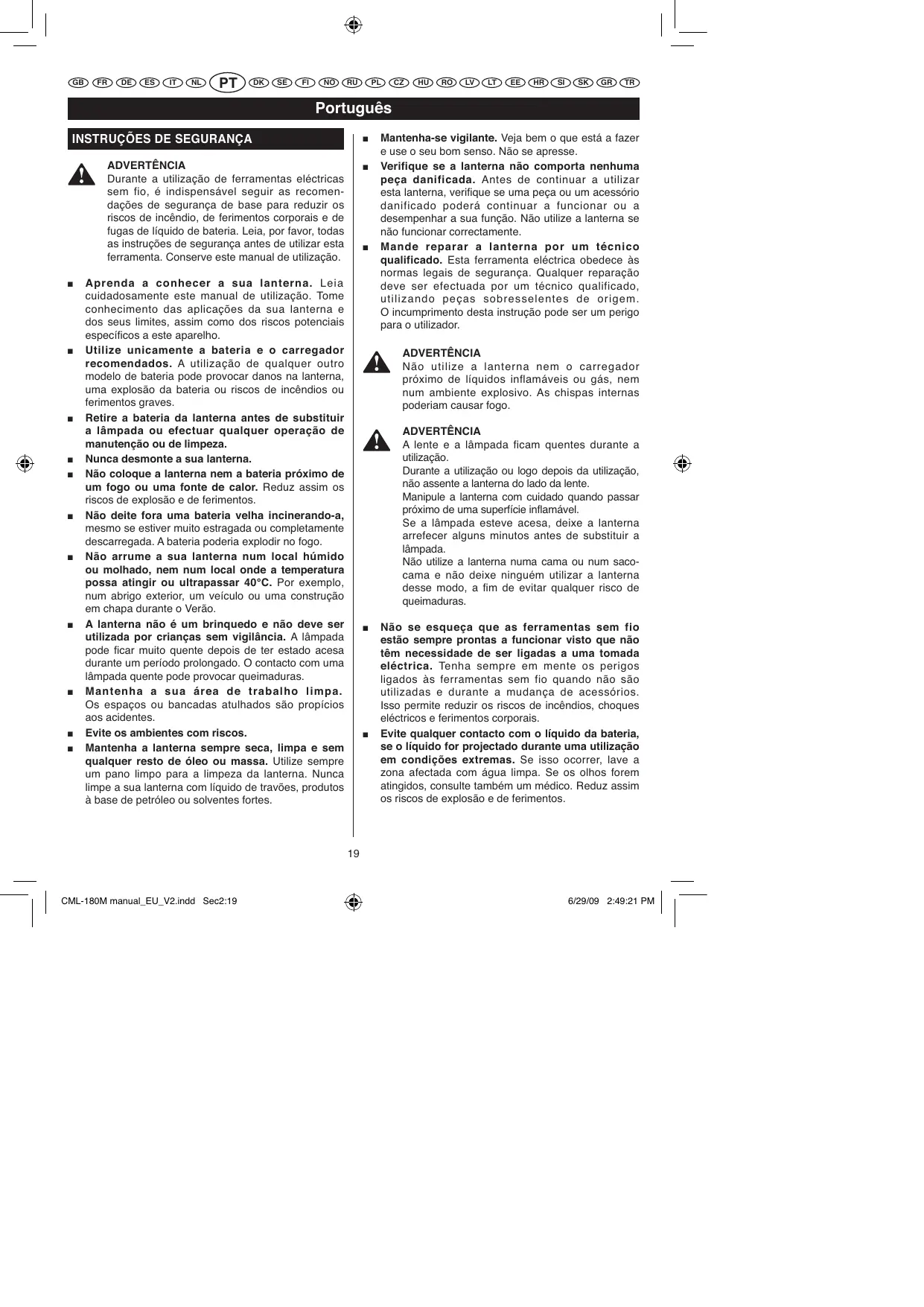 A lanterna não é um brinquedo e não pode ser utilizes por crianças sem vigilência. A lampada pode fazer muito quando(depíos de ter estado acesa durante um periodo prolongado. Ocontacto com uma lampada quente pode provocar queimaduras. - Mantenha suaarea de travailho limpa. Os espacos ou bancadas atulhados são propicios aos acidentes.