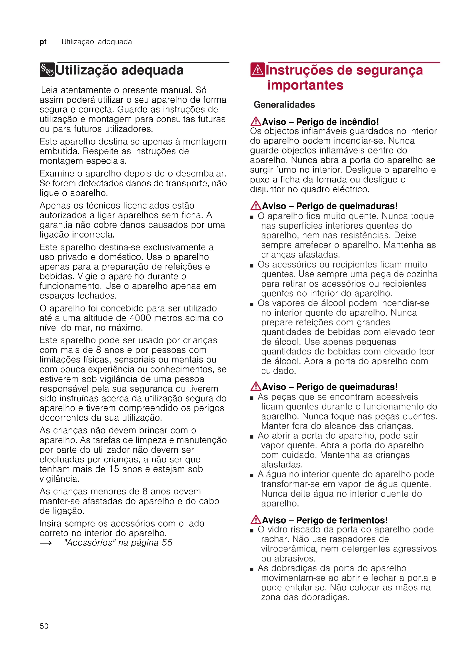8Utilização adequada Ut i l i z a ç ã o adequada Leia atentamente o presente manual. Só assim poderá utilizar o seu aparelho de forma segura e correcta. Guarde as instruções de utilização e montagem para consultas futuras ou para futuros utilizadores. Este aparelho destina-se apenas à montagem embutida. Respeite as instruções de montagem especiais. Examine o aparelho depois de o desembalar. Se forem detectados danos de transporte, não ligue o aparelho. Apenas os técnicos licenciados estão autorizados a ligar aparelhos sem ficha. A garantia não cobre danos causados por uma ligação incorrecta. Este aparelho destina-se exclusivamente a uso privado e doméstico. Use o aparelho apenas para a preparação de refeições e bebidas. Vigie o aparelho durante o funcionamento. Use o aparelho apenas em espaços fechados. O aparelho foi concebido para ser utilizado até a uma altitude de 4000 metros acima do nível do mar, no máximo. Este aparelho pode ser usado por crianças com mais de 8 anos e por pessoas com limitações físicas, sensoriais ou mentais ou com pouca experiência ou conhecimentos, se estiverem sob vigilância de uma pessoa responsável pela sua segurança ou tiverem sido instruídas acerca da utilização segura do aparelho e tiverem compreendido os perigos decorrentes da sua utilização. As crianças não devem brincar com o aparelho. As tarefas de limpeza e manutenção por parte do utilizador não devem ser efectuadas por crianças, a não ser que tenham mais de 15 anos e estejam sob vigilância. As crianças menores de 8 anos devem manter-se afastadas do aparelho e do cabo de ligação. Insira sempre os acessórios com o lado correto no interior do aparelho. ~ "Acessórios" na página 55 (Instruções de segurança importantes Instruções de segur ança impor t an t e s Generalidades :Aviso – Perigo de incêndio! Os objectos inflamáveis guardados no interior do aparelho podem incendiar-se. Nunca guarde objectos inflamáveis dentro do aparelho. Nunca abra a porta do aparelho se surgir fumo no interior. Desligue o aparelho e puxe a ficha da tomada ou desligue o disjuntor no quadro eléctrico. :Aviso – Perigo de queimaduras! ■ O aparelho fica muito quente. Nunca toque nas superfícies interiores quentes do aparelho, nem nas resistências. Deixe sempre arrefecer o aparelho. Mantenha as crianças afastadas. Perigo de queimaduras! ■ Os acessórios ou recipientes ficam muito quentes. Use sempre uma pega de cozinha para retirar os acessórios ou recipientes quentes do interior do aparelho. Perigo de queimaduras! ■ Os vapores de álcool podem incendiar-se no interior quente do aparelho. Nunca prepare refeições com grandes quantidades de bebidas com elevado teor de álcool. Use apenas pequenas quantidades de bebidas com elevado teor de álcool. Abra a porta do aparelho com cuidado. :Aviso – Perigo de queimaduras! ■ As peças que se encontram acessíveis ficam quentes durante o funcionamento do aparelho. Nunca toque nas peças quentes. Manter fora do alcance das crianças. Perigo de queimaduras! ■ Ao abrir a porta do aparelho, pode sair vapor quente. Abra a porta do aparelho com cuidado. Mantenha as crianças afastadas. Perigo de queimaduras! ■ A água no interior quente do aparelho pode transformar-se em vapor de água quente. Nunca deite água no interior quente do aparelho. :Aviso – Perigo de ferimentos! ■ O vidro riscado da porta do aparelho pode rachar. Não use raspadores de vitrocerâmica, nem detergentes agressivos ou abrasivos. Perigo de ferimentos! ■ As dobradiças da porta do aparelho movimentam-se ao abrir e fechar a porta e pode entalar-se. Não colocar as mãos na zona das dobradiças.Instruções de segurança importantes pt