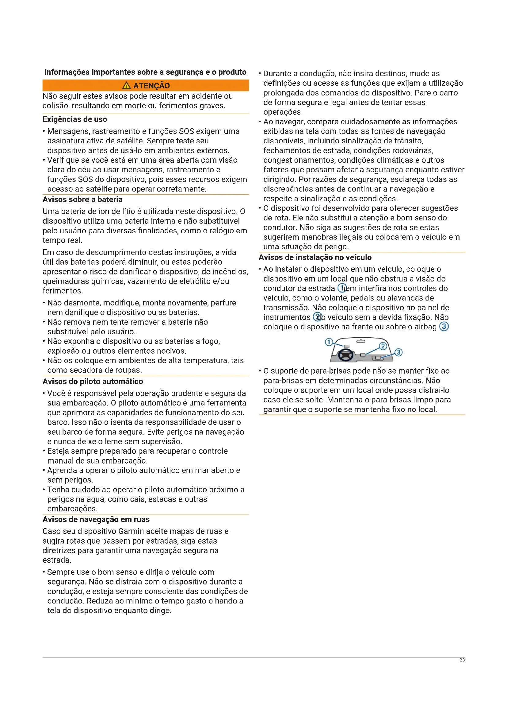 - O dispositivo foi desenvolvido para oferecer sugestões de rota. Ele não substitui a atenção e bom senso do condutor. Não siga as sugestões de rota se estas sugerirem manobras ilegais ou colocarem o veículo em uma situação de perigo. Avisos de instalação no veículo