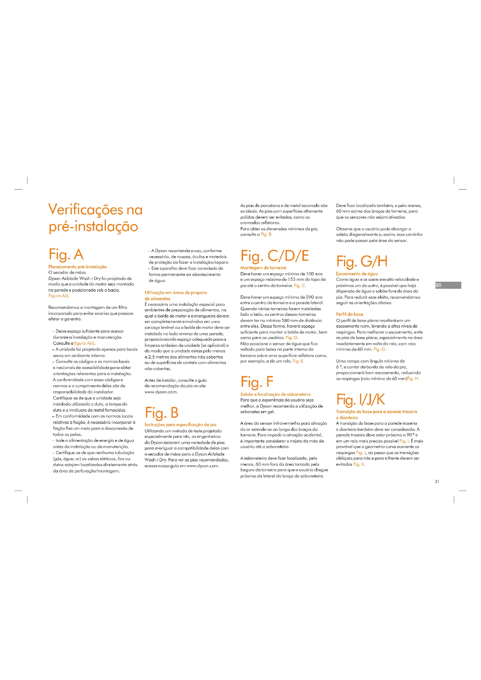 Verificações na pré-instalação Fig. A Planejamento pré-instalação O secador de mãos DysonAirbladeWash+Dry foi projetado de modo que a unidade do motor seja montada na parede e posicionada sob a bacia. FiguraA(i). Recomendamos a montagem de um filtro incorporado para evitar avarias que possam afetar a garantia. – Deixe espaço suficiente para acesso durante a instalação e manutenção. Consulte a figuraA(ii). – A unidade foi projetada apenas para locais secos em ambiente interno. – Consulte os códigos e as normas locais e nacionais de acessibilidade para obter orientações relevantes para a instalação. A conformidade com esses códigos e normas e o cumprimento deles são de responsabilidade do instalador. Certifique-se de que a unidade seja instalada utilizando o duto, a tampa do duto e o invólucro de metal fornecidos. – Em conformidade com as normas locais relativas à fiação, é necessário incorporar à fiação fixa um meio para a desconexão de todos os polos. – Isole a alimentação de energia e de água antes da instalação ou da manutenção. – Certifique-se de que nenhuma tubulação (gás, água, ar) ou cabos elétricos, fios ou dutos estejam localizados diretamente atrás da área de perfuração/montagem. – A Dyson recomenda o uso, conforme necessário, de roupas, óculos e materiais de proteção ao fazer a instalação/reparo. – Este aparelho deve ficar conectado de forma permanente ao abastecimento de água. Utilização em áreas de preparo de alimentos É necessária uma instalação especial para ambientes de preparação de alimentos, na qual o balde de motor e a mangueira devem ser completamente envolvidos em uma carcaça lavável ou o balde de motor deve ser instalado no lado reverso de uma parede, proporcionando espaço adequado para a limpeza embaixo da unidade (se aplicável) e de modo que a unidade esteja pelo menos a 2,5 metros dos alimentos não cobertos ou de superfícies de contato com alimentos não cobertas. Antes de instalar, consulte o guia de recomendação da pia no site www.dyson.com. Fig. B Instruções para especificação da pia Utilizando um método de teste projetado especialmente para isto, os engenheiros da Dyson testaram uma variedade de pias para averiguar a compatibilidade delas com o secador de mãos para a Dyson Airblade Wash+Dry. Para ver as pias recomendadas, acesse nosso guia em www.dyson.com. As pias de porcelana e de metal escovado são as ideais. As pias com superfícies altamente polidas devem ser evitadas, como as cromadas refletoras. Para obter as dimensões mínimas da pia, consulte a Fig. B. Fig. C/D/E Montagem da torneira Deve haver um espaço mínimo de 100 mm e um espaço máximo de 155 mm do topo da pia até o centro da torneira. Fig. C. Deve haver um espaço mínimo de 290 mm entre o centro da torneira e a parede lateral. Quando várias torneiras forem instaladas lado a lado, os centros dessas torneiras devem ter no mínimo 580 mm de distância entre eles. Dessa forma, haverá espaço suficiente para montar o balde de motor, bem como para os usuários. Fig. D. Não posicione o sensor de água que fica voltado para baixo na parte interna da torneira sobre uma superfície refletora como, por exemplo, a de um ralo. Fig. E. Fig. F Sabão e localização da saboneteira Para que a experiência do usuário seja melhor, a Dyson recomenda a utilização de sabonetes em gel. A área do sensor infravermelho para ativação do ar estende-se ao longo dos braços da torneira. Para impedir a ativação acidental, é importante considerar o trajeto da mão do usuário até a saboneteira. A saboneteira deve ficar localizada, pelo menos, 60 mm fora da área tomada pela largura da torneira para que o usuário chegue próximo da lateral do braço da saboneteira. Deve ficar localizada também, e pelo menos, 60 mm acima dos braços da torneira, para que os sensores não sejam ativados. Observe que o usuário pode alcançar o sabão diagonalmente e, assim, esse caminho não pode passar pela área do sensor. Fig. G/H Escoamento de água Como água e ar saem em alta velocidade e próximos um do outro, é possível que haja dispersão de água e sabão fora da área da pia. Para reduzir esse efeito, recomendamos seguir as orientações abaixo. Perfil da base O perfil de base plana resultará em um escoamento ruim, levando a altos níveis de respingos. Para melhorar o escoamento, evite as pias de base plana, especialmente na área imediatamente em volta do ralo, com raio mínimo de 60 mm. Fig. G. Uma rampa com ângulo mínimo de 6 º, a contar da borda do ralo da pia, proporcionará bom escoamento, reduzindo os respingos (raio mínimo de 60 mm)Fig. H. Fig. I/J/K Transição da base para a parede traseira e dianteira A transição da base para a parede traseira e dianteira também deve ser considerada. A parede traseira deve estar próxima a 90 º e em um raio mais preciso possível Fig. I. É mais provável que a geometria curva aumente os respingos Fig. J, ao passo que as transições oblíquas para trás e para a frente devem ser evitadas Fig. K.32