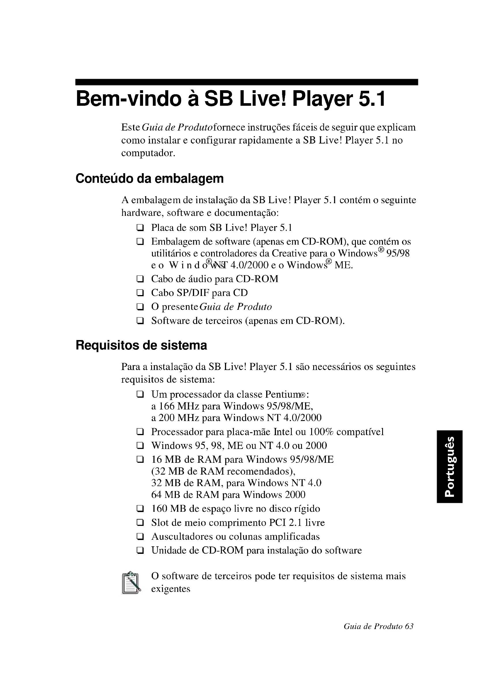 Se precisar de informações mais detalhadas sobre a instalação e utilização da placa SB Live! Player 5.1, consulte o Guia de Utilizador da SB Live! Player 5.1, no CD de instalação. Em Windows 95/98/NT 4.0, 2000 e ME, clique duas vezes no ficheiro .exe em D:\MANUALS\PORT\ O Acrobat Reader 4.05 já está instalado. Faça clique duas vezes sobre o ícone e seleccione Ficheiro