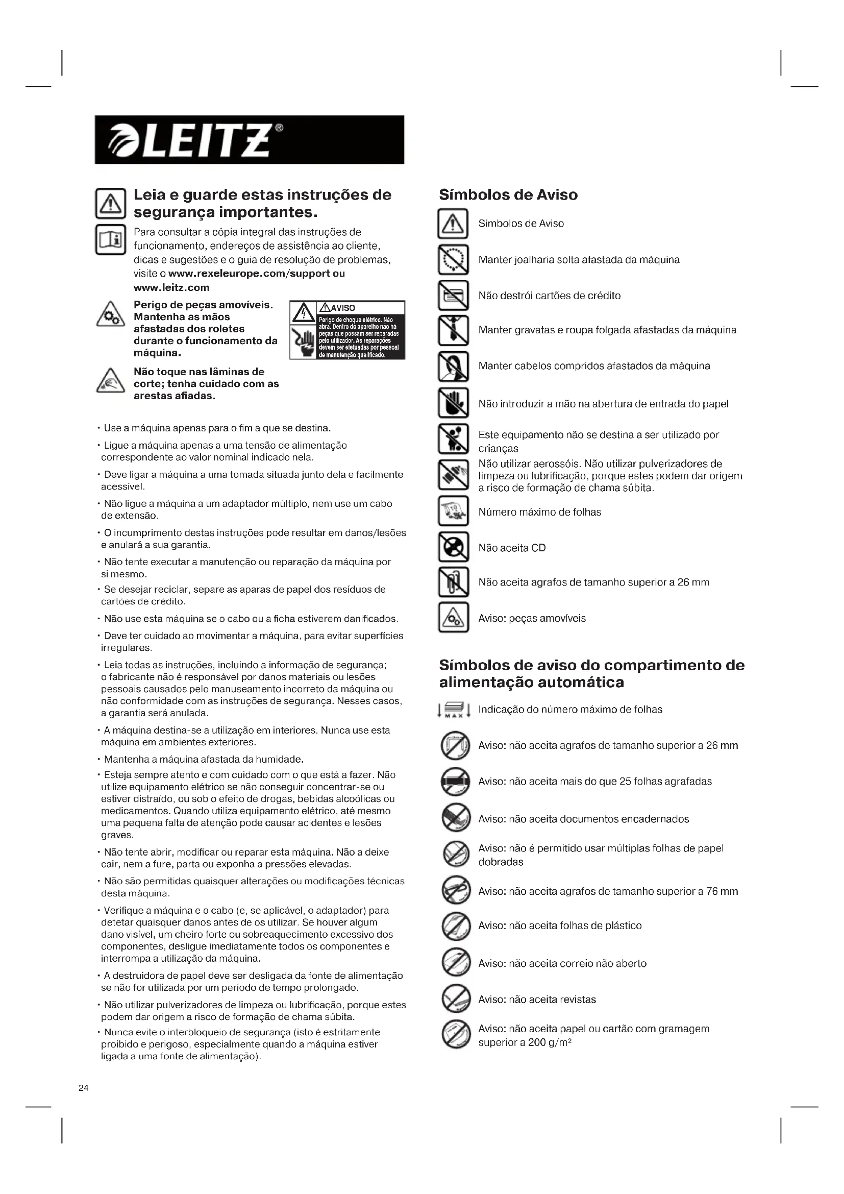 - Nunca evite o interbloqueio de segurança (isto é estritamente proibido e perigoso, especialmente quando a máquina estiver ligada a uma fonte de alimentação). Leia e guarde estas instruções de segurança importantes. Para consultar a cópia integral das instruções de funcionamento, endereços de assistência ao cliente, dicas e sugestões e o guia de resolução de problemas, visite o www.rexeleurope.com/support ou www.leitz.com Manter joalharia solta afastada da máquina Símbolos de Aviso Símbolos de Aviso Não toque nas lâminas de corte; tenha cuidado com as arestas afiadas. Perigo de peças amovíveis. Mantenha as mãos afastadas dos roletes durante o funcionamento da máquina. Aviso: não aceita agrafos de tamanho superior a 26 mm Aviso: não aceita documentos encadernados Aviso: não aceita mais do que 25 folhas agrafadas Símbolos de aviso do compartimento de alimentação automática Aviso: não é permitido usar múltiplas folhas de papel dobradas Aviso: não aceita agrafos de tamanho superior a 76 mm Indicação do número máximo de folhas Aviso: não aceita revistas Aviso: não aceita papel ou cartão com gramagem superior a 200 g/m² Aviso: não aceita folhas de plástico Aviso: não aceita correio não aberto Manter gravatas e roupa folgada afastadas da máquina Manter cabelos compridos afastados da máquina Não introduzir a mão na abertura de entrada do papel Número máximo de folhas Não aceita CD Não aceita agrafos de tamanho superior a 26 mm Aviso: peças amovíveis Este equipamento não se destina a ser utilizado por crianças Não utilizar aerossóis. Não utilizar pulverizadores de limpeza ou lubrificação, porque estes podem dar origem a risco de formação de chama súbita. Não destrói cartões de crédito2525252525 Capacidade de Corte CONSEGUE cortar o seguinte: