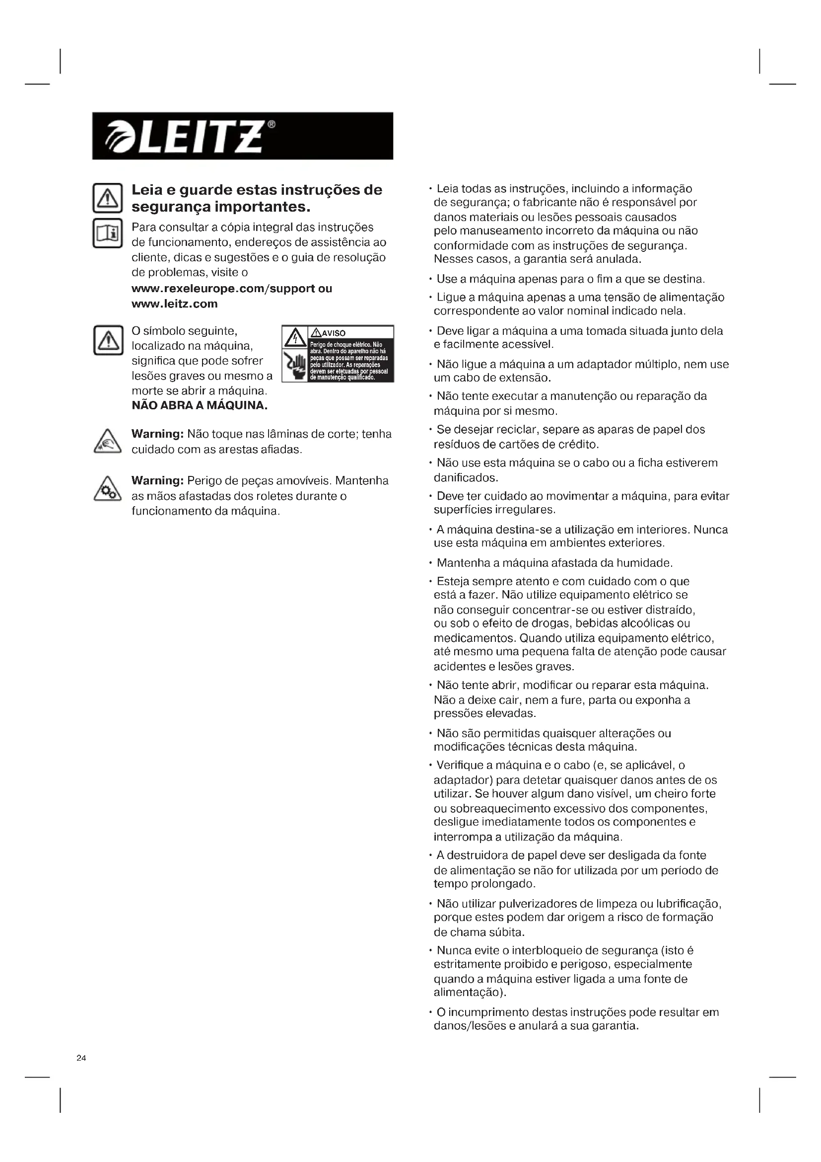 - O incumprimento destas instruções pode resultar em danos/lesões e anulará a sua garantia. Leia e guarde estas instruções de segurança importantes. Para consultar a cópia integral das instruções de funcionamento, endereços de assistência ao cliente, dicas e sugestões e o guia de resolução de problemas, visite o www.rexeleurope.com/support ou www.leitz.com