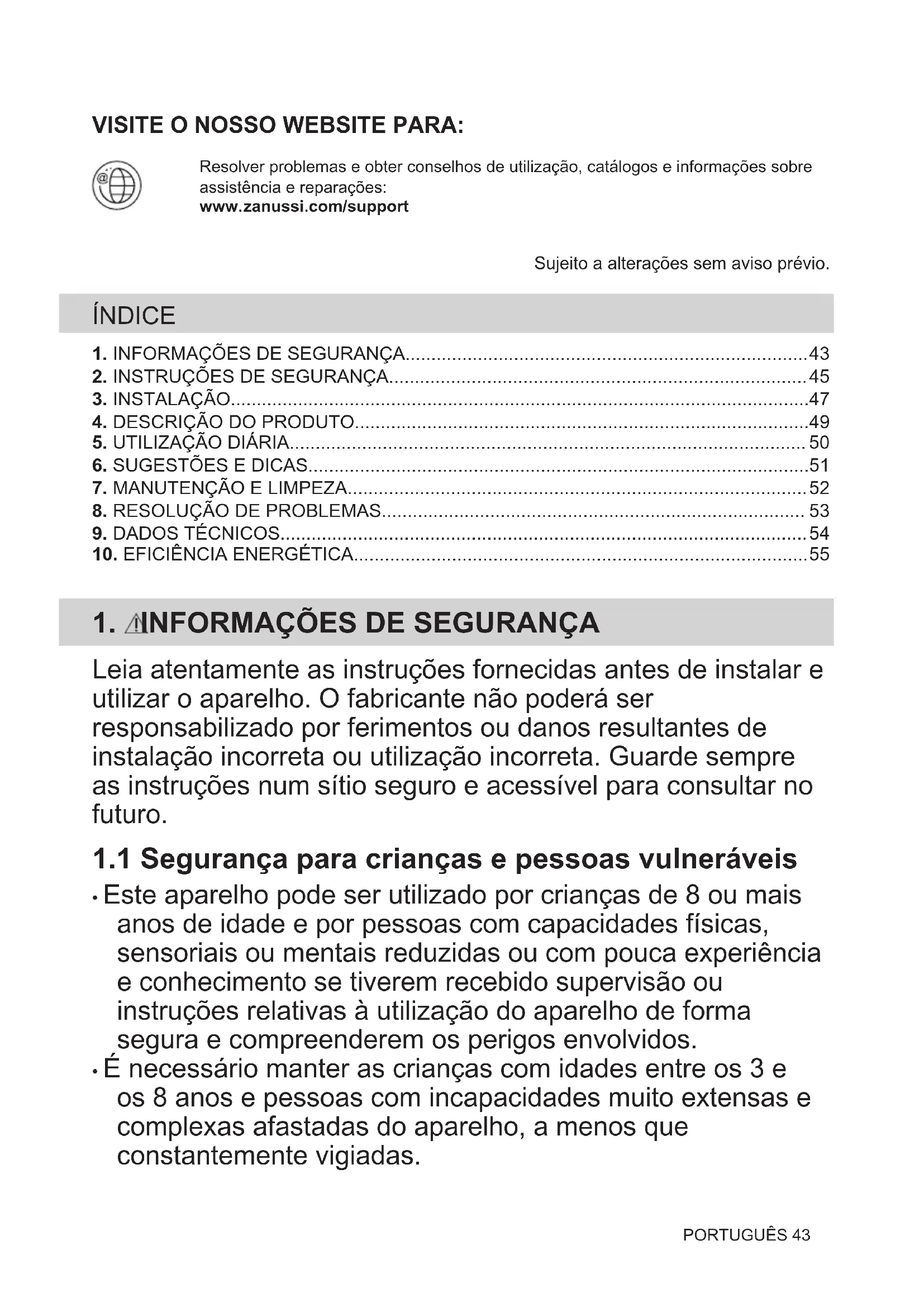 Recicle os materiais que apresentem o símbolo . Coloque a embalagem nos contentores indicados para reciclagem. Ajude a proteger o ambiente e a saúde pública através da reciclagem dos aparelhos eléctricos e electrónicos. Não elimine os aparelhos que tenham o símbolo juntamente com os resíduos domésticos. Coloque o produto num ponto de recolha para reciclagem local ou contacte as suas autoridades municipais. PORTUGUÊS 55VISITE NUESTRO SITIO WEB PARA: Obtener consejos, folletos, soluciones a problemas e información de servicio yreparación:www.zanussi.com/supportSalvo modificaciones. CONTENIDO