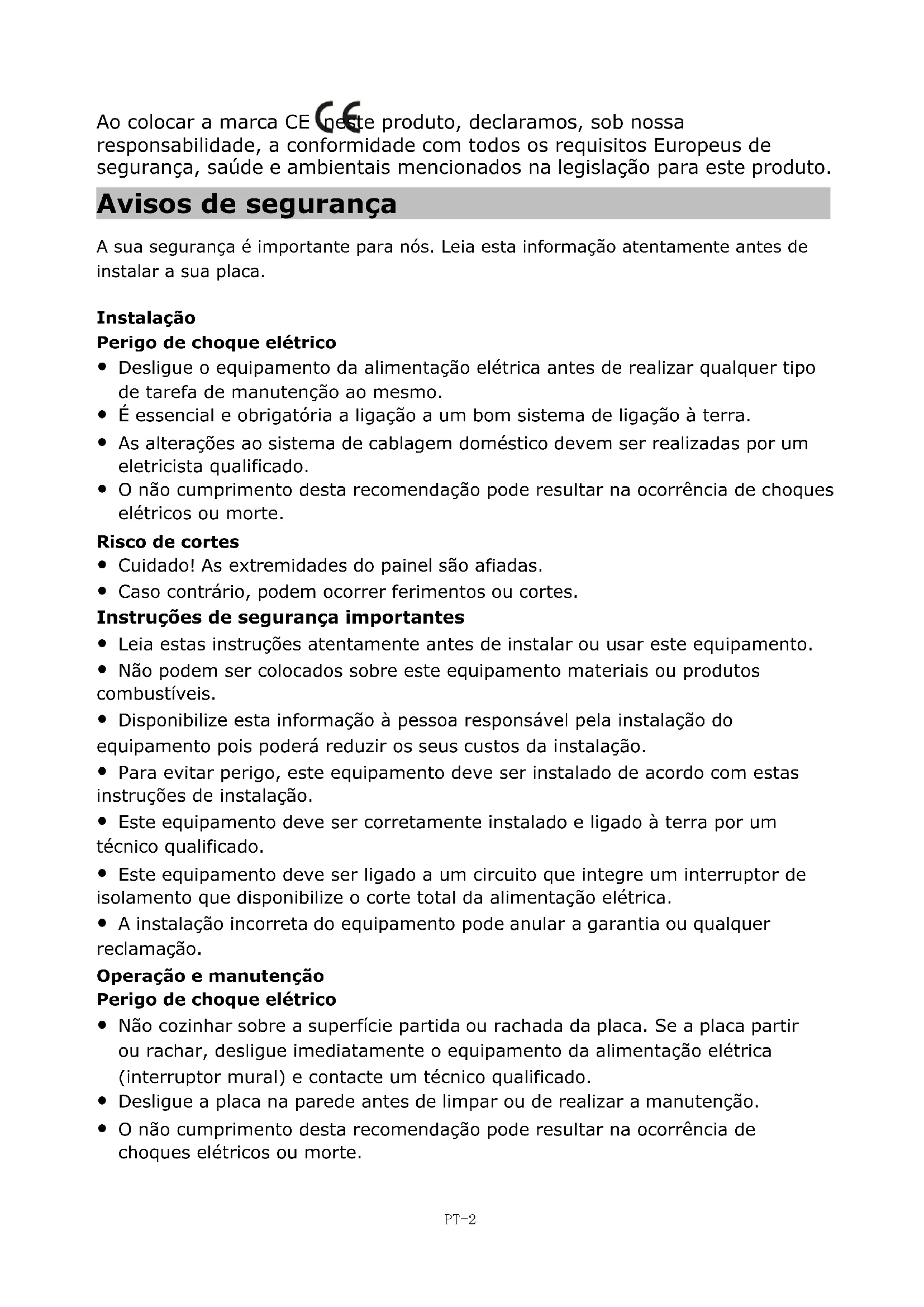 Ao colocar a marca CE neste produto, declaramos, sob nossa responsabilidade, a conformidade com todos os requisitos Europeus de segurança, saúde e ambientais mencionados na legislação para este produto. Avisos de segurança A sua segurança é importante para nós. Leia esta informação atentamente antes de instalar a sua placa. Instalação Perigo de choque elétrico