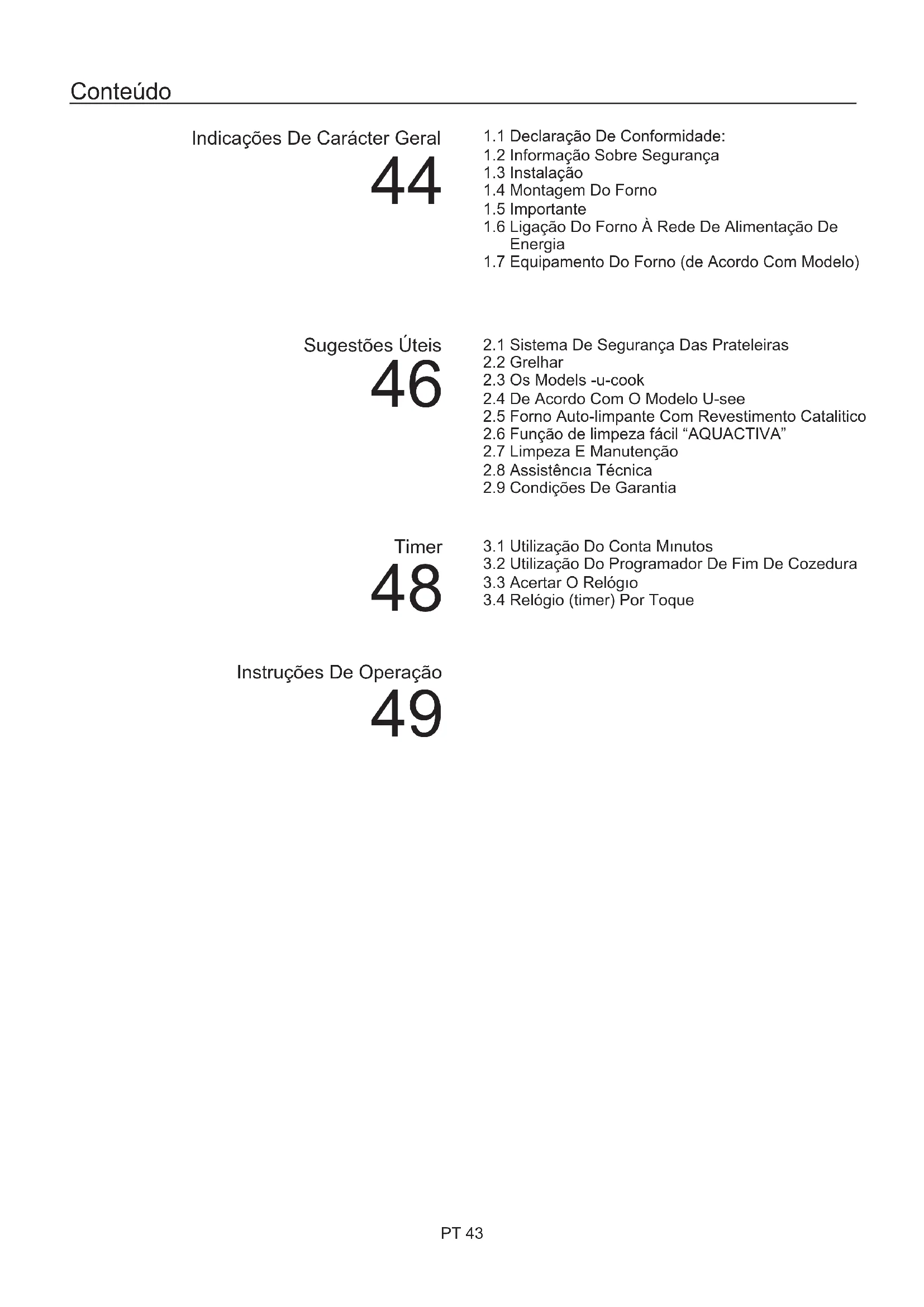 Obrigado por ter optado por um dos nossos produtos. Para tirar o maior proveito possível do seu forno, recomendamos que: Leia atentamente este manual de instruções de utilização; ele contém instruções importantes sobre a instalação, a utilização e a manutenção seguras deste forno. Mantenha este manual de instruções à mão, num local seguro, para o poder consultar sempre que necessário. Quando o forno for ligado pela primeira vez, ele poderá emitir fumo com um cheiro acre. Isto fica a dever-se ao facto de o agente aglutinante dos painéis de isolamento existentes à volta do forno ter sido aquecido pela primeira vez. Trata-se de um facto absolutamente normal; se ele ocorrer, terá apenas de esperar que o fumo se dissipe antes de introduzir os alimentos no forno. Devido à sua natureza, um forno aquece muito, em especial a sua porta de vidro. PT 44