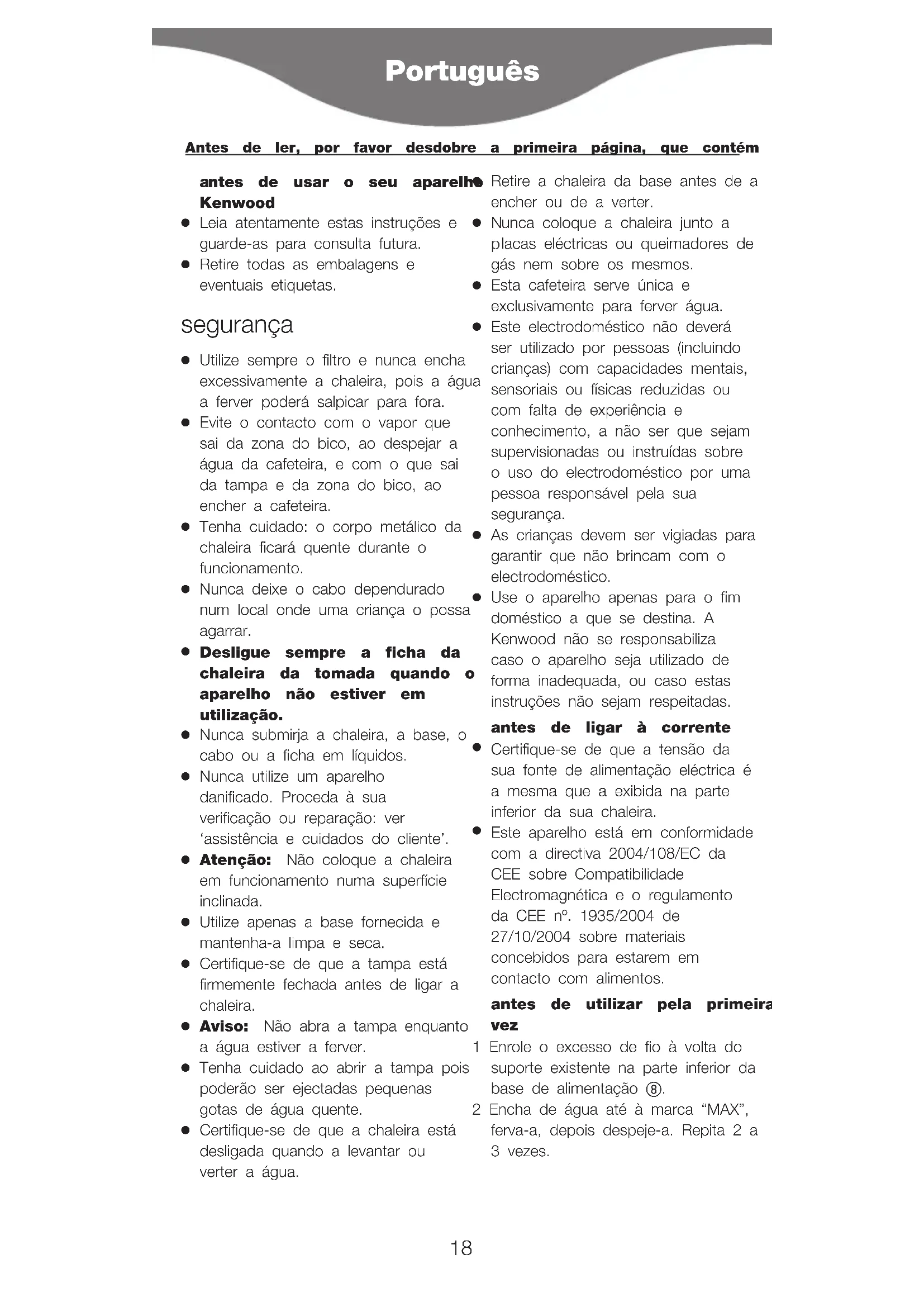 Use o aparelho apenas para o fim doméstico a que se destina. A Kenwood não se responsabiliza caso o aparelho seja utilizado de forma inadequada, ou caso estas instruções não sejam respeitadas. antes de ligar à corrente